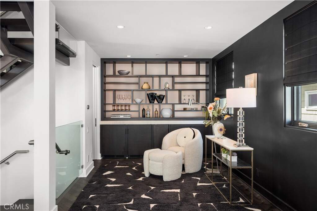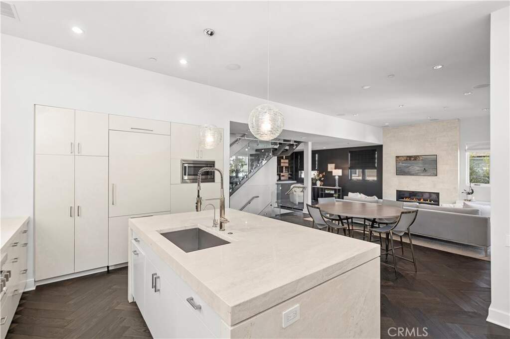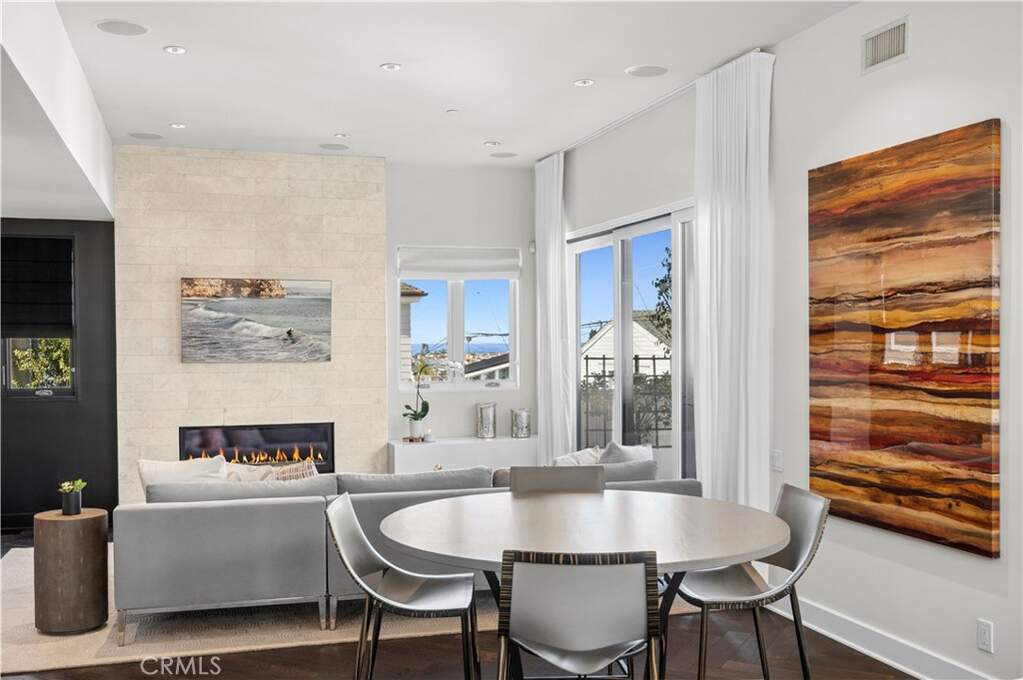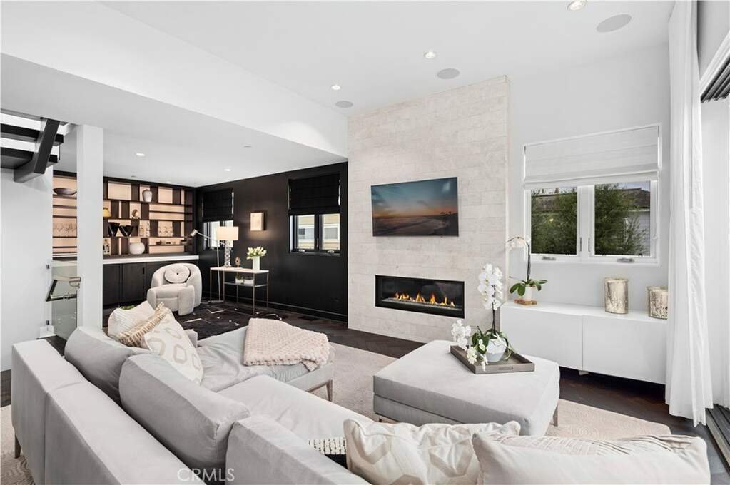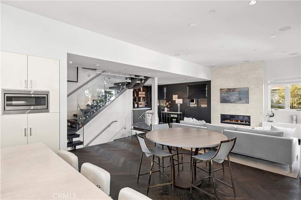 In the coveted Flower Streets, this custom 3-bedroom, 3.5-bath, fully furnished, residence crowns an idyllic 45-foot-wide corner lot with sweeping views of the Pacific Ocean, Fashion Island, and the Pelican Hill Golf Course. An architectural showpiece, the home is defined by its dramatic 3-story steel, wood, and frameless glass staircase, a striking centerpiece that sets the tone for refined living throughout. Hardwood herringbone flooring carries a timeless elegance across each level. The main living level unfolds into a spectacular great room with 10-foot ceilings, anchored by a floor-to-ceiling marble fireplace. Host in the custom serving area complete with ice maker, wine and mini-fridge, or a chef's kitchen with impressive marble and limestone countertops, a glass tile backsplash, a professional Thermador range refrigerator/freezer. Expansive sliding glass doors open to a private balcony, blending indoor and outdoor living. Also on this level are a sunlit guest suite and a designer powder room. The upper level is devoted to a grand primary retreat, where walls of closets and a spa-inspired bath evoke luxury at every turn. A spacious deck offers a private jacuzzi and unrivaled panoramic vistas. On the entry level, a guest suite with full bath, a large laundry area, and a garage plus double carport adds both comfort and convenience. Smartly designed with Nest-controlled climate, integrated iPhone-controlled speakers, and thoughtful details throughout, this home offers the perfect balance of modern sophistication and timeless coastal style.