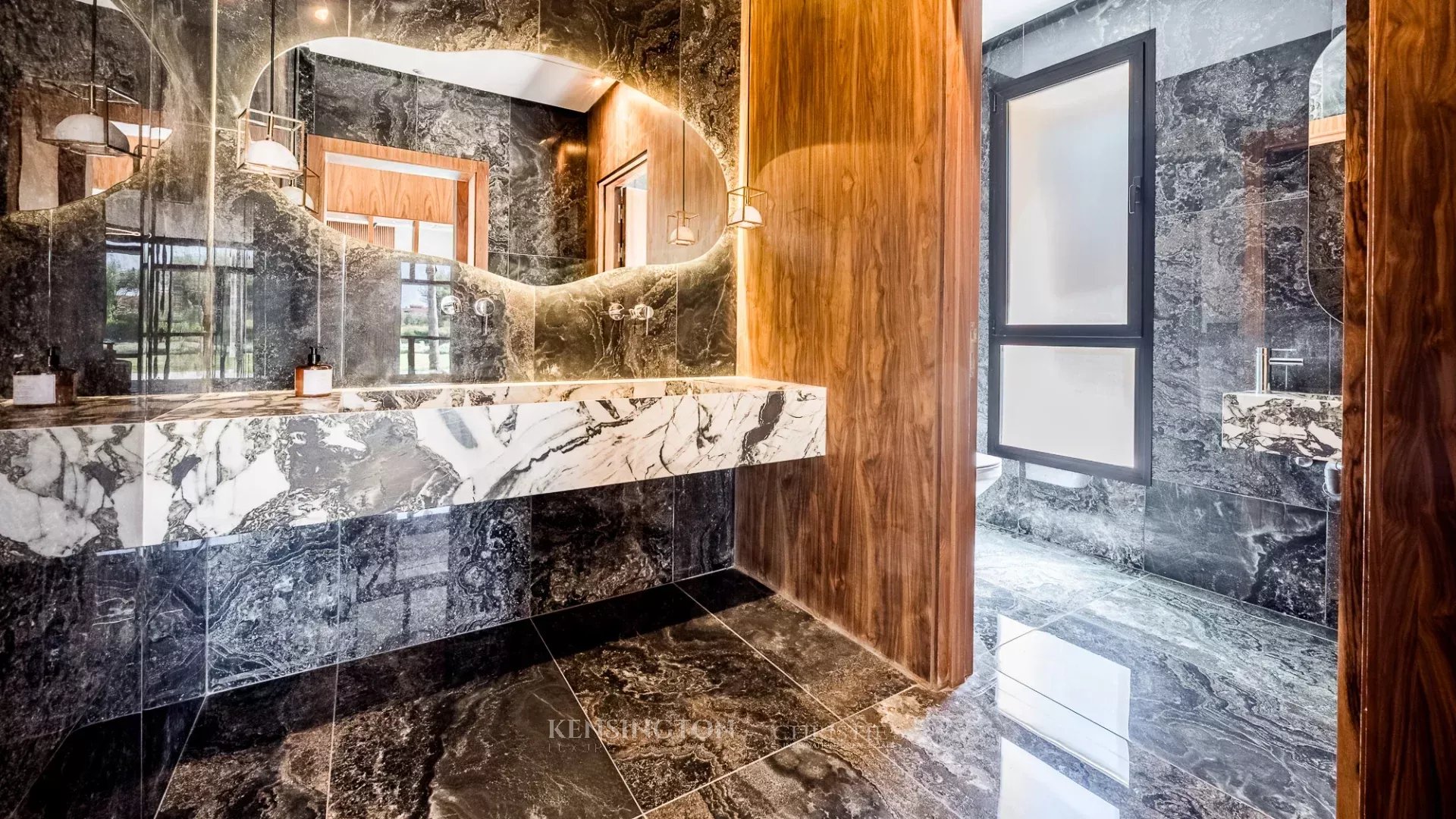 Finally, the finishes reflect a high level of quality, including American walnut woodwork, a Laminam marble-effect kitchen, Duravit sanitary fittings, Grohe fixtures, AC5 herringbone parquet flooring, and integrated architectural lighting.