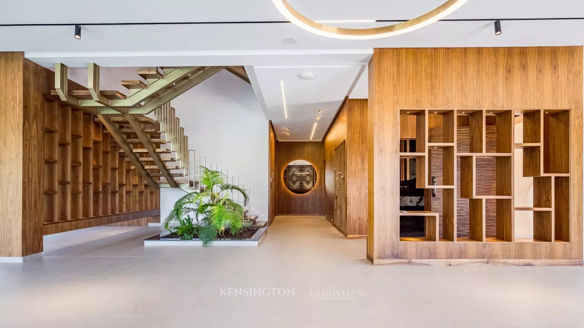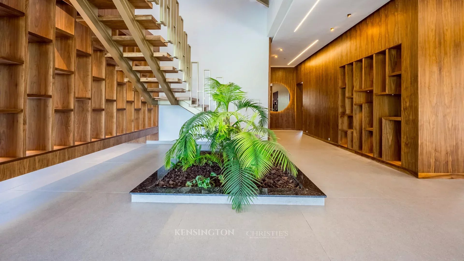 The ground floor is centered around a spacious reception area opening onto the garden, creating a seamless indoor-outdoor flow. It also features a high-end kitchen with a central island, a pantry, as well as a guest suite with dressing room and en-suite bathroom, in addition to guest toilets.
