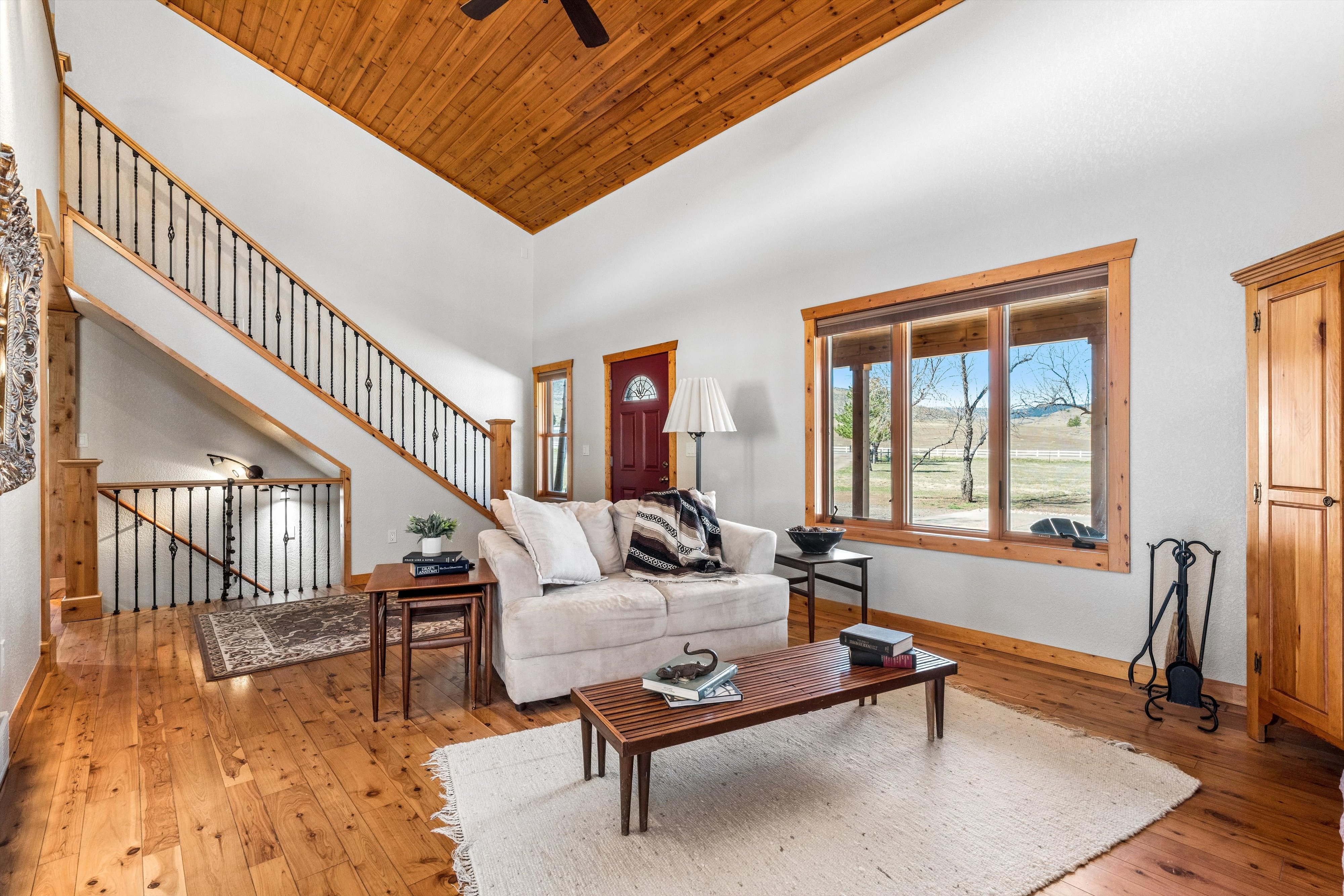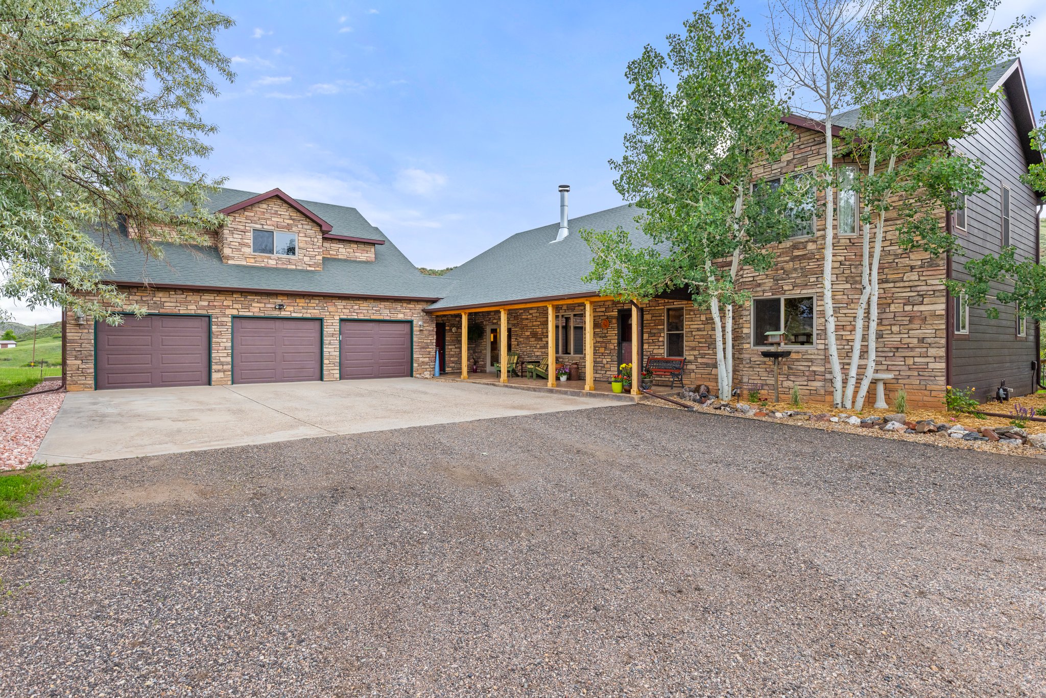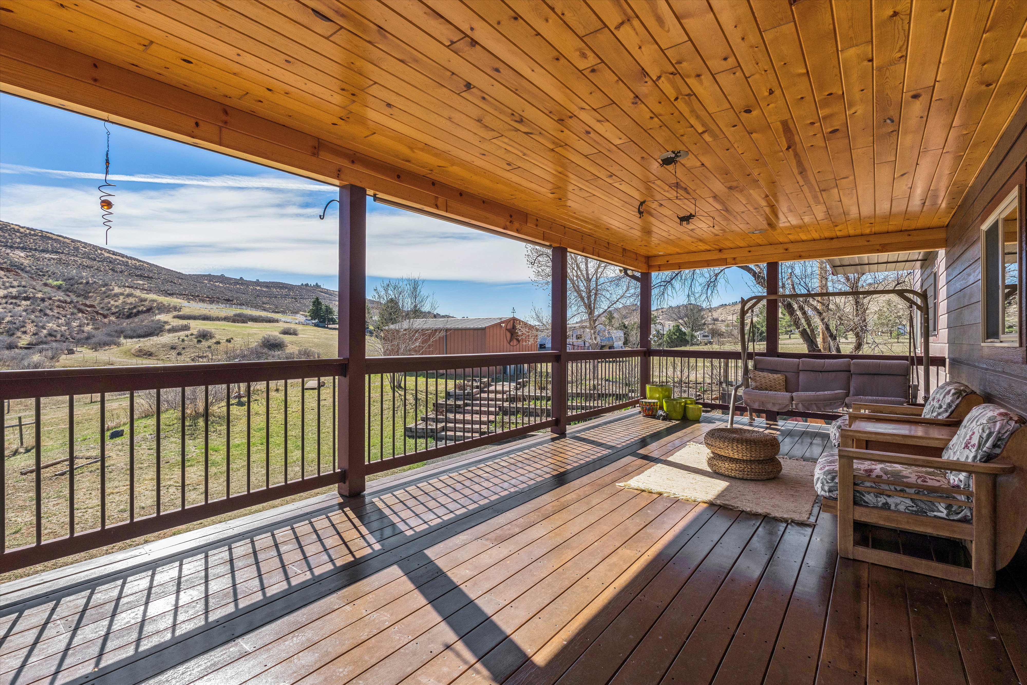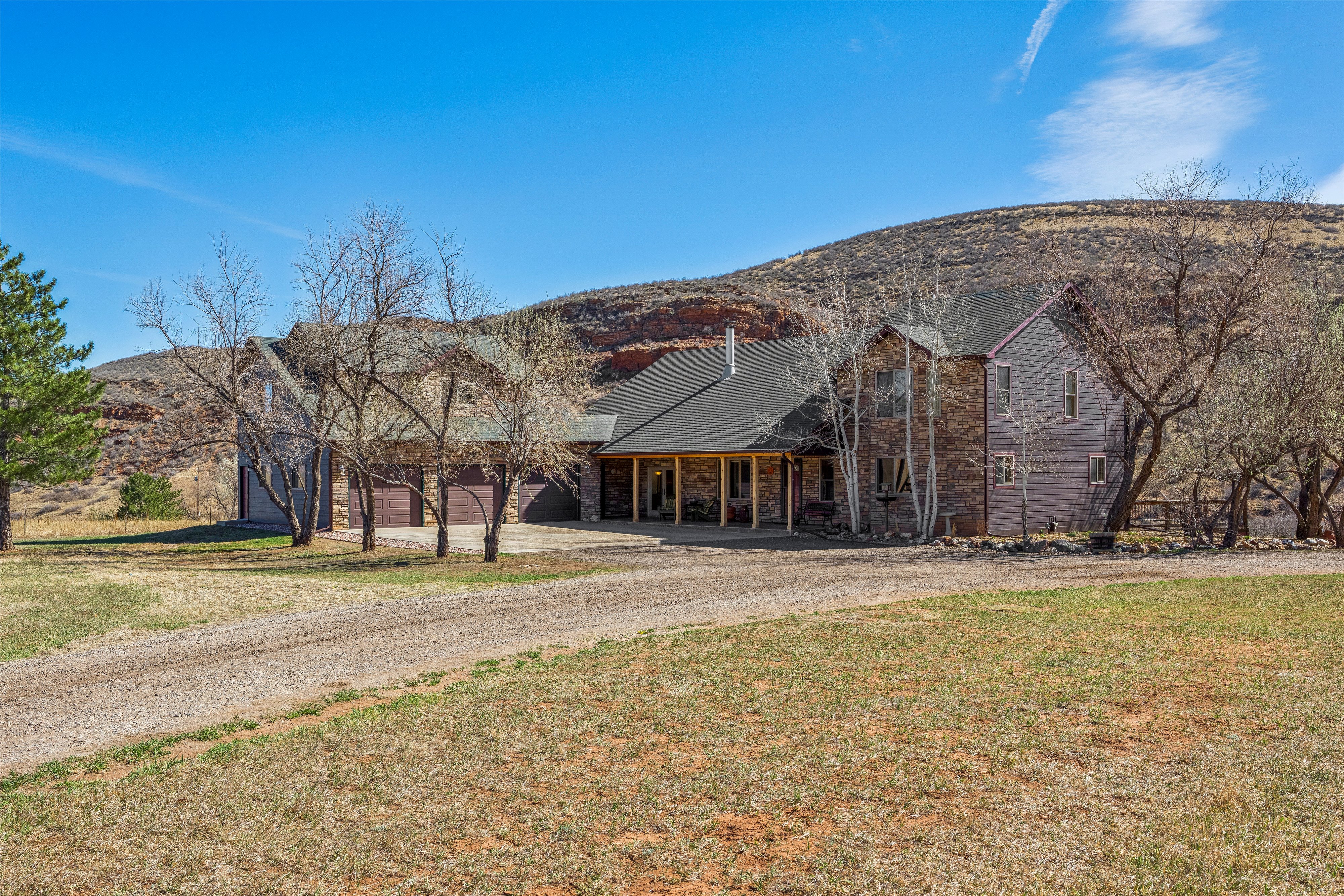 Welcome to your private Colorado retreat, perfectly positioned among the breathtaking Red Bluffs. Set on 20 expansive acres just minutes from the sparkling waters of Carter Lake, this custom-built four-bedroom, three-bath home offers a rare blend of luxury, privacy, and versatility. Step inside to an open-concept layout designed for both everyday living and effortless entertaining. Soaring ceilings and expansive picture windows flood the home with natural light, showcasing rich wood finishes, stunning views, and a hand-crafted double-sided stone fireplace that anchors the main living spaces. The gourmet kitchen is a true centerpiece, featuring stainless steel appliances, beautiful cabinetry, and ample space to gather. Whether hosting or enjoying a quiet evening at home, the seamless flow between kitchen, dining, and living areas creates a warm and inviting atmosphere. Designed with flexibility in mind, the walk-out basement offers a fully equipped private apartment with its own entrance-ideal for multigenerational living, guests, or income potential. Outdoor living shines with an oversized covered patio, perfect for entertaining or simply soaking in the peaceful surroundings and sweeping landscape. The oversized three-car garage provides plenty of room for vehicles, toys, and gear, plus an unfinished studio space above-ready for your vision. With zoning that allows for a secondary residence, this property presents endless opportunities-build a guest home, create a workshop or barn, or expand your investment potential. Whether you're searching for a serene escape, room to grow, or a home that offers unmatched flexibility, this exceptional property delivers it all-just a short drive to Estes Park and Rocky Mountain National Park.