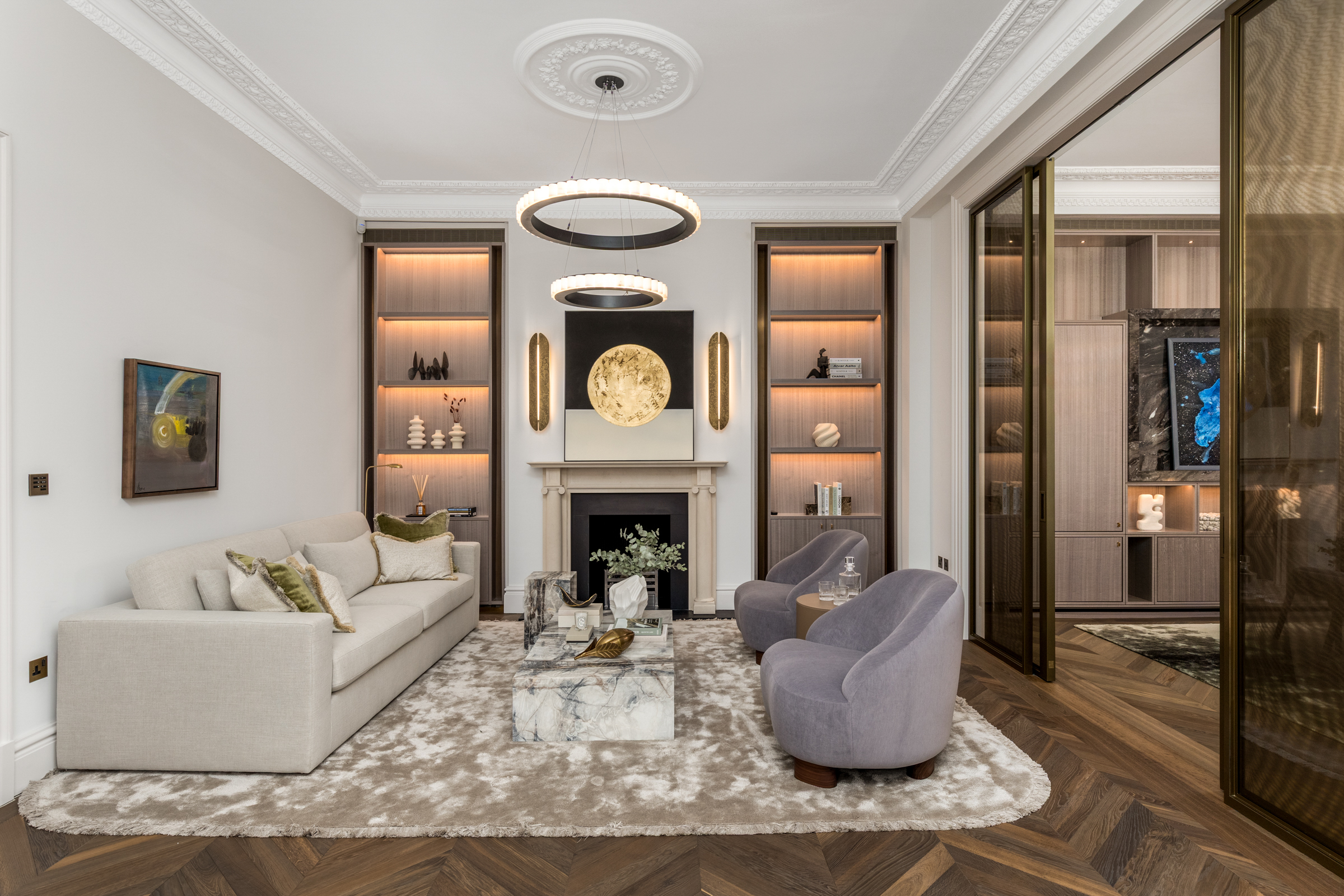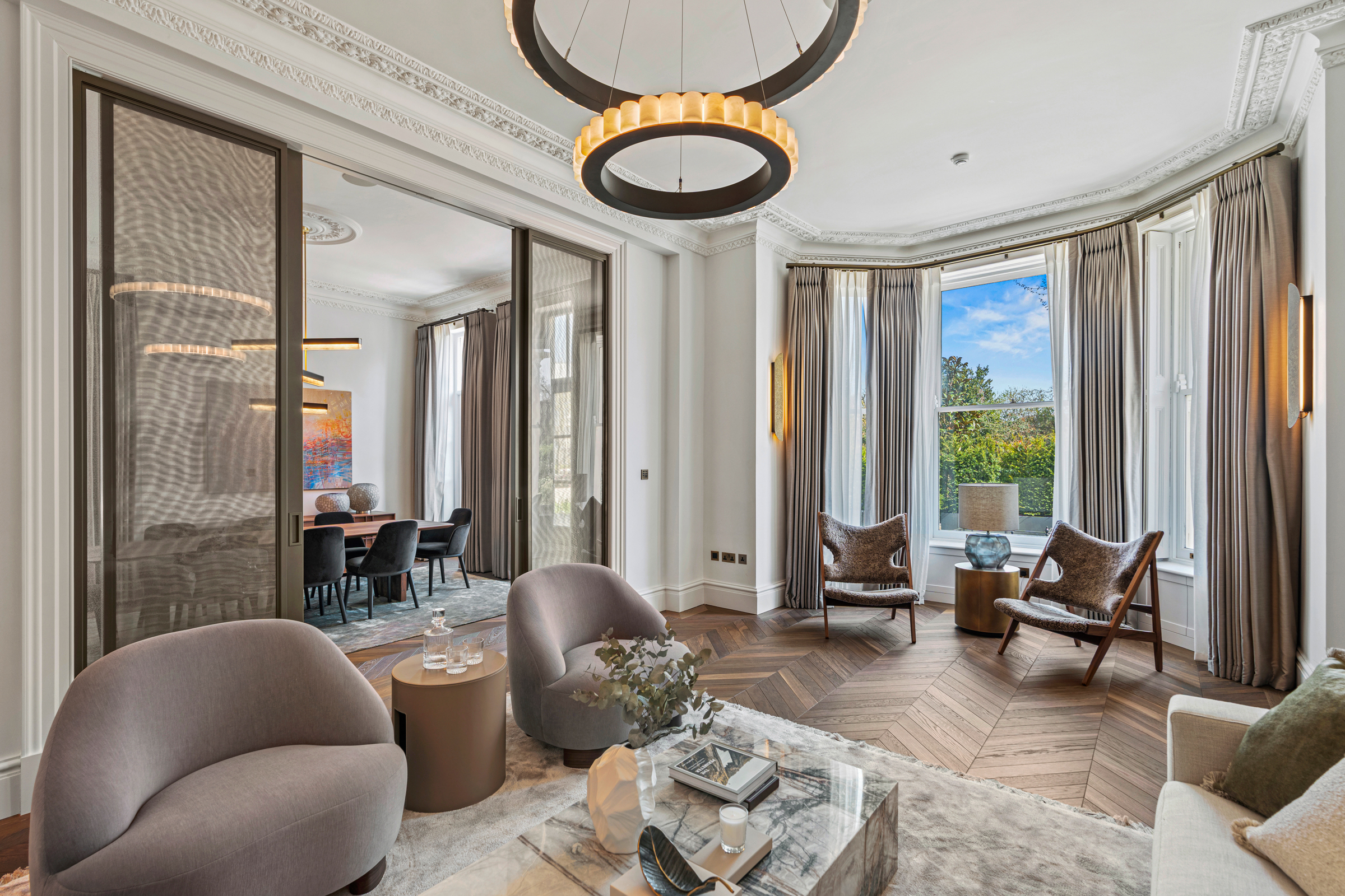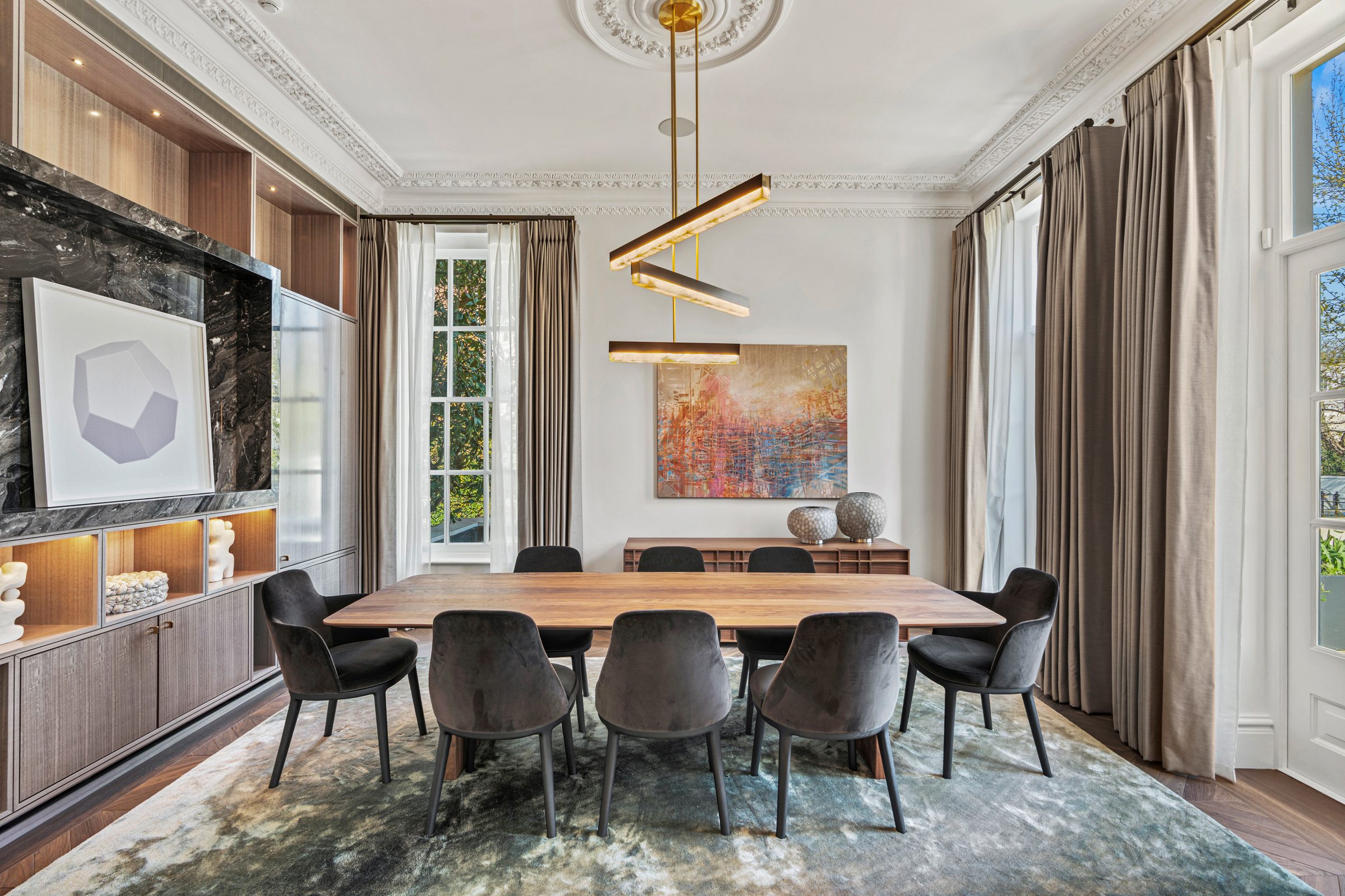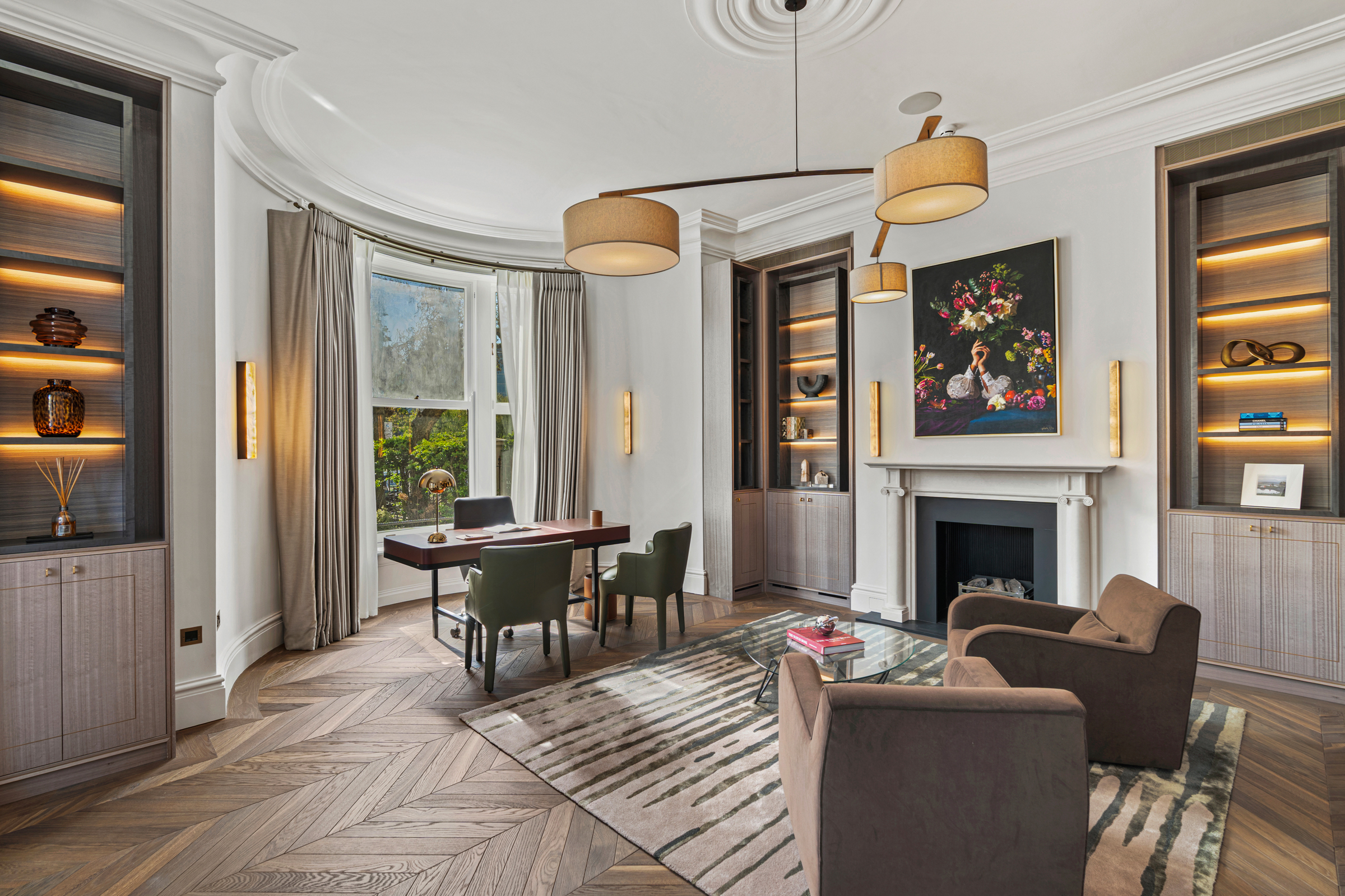 Standing behind a private gated front on one of Little Venice’s most coveted avenues, this exceptional Grade II listed villa has been entirely re-engineered for modern family life. The house unfolds across more than 7,700 sq ft, its classical proportions preserved while every layer beneath has been rebuilt to create a home of rare capability. High ceilings, deep sash windows and finely restored joinery speak to the building’s heritage, while a newly excavated leisure level introduces a discreetly luxurious counterpoint.
