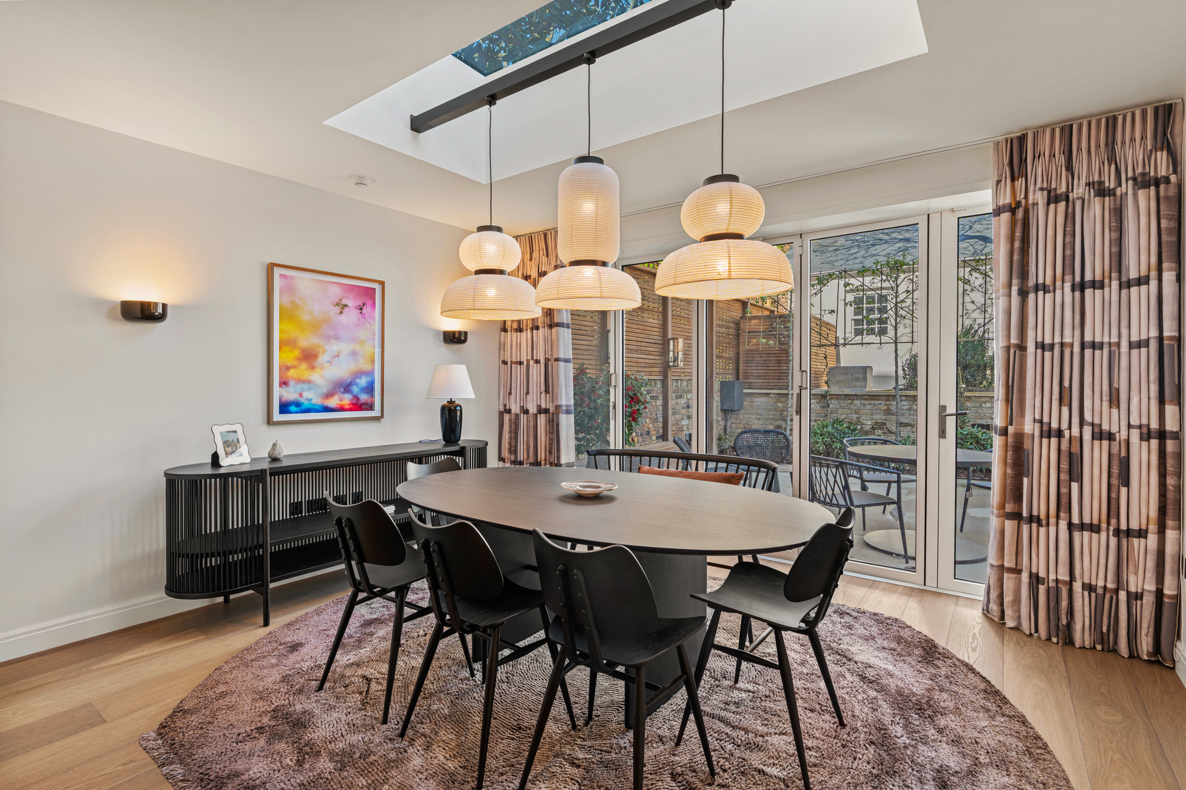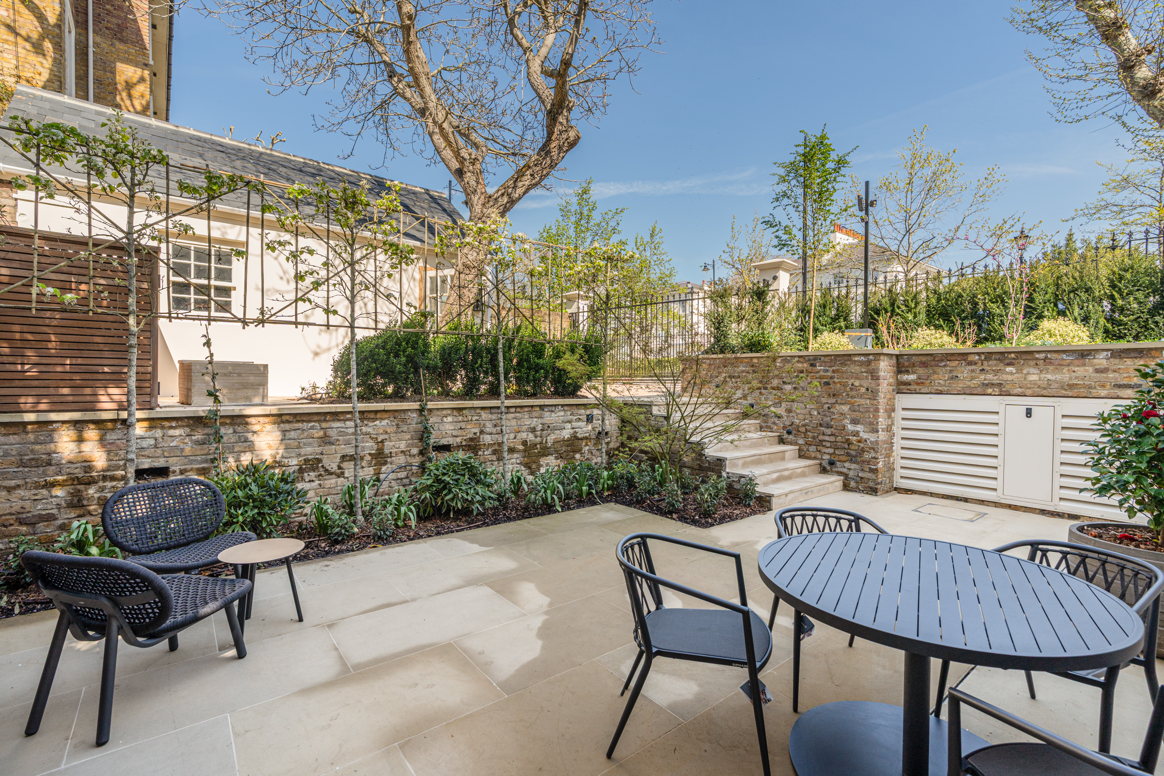Outside, the house is unusually well served. Two side gardens, a front courtyard and a kitchen terrace create a sequence of outdoor rooms, while secure gated parking provides space for two cars. A separate studio at the end of the garden offers further flexibility for staff, guests or a private workspace.