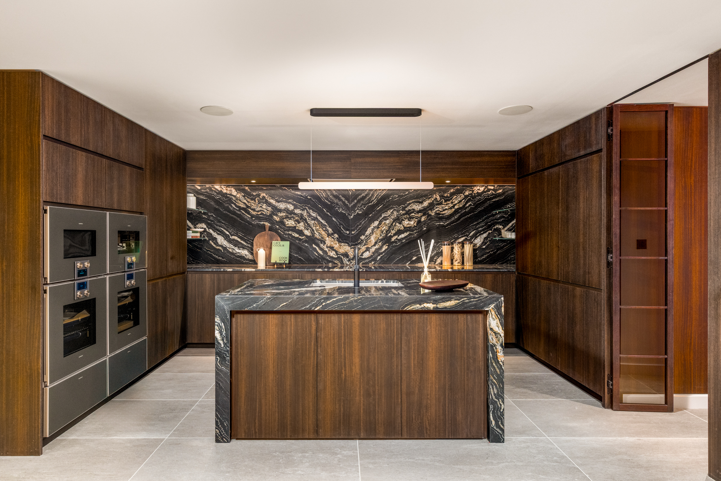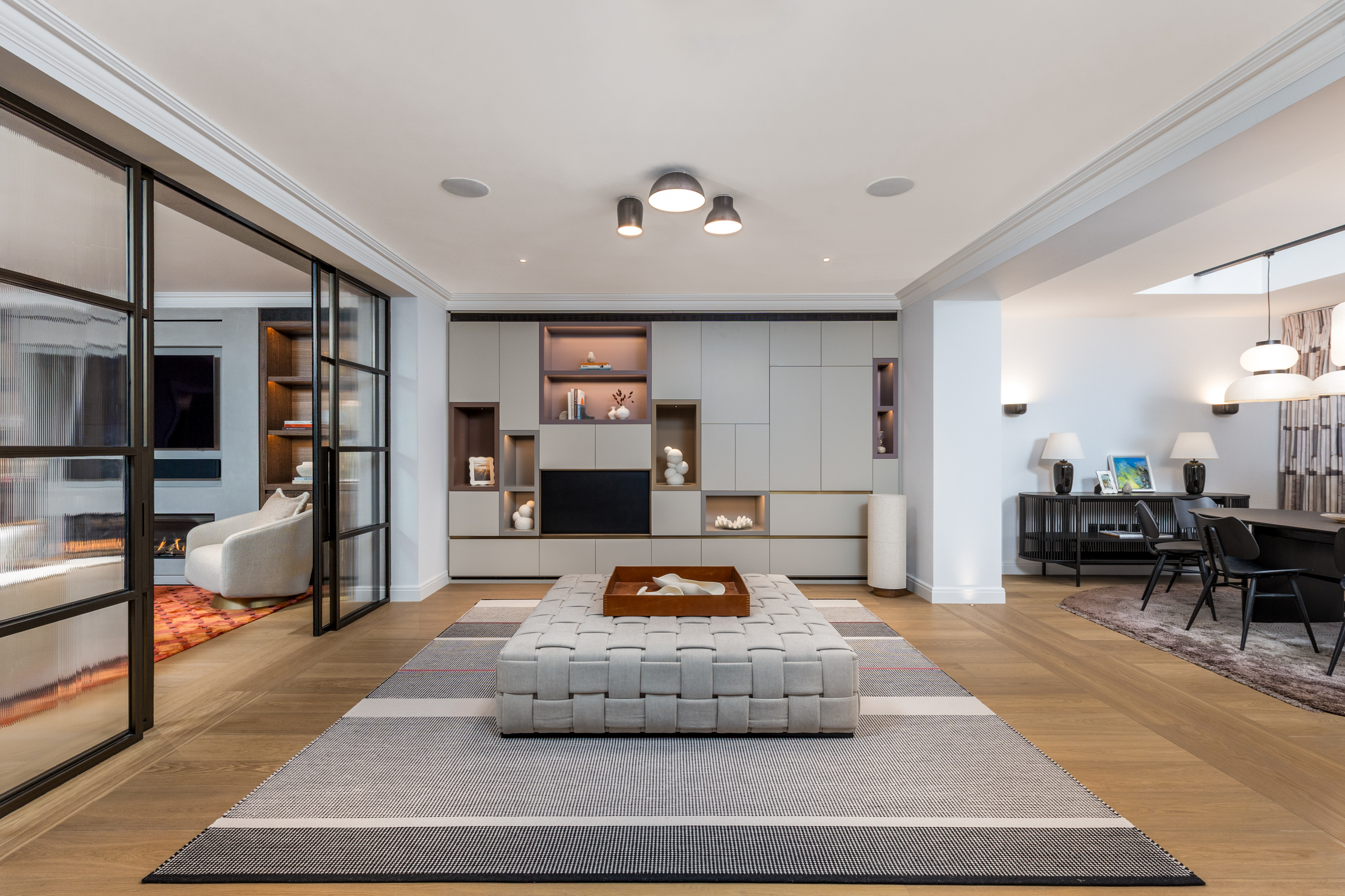 Below, the newly created basement is a private wellness suite more often found in a members’ club than a London home. A 15-metre swimming pool runs the length of the space, accompanied by a steam room, Jacuzzi and fully equipped gym. The scale is generous, the finishes calm and architectural, and the result is a floor that feels integral rather than ancillary.