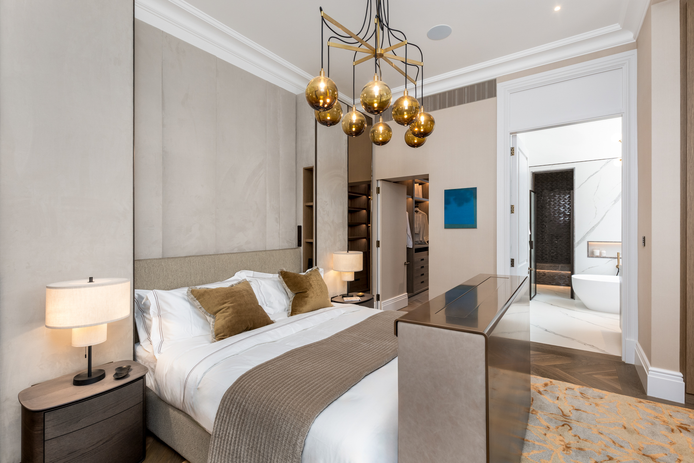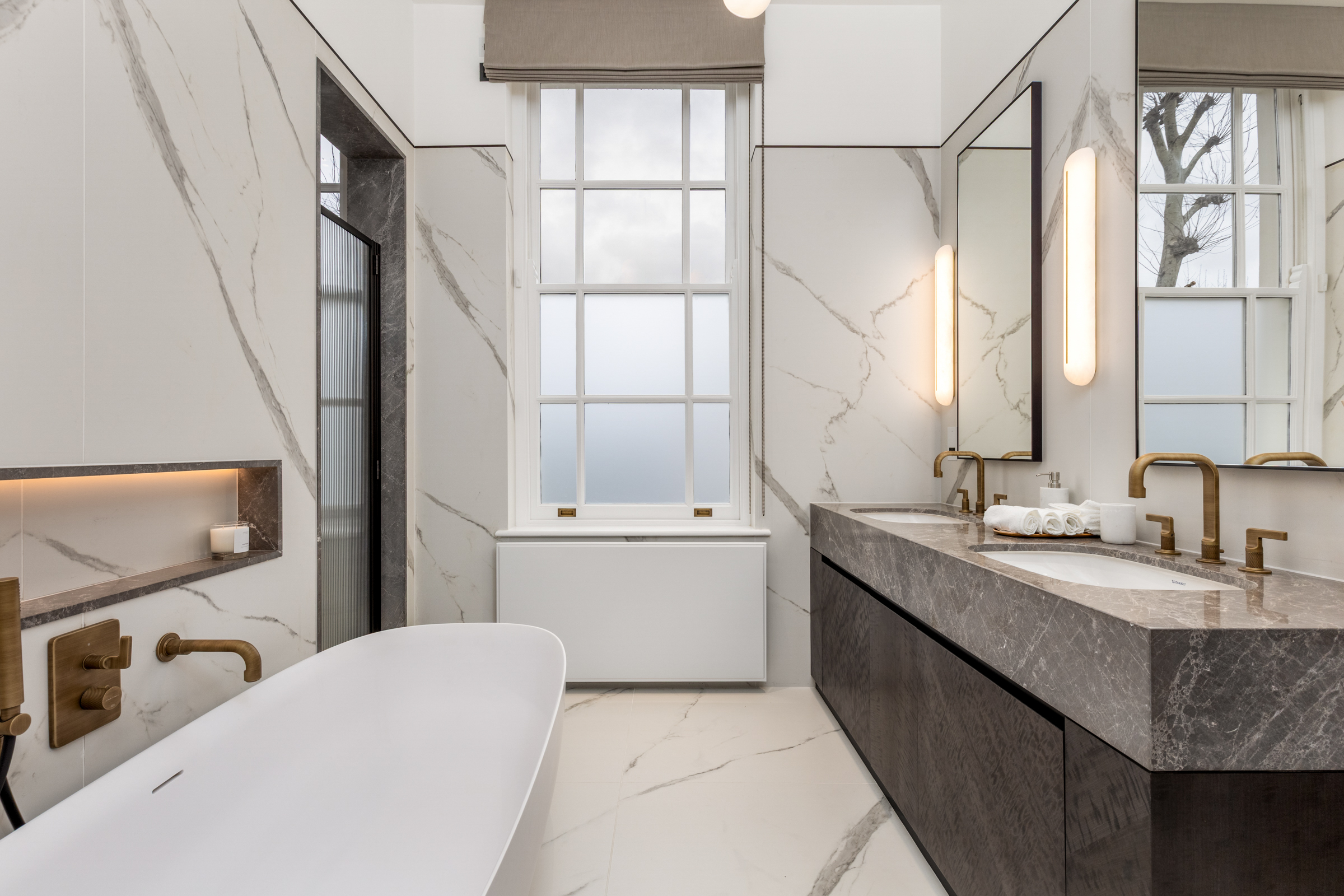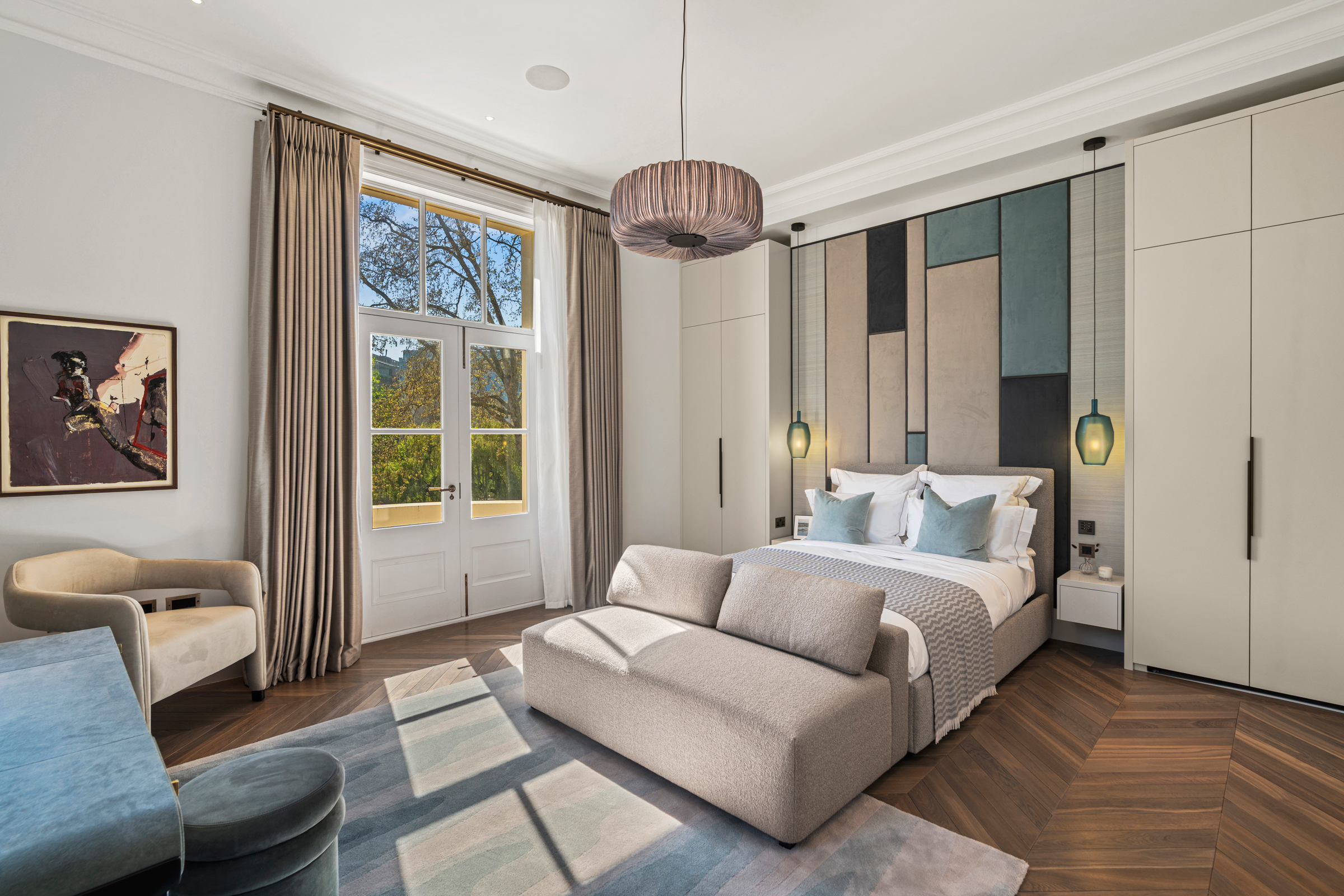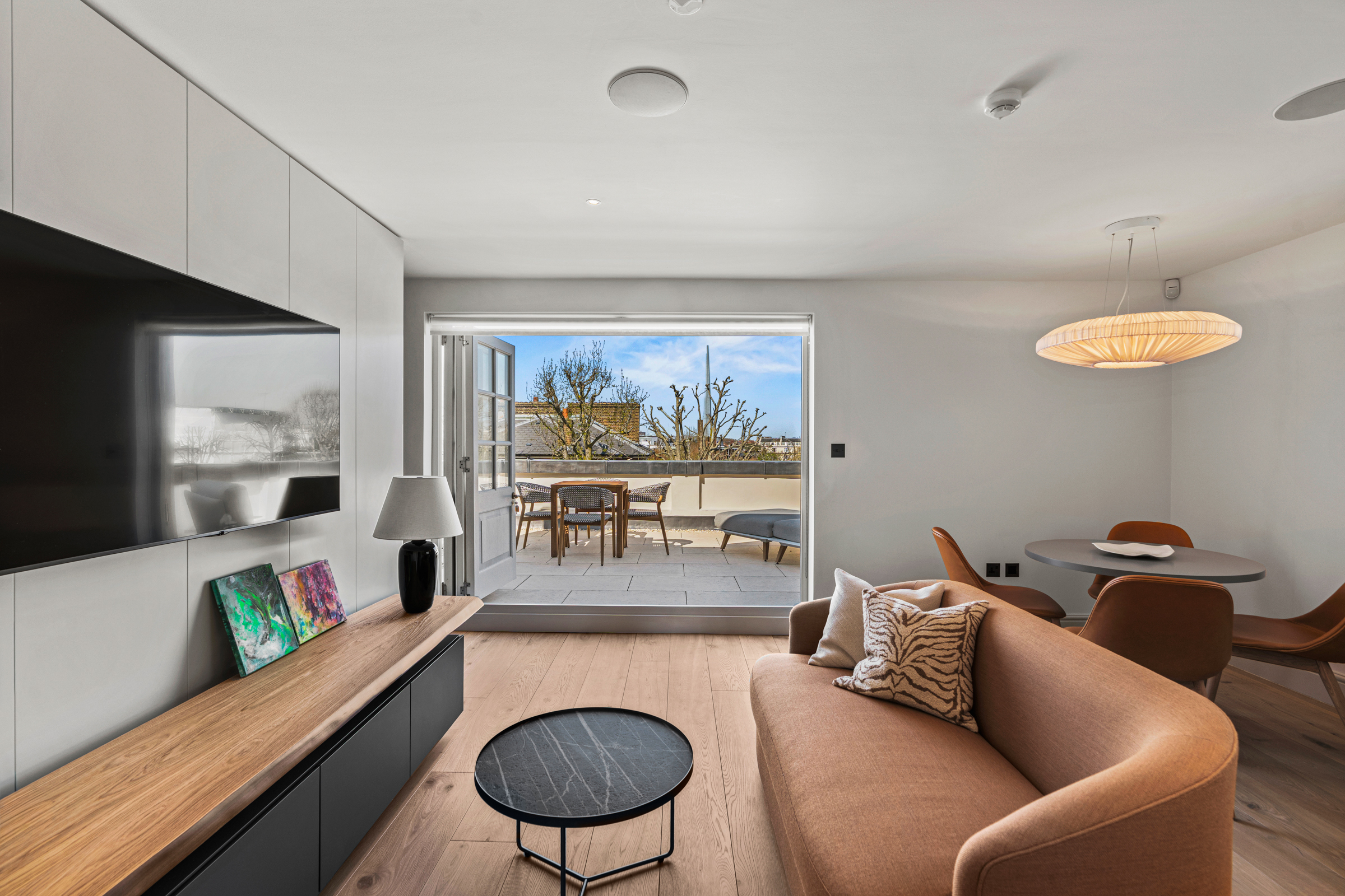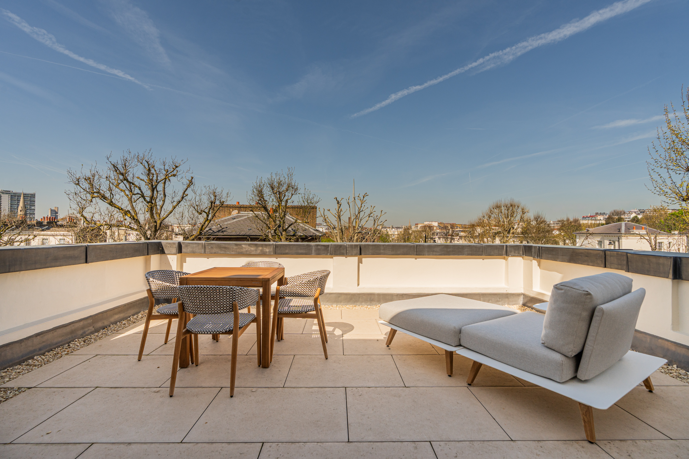 The principal bedroom occupies the first floor, complete with a large dressing room and an expansive ensuite bathroom finished in natural stone. A second bedroom suite sits alongside, equally well proportioned. The upper floors provide two further bedrooms, each with its own bathroom, while one provides a versatile multi-purpose room opening onto a broad roof terrace with views across the treetops of Maida Vale.