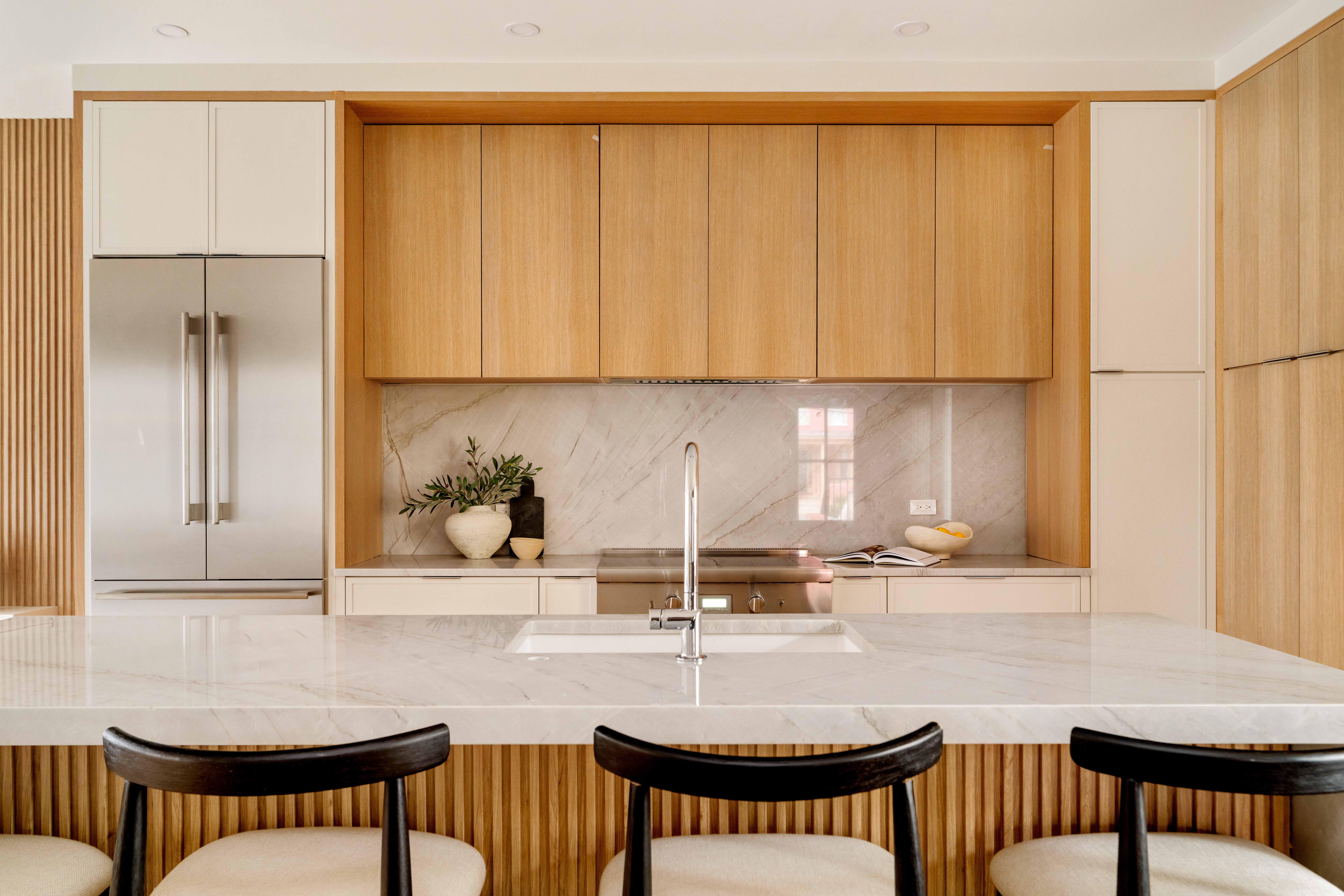 Baldwin neighborhood. Set well back from the street, this middle townhouse offers a notably private, tucked-away feel while being entirely rebuilt within—an authentic reinvention from the inside out. With dual exposures, light moves cleanly from side to side, giving the home a calm, composed feel. The main level is open and functional, with kitchen, dining, and living spaces flowing together, plus a powder room and covered deck. Upstairs are three bedrooms, three bathrooms with well-positioned laundry, and a generous private deck with southern exposure. The lower level adds a family room, bedroom, and full bathroom—flexible space for guests, work, or everyday use. The design is quietly contemporary, with wood accents adding warmth and texture. One-car parking. Positioned between Harvard and Porter Squares, with Red Line access at both and the commuter rail at Porter. Close to Inman and Kirkland Village, and around the corner from Giulia, Moëca, Pavement, Simon’s, and Bagelsaurus.