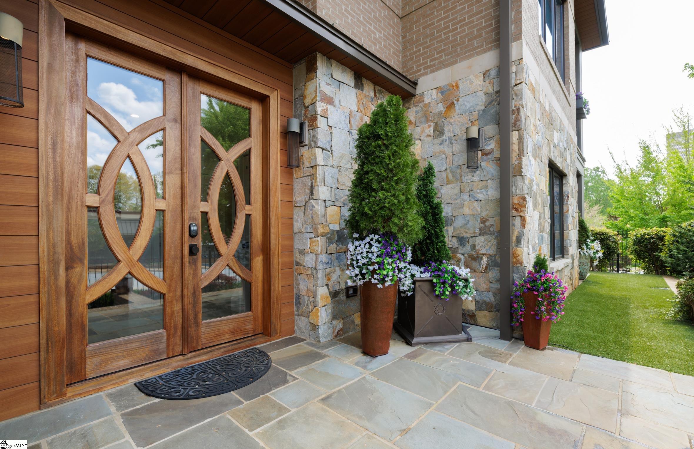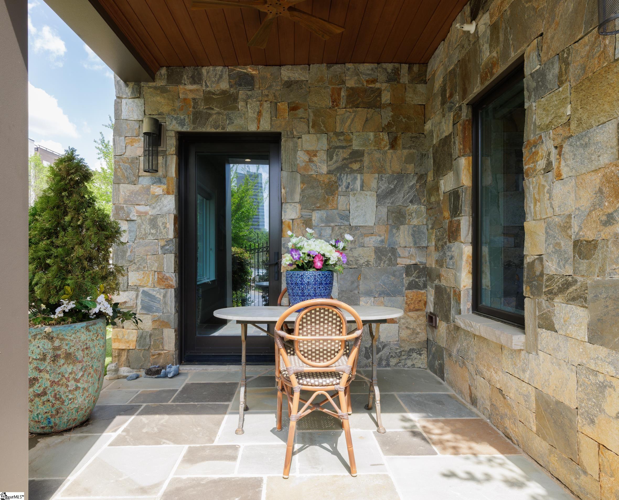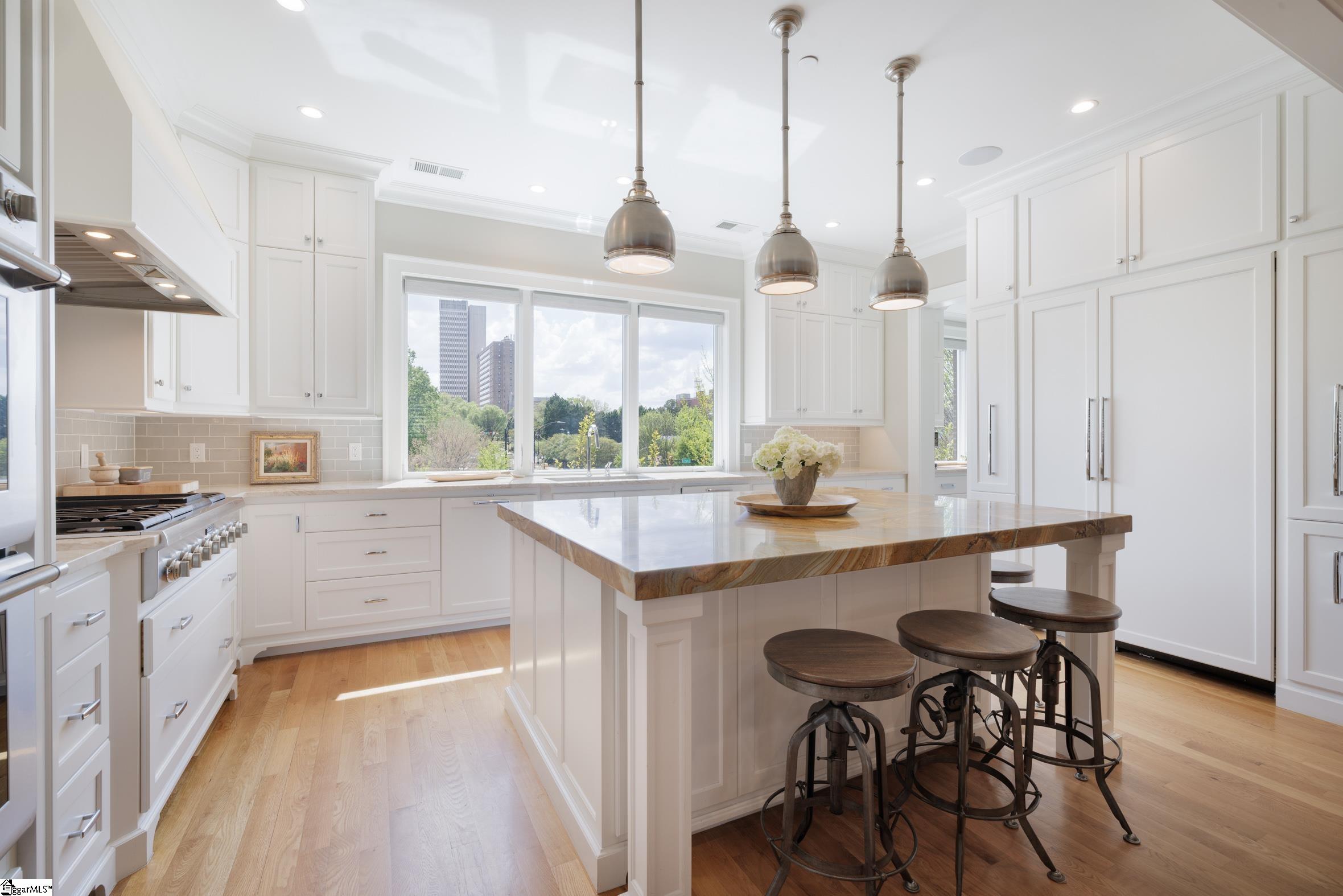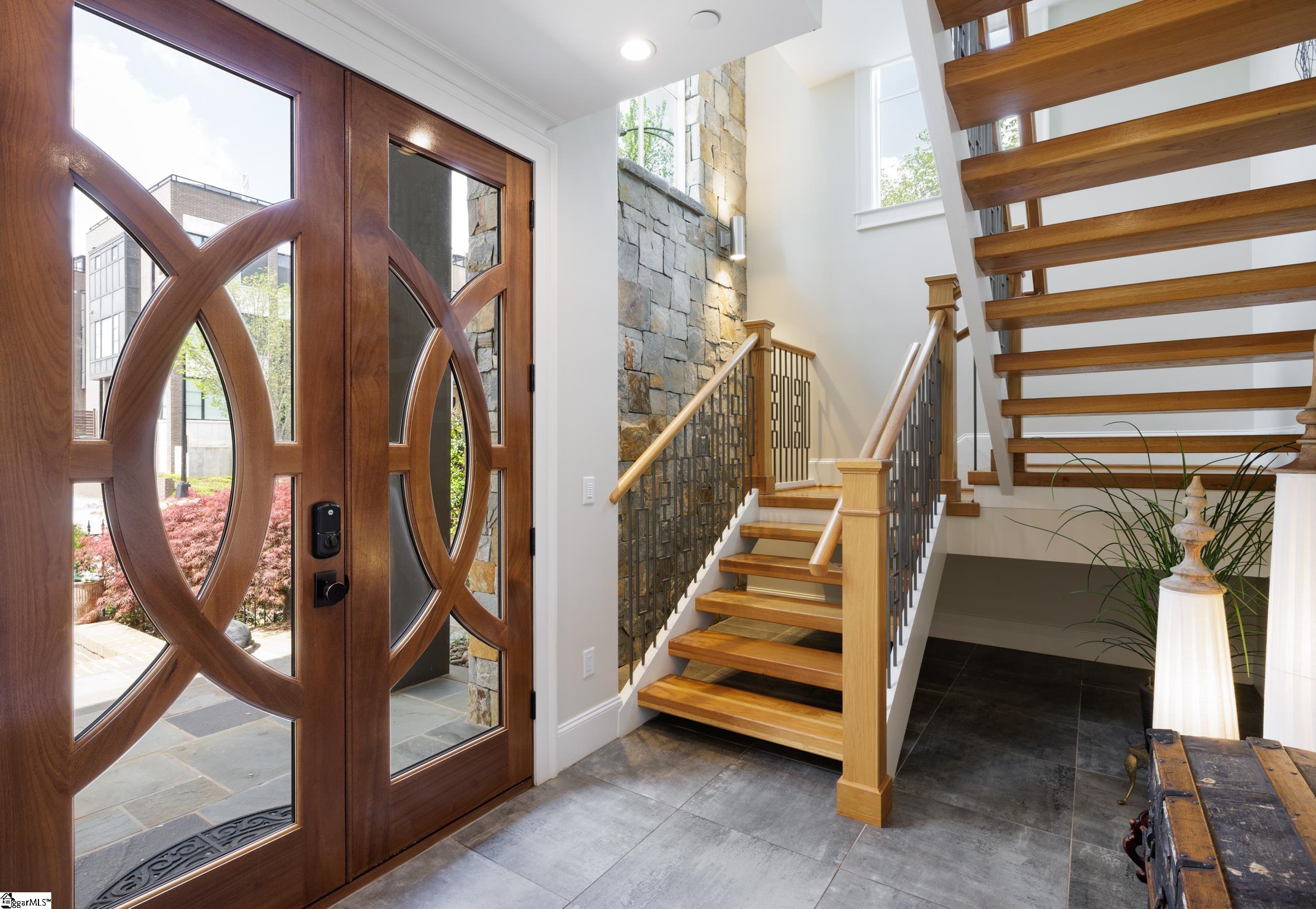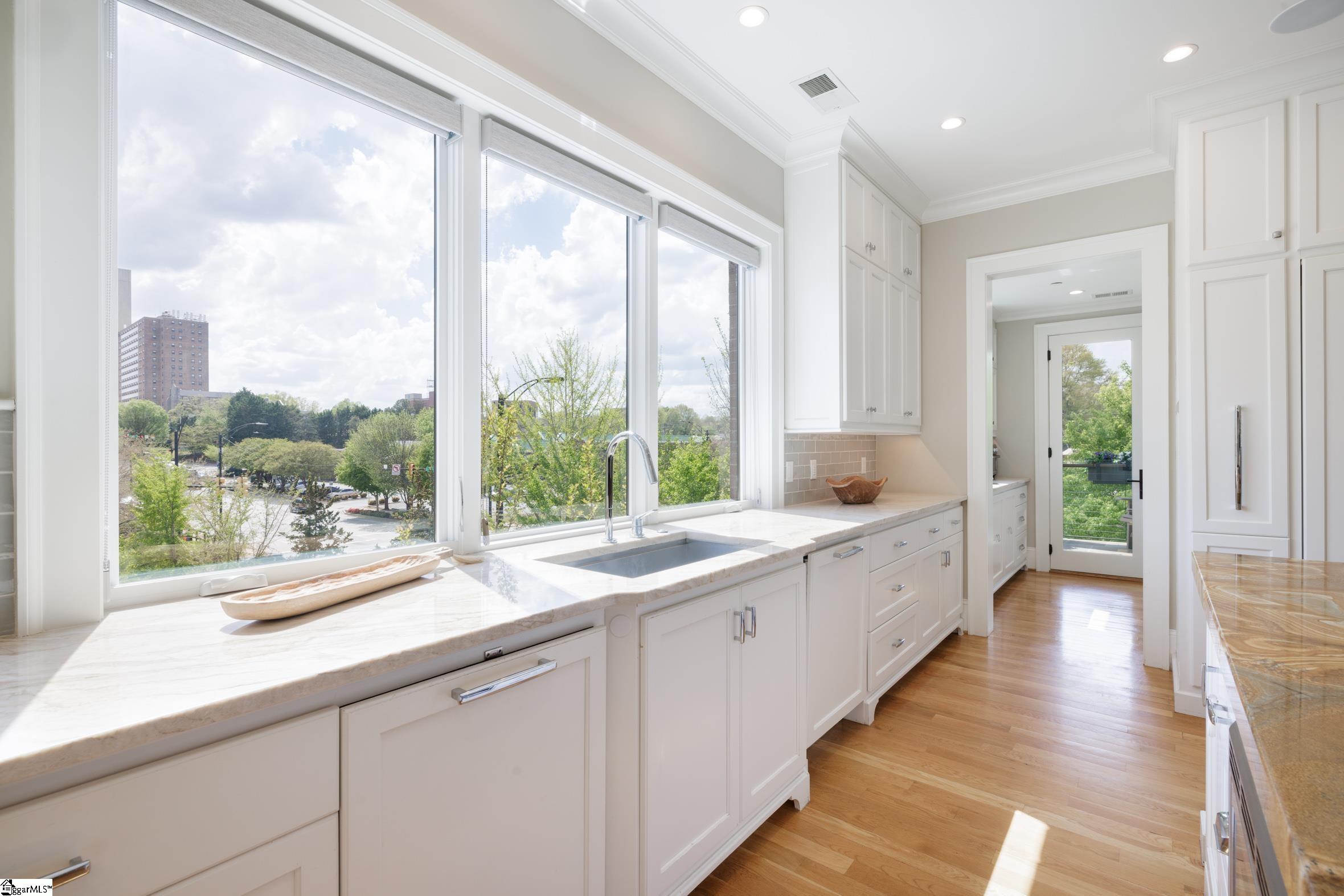 Think boutique hotel meets modern brownstone. Perfectly positioned on coveted North Main Street near McPherson Park, Greenville's oldest historic park, this one-owner, custom-built residence offers an exceptional blend of luxury, functionality, and elevated living, all within walking distance to the city's most celebrated dining, shopping, and green spaces. This thoughtfully designed four-level home welcomes you with a grand foyer and a private main-level guest suite complete with its own en-suite bath, ideal for hosting or multigenerational living. This level also provides access to the three-car tandem garage, thoughtfully equipped with a pet washing station, utility closet, tankless water system, and additional storage. And while the staircase makes a statement all its own, a private elevator offers effortless access to every level. The second level serves as the heart of the home, featuring an impeccably appointed chef's kitchen with a generous center island, bar seating, and captivating city views. A spacious walk-in pantry opens to one of the home's three terraces, creating seamless indoor-outdoor flow. This level also includes a formal dining room, a dedicated home office with rich mahogany walls and sliding doors for privacy, a well-appointed laundry room with sink and storage, and a stylish powder room for guests. The third level is a true private retreat, highlighted by a luxurious primary suite featuring dual walk-in closets and a spa-inspired bath with a freestanding soaking tub, expansive tiled shower, and dual vanities with abundant storage. An additional guest suite on this level offers its own en-suite bath, ensuring comfort and privacy for all. The fourth level elevates the experience even further, offering a sophisticated recreation space complete with a wet bar, secondary kitchenette, and full bath. Dramatic accordion-style doors open to an expansive rooftop terrace with a built-in grill & bar, creating a seamless indoor-outdoor setting with stunning skyline views - perfectly perched above downtown Greenville. Homes of this caliber don't just come on the market. They make an entrance. NOW: Make yours!