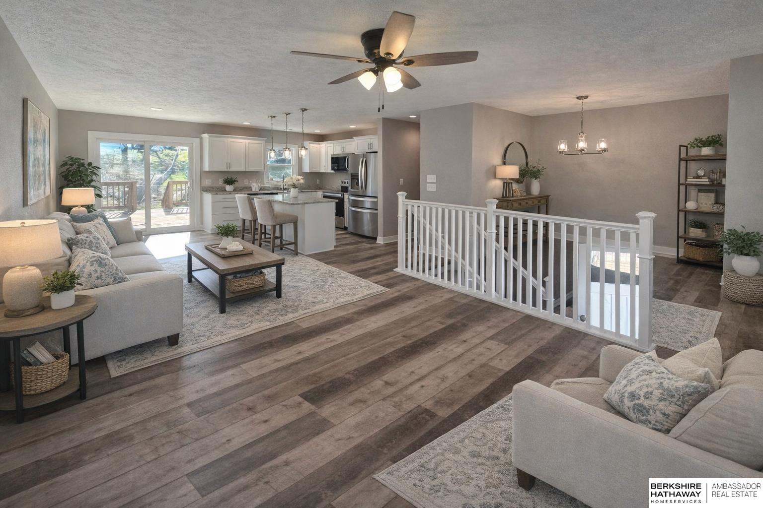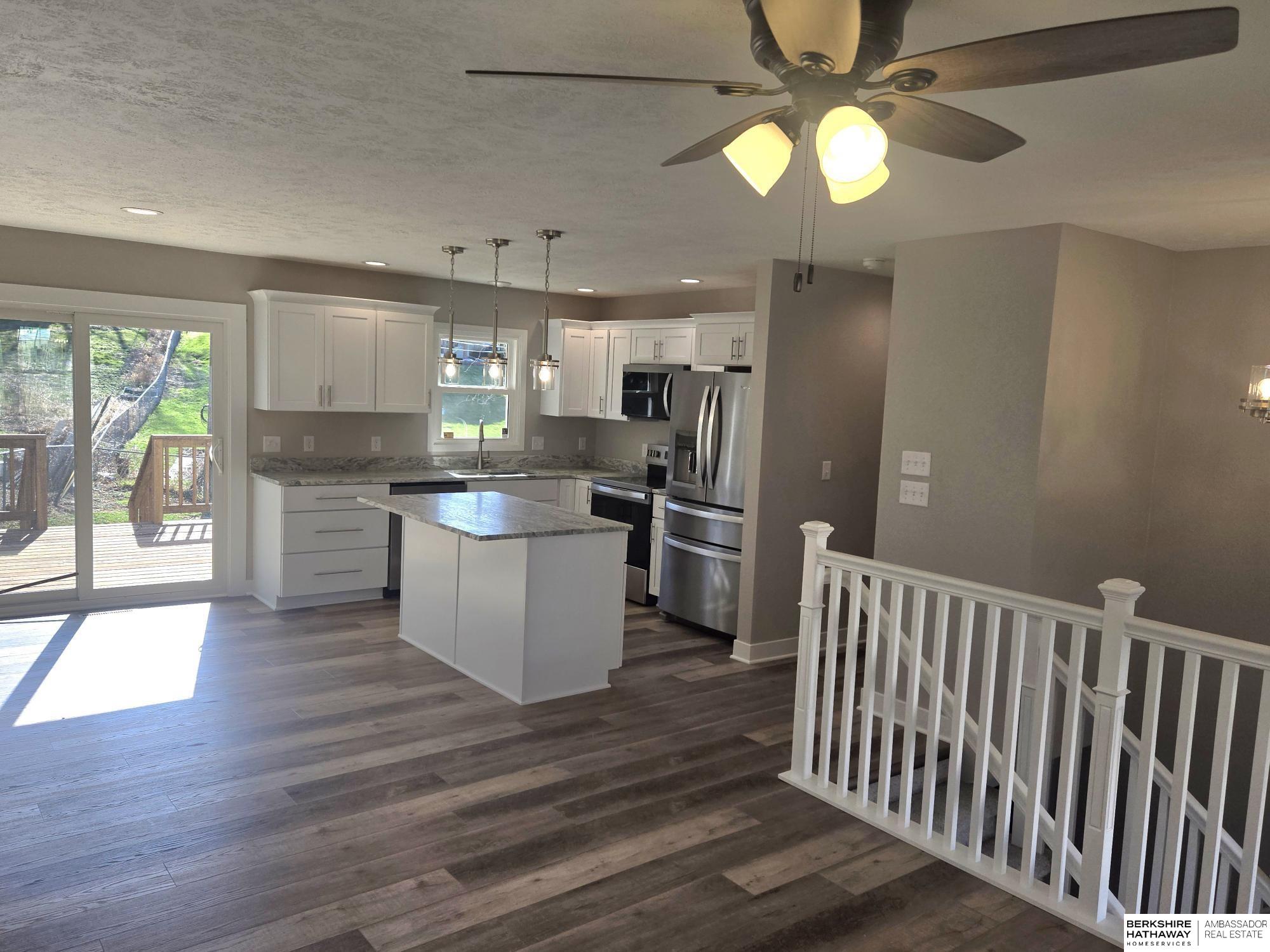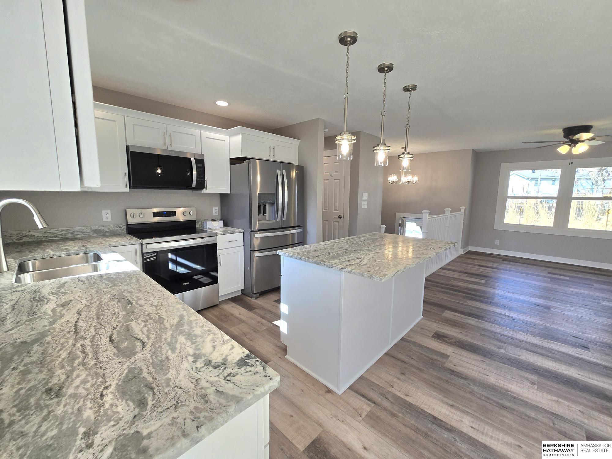 Completely remodeled top-to-bottom split-entry! Stunning 3-bedroom home features a brand-new kitchen with quartz countertops, pendant lighting, crisp white cabinetry& CENTER ISLAND. stainless steel Whirlpool appliance package. Beautiful wood laminate flooring flows through the main living areas, with spacious living/dining layout / patio door opening to a large rear deck - perfect for entertaining. 3 generously sized bedrooms offer new carpet /ceiling fans, along with a full bath featuring all new finishes. Fresh throughout /new doors, flooring, trim, cabinetry, and hardware. Major updates include newer furnace, A/C, and roof. Low-maintenance vinyl siding adds to the exterior appeal. Lower level features a large rec room, new carpet & luxury vinyl flooring - ideal living/flex space. True cream puff inside and out! Convenient location within walking distance to schools, parks, pool, dining, and everyone's favorite Dairy Queen! 10 minutes south of METRO! Hurry this one wont LAST!!