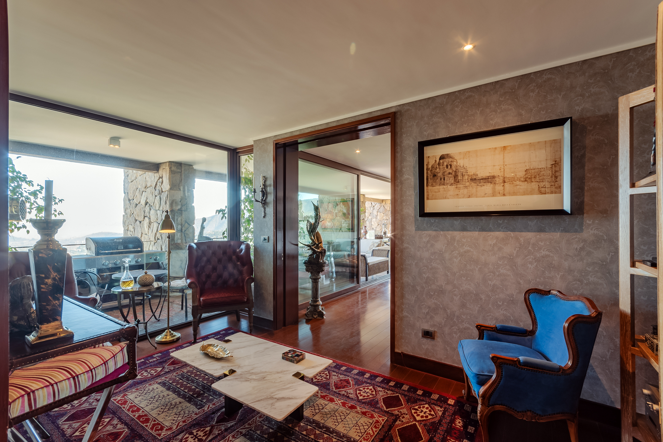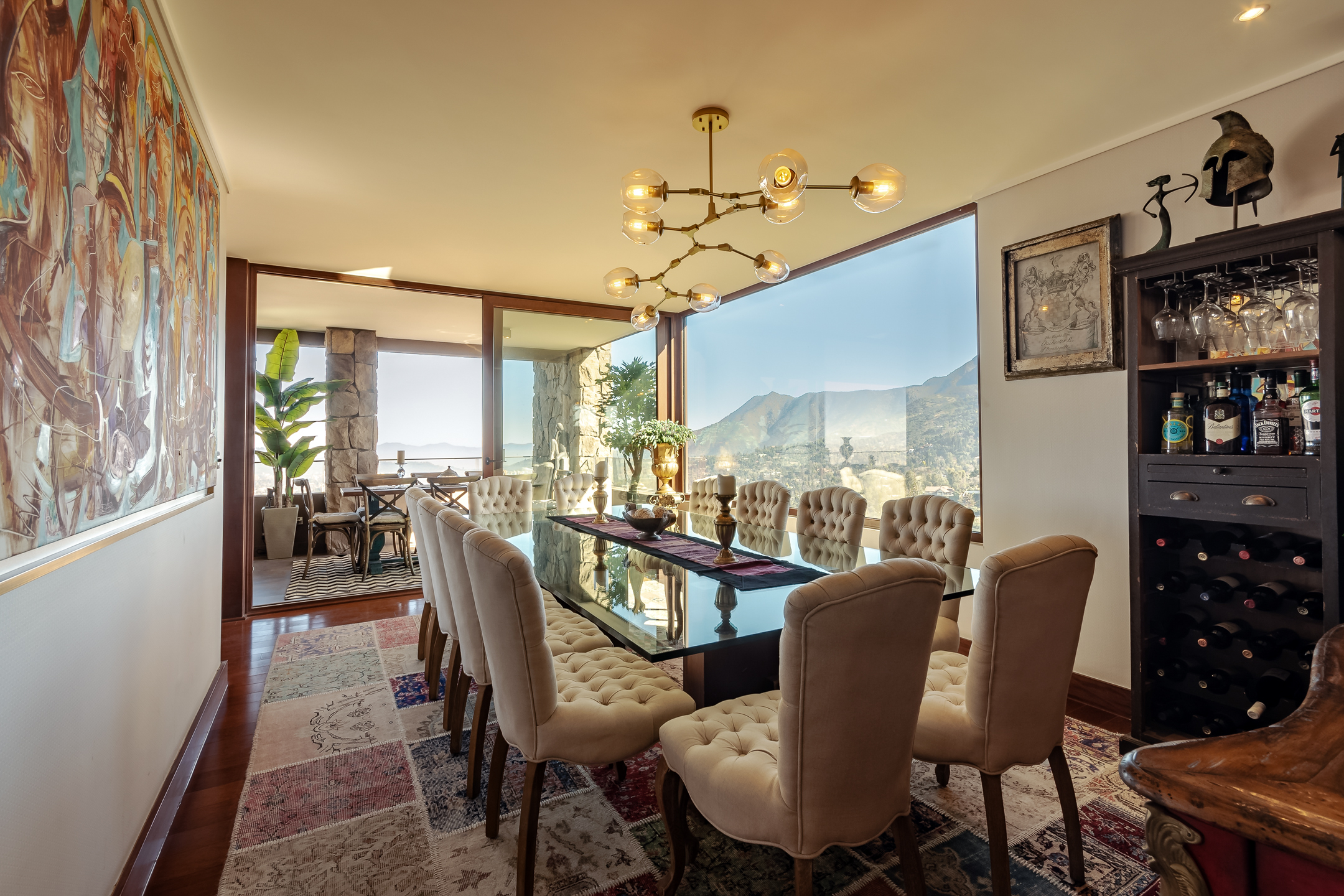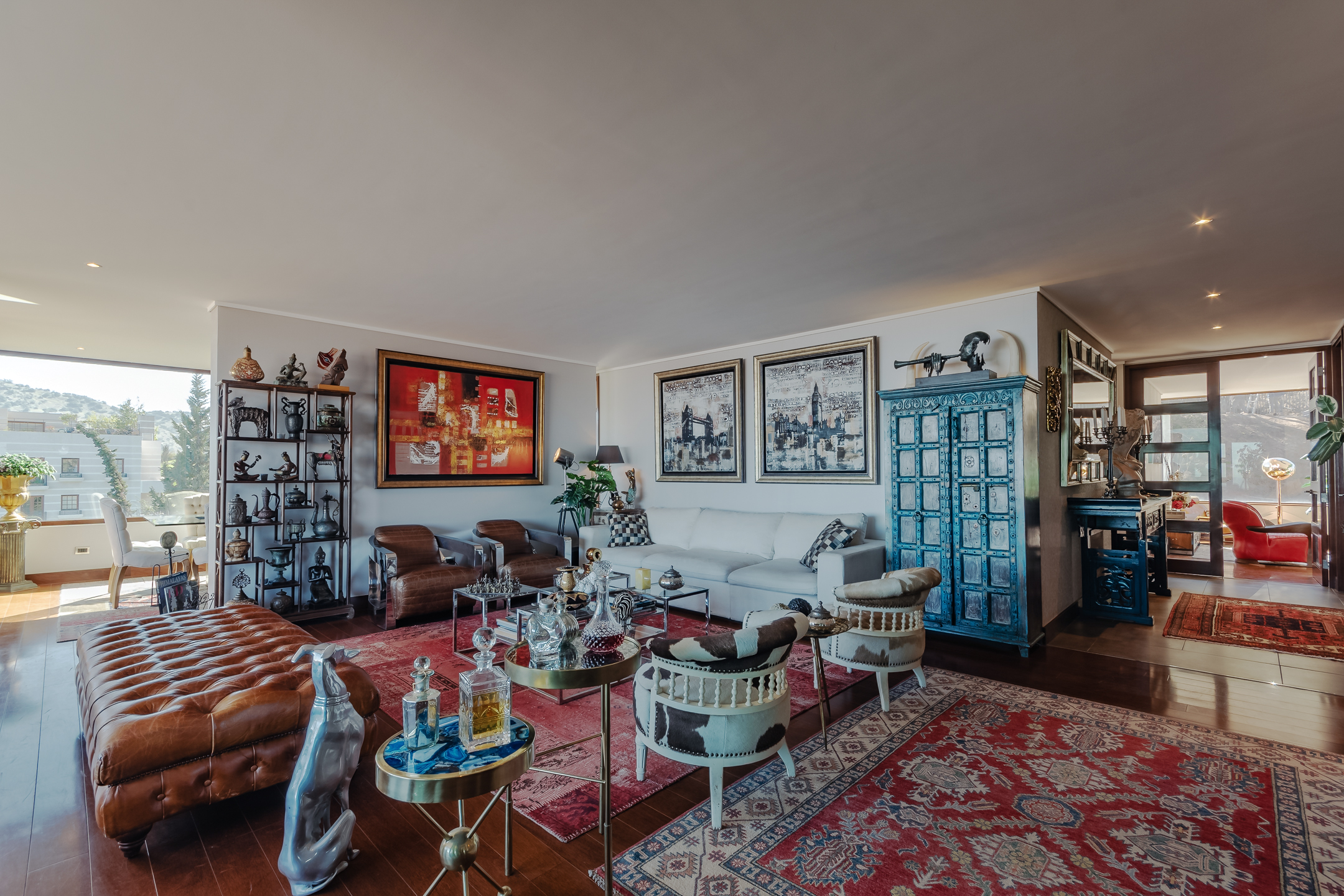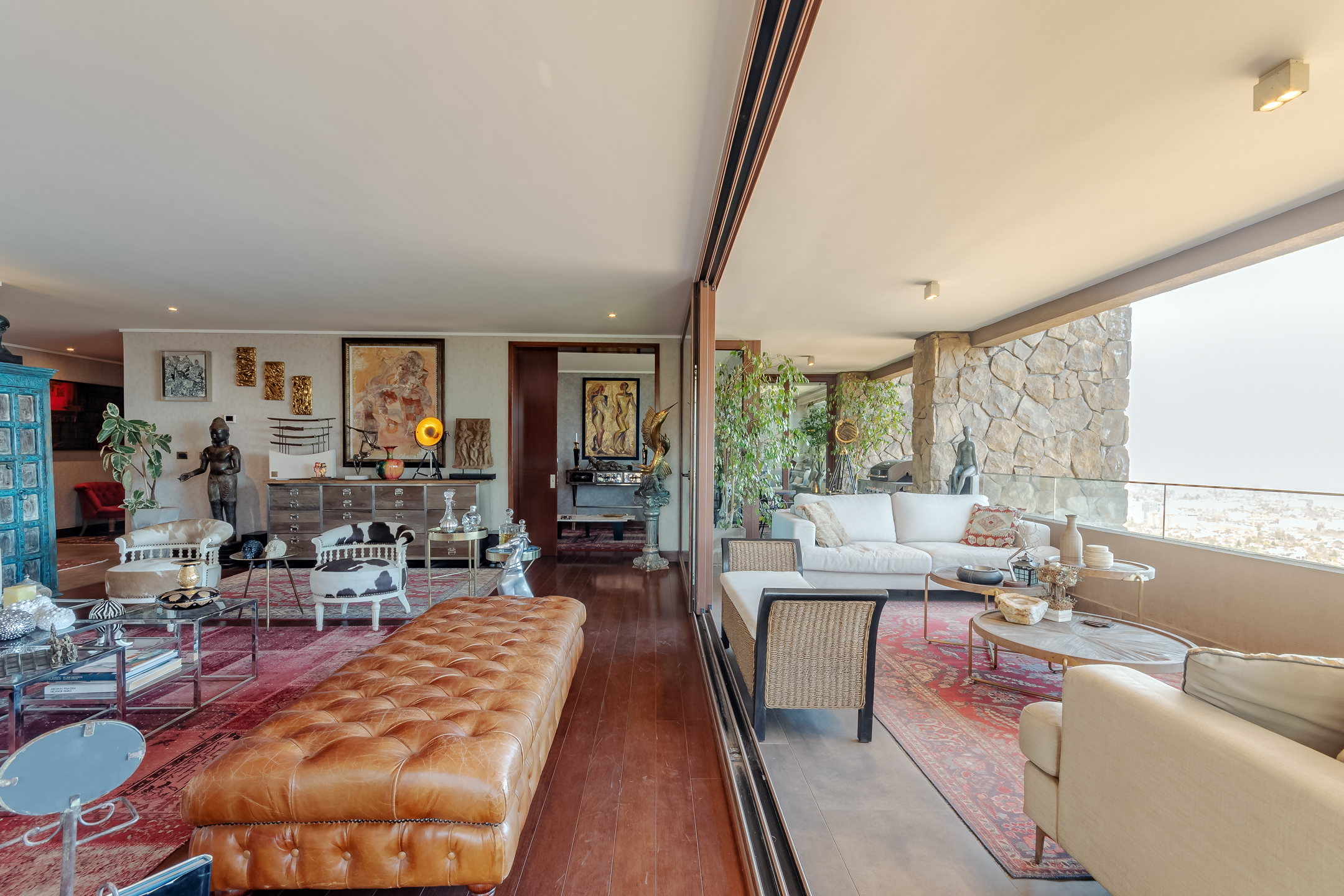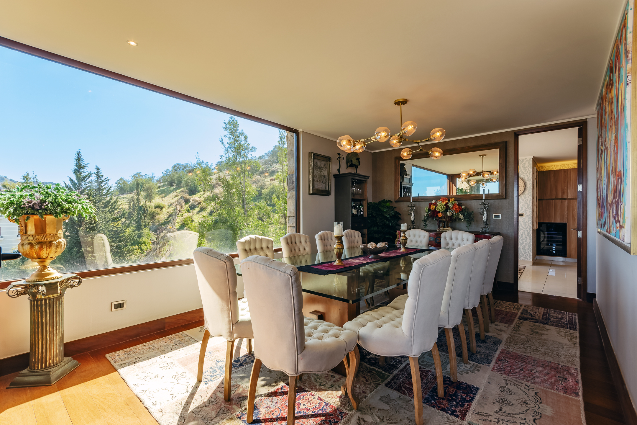 Amazing Furnished Apartment for Rent Every piece of furniture has been specially selected for each space, giving a unique identity to this exclusive apartment located in Condominio Mediterráneo with the best view of Santiago. Large Entrance Hall Guest Bathroom Spacious Living Areas: Living room and dining room are separate but connected by a large 3-room terrace, creating a great space ideal for sharing and enjoying. The dining room features a table for 12 people. Master Bedroom Area: Master Bedroom: Includes a living area and access to the terrace. Office: Connected to the master bedroom by sliding doors. Hallway: With double walk-in closets. Main Bathroom: Marble, jacuzzi, double sink, and lots of natural light. Additional Areas: Family Room Second Bedroom: Currently used as an office. Bathroom Third Bedroom: En-suite. Modern Kitchen: Equipped with plenty of storage cabinets, a central island, and a leather sofa. Laundry Room Service Bedroom and Bathroom Specifications: Large Windows: Provide natural light and warmth to each space. Wood Floors Carefully Chosen Wallpapers for each area of the apartment. Radiant Floor Heating Terrace: Integrate with the living and dining rooms through fully stackable windows. Orientation: West, North, and South. Three Parking Spaces Large Storage Room Building Amenities: Double Security at Access Outdoor Pool Well-Equipped Gym Multipurpose Room