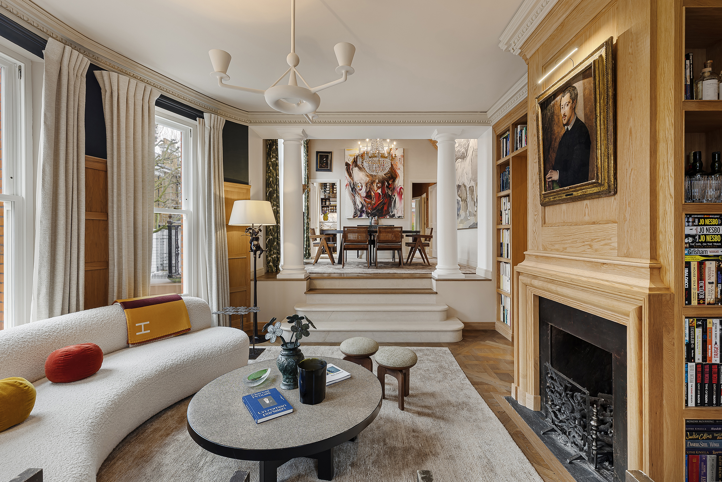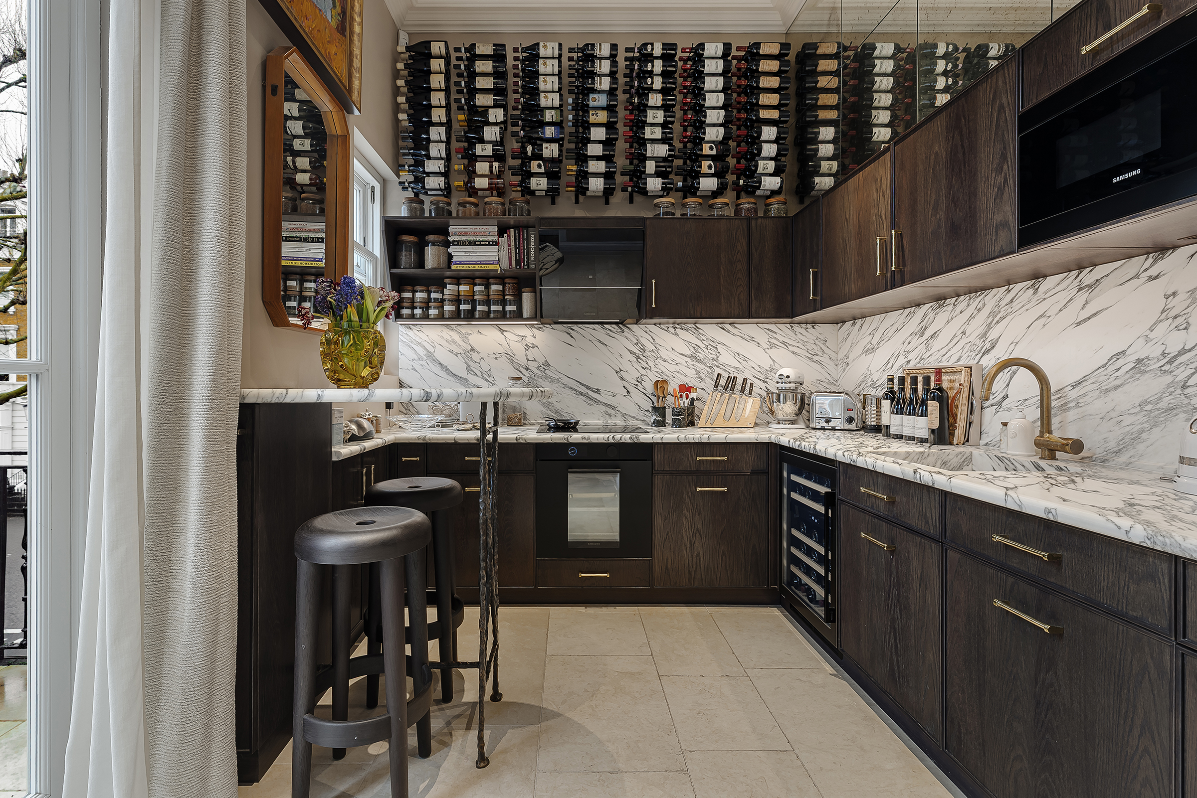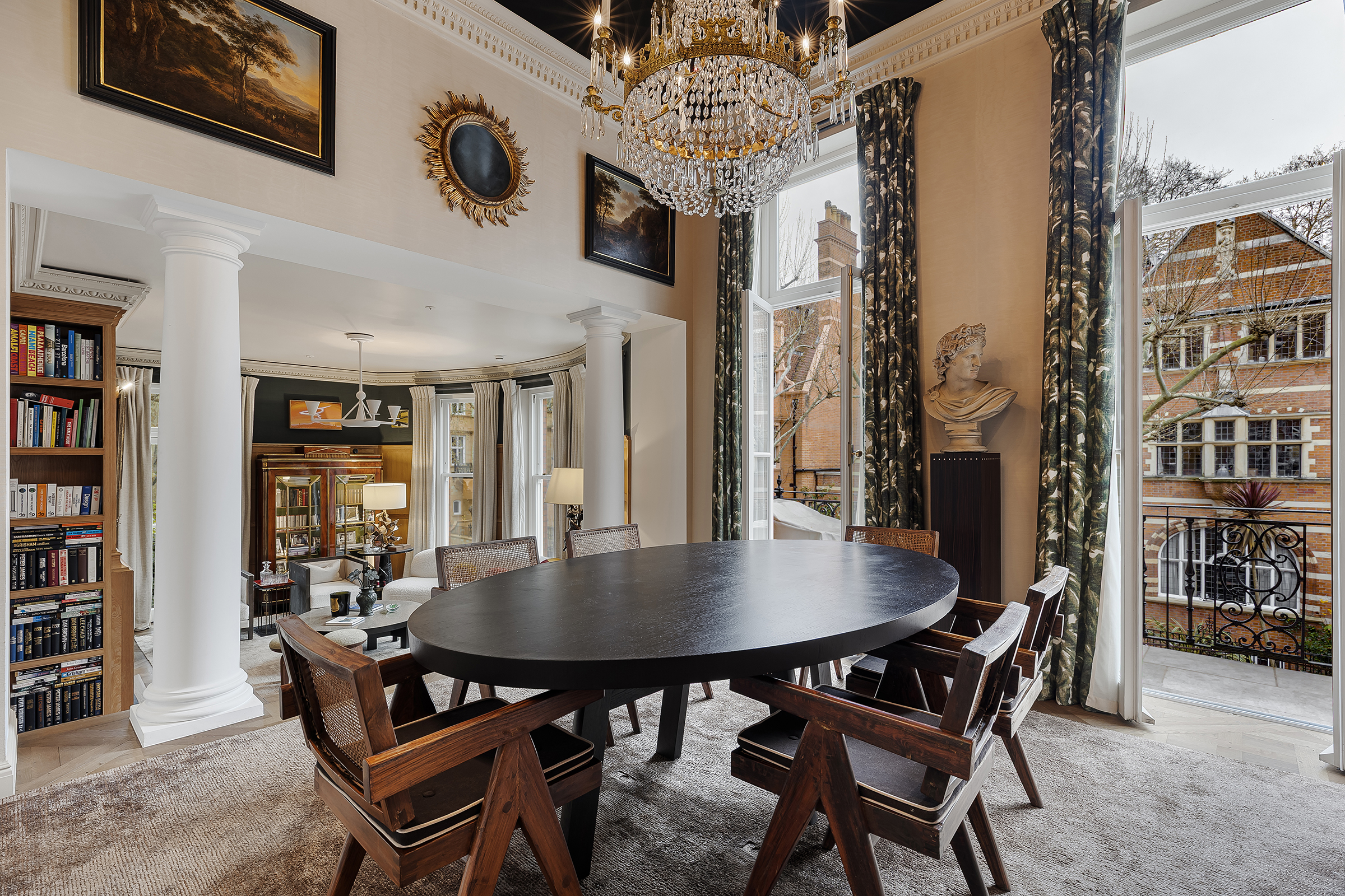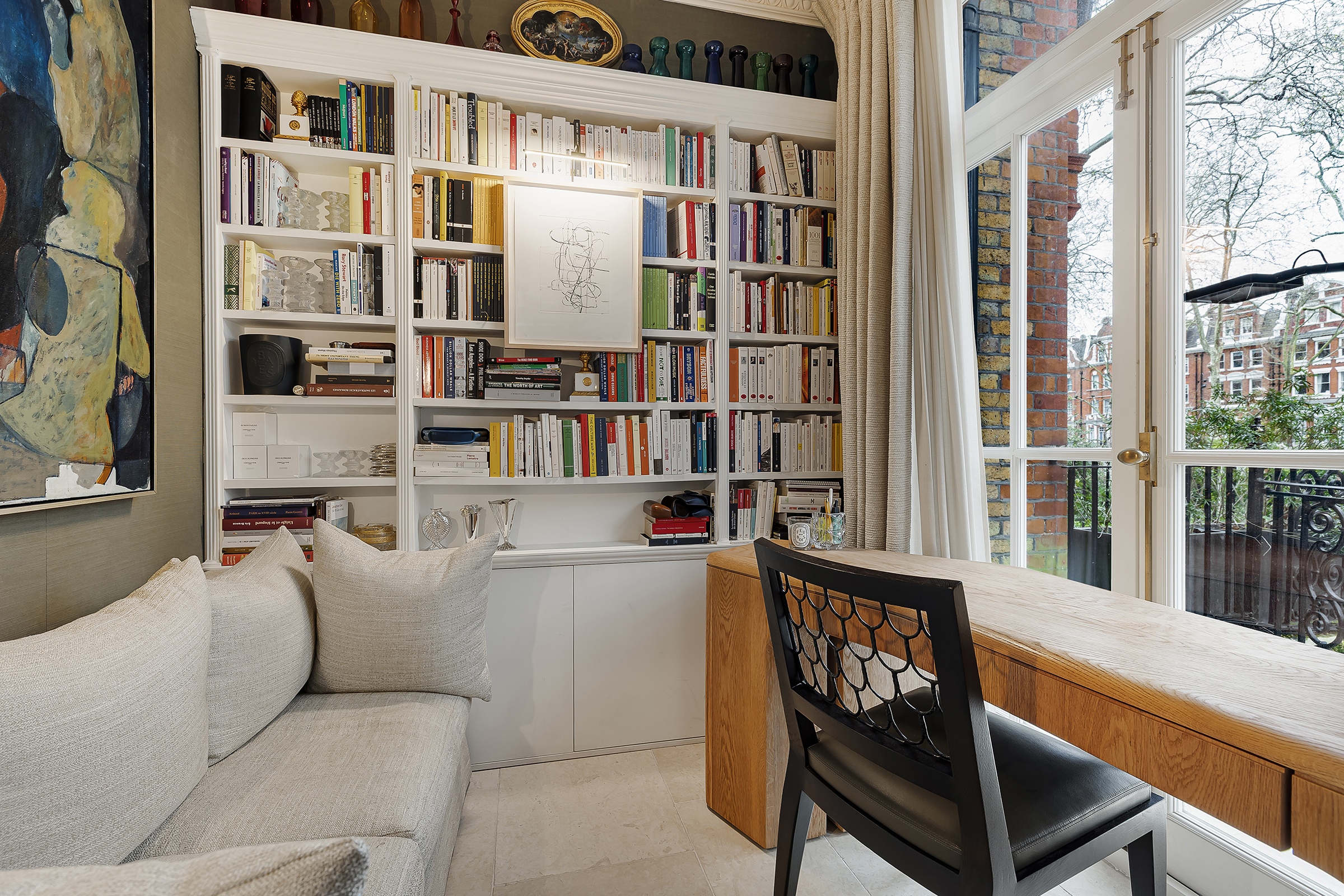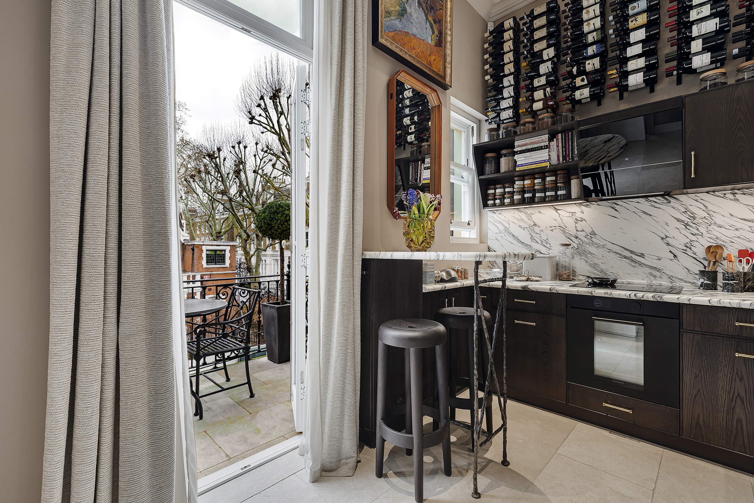 The kitchen sits just beyond, fully bespoke and thoughtfully designed, with marble splashbacks, a breakfast bar and French doors leading out to a second terrace. A separate study or library branches off from the main living space, offering a more intimate retreat.