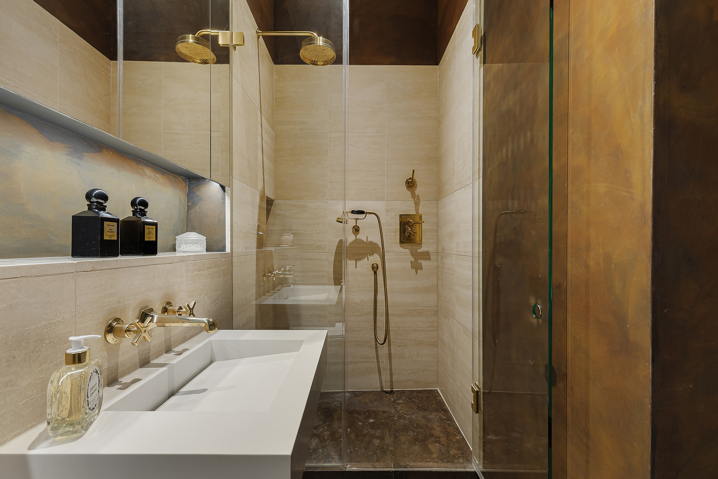 Three bedrooms are arranged across the plan, each with its own outlook and sense of privacy. The principal suite occupies its own floor, complete with a generous ensuite bathroom and excellent storage, giving it the feel of a self-contained sanctuary. Two further bedrooms share a well-appointed bathroom, both finished in keeping with the apartment’s cohesive design language.
