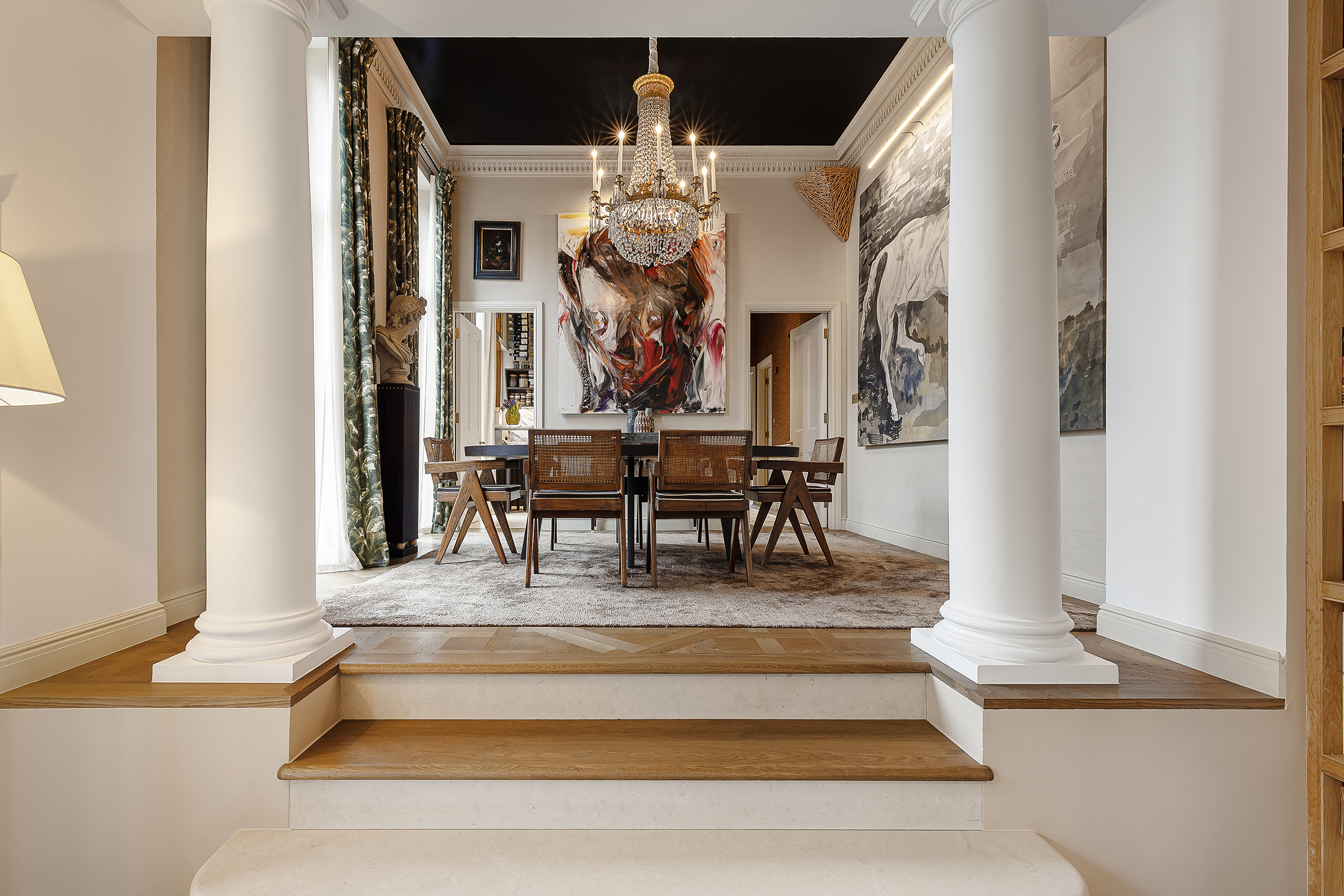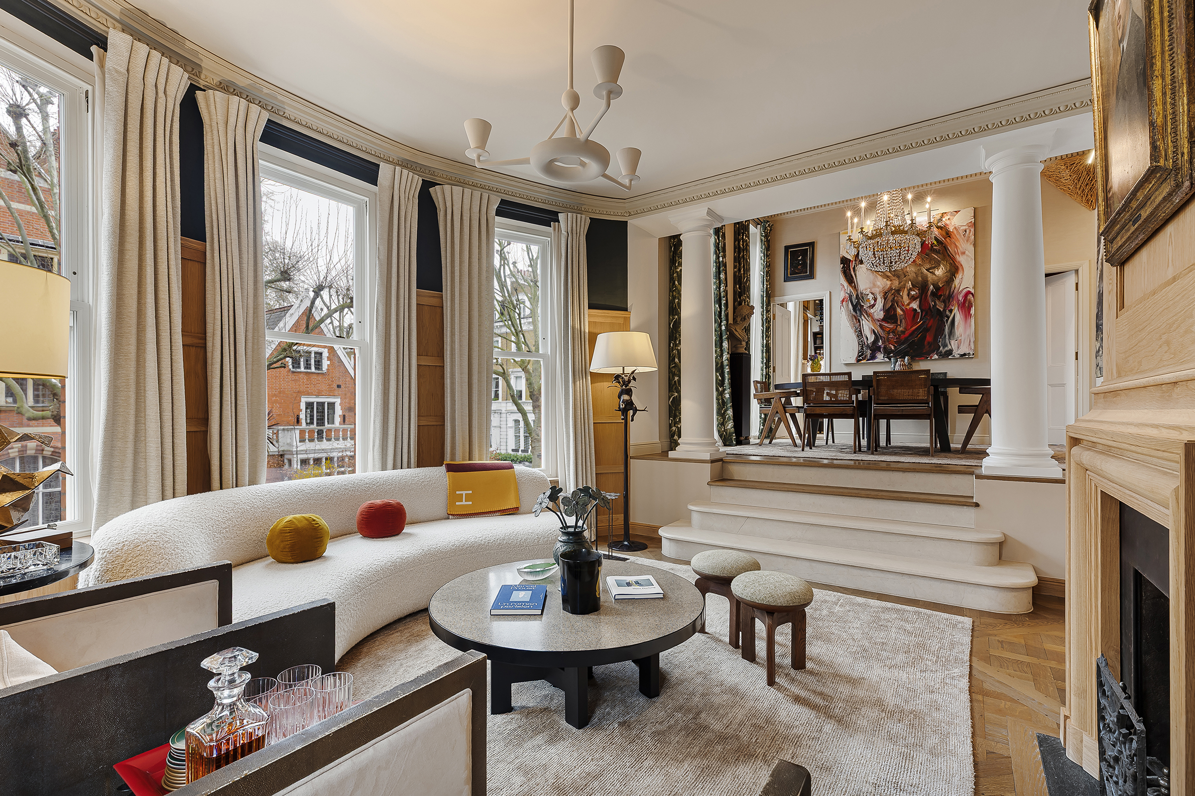 The reception room is the centrepiece. A wide splayed bay draws in soft garden light through three sash windows, framing leafy views across the communal square. A French door opens onto a private terrace, extending the room outward in the warmer months. High ceilings, intricate cornicing and a fireplace anchor the space, while the flow continues upwards via a gentle set of steps into the dining room, creating a sense of occasion between the two areas.
