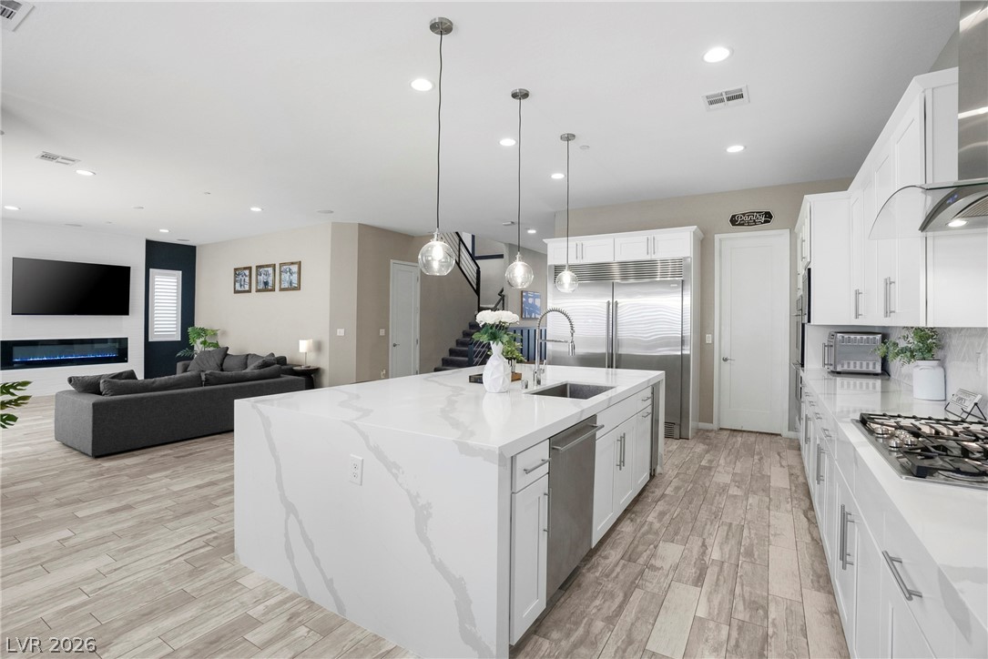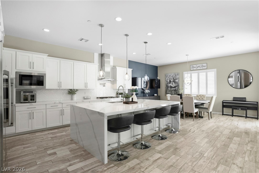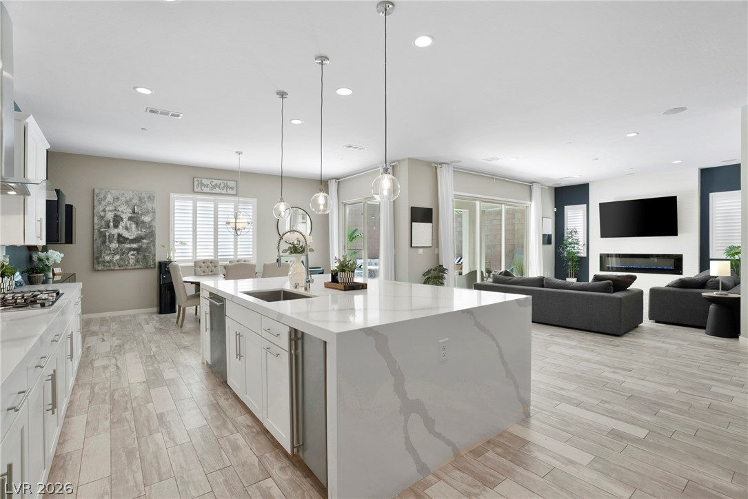 This is the one buyers dream about - where luxury, design, and location come together. Located in a highly coveted gated Henderson community, this stunning 5-bed, 4-bath, and 3 car garage home offers 3,608 sq ft of upgraded living and shows like a model. The open layout features shutters throughout, 10ft ceilings, custom accent wall features, a gourmet kitchen w/ quartz counters, a large island w/ waterfall edges, built-in fridge/freezer, double ovens, gas cooktop, and a huge walk-in pantry. The family room boasts a sleek fireplace and triple sliders for seamless indoor-outdoor living. Step into a private, secluded backyard oasis w/ a sparkling pool, spa, and covered patio - perfect for relaxing or entertaining. A downstairs bedroom and full bath add flexibility, while upstairs offers a large loft w/ surround sound, spacious secondary bedrooms including 1 w/ an en suite bathroom, and a luxurious primary suite w/ balcony, spa-like bath, soaking tub, oversized shower, and huge walk-in closet