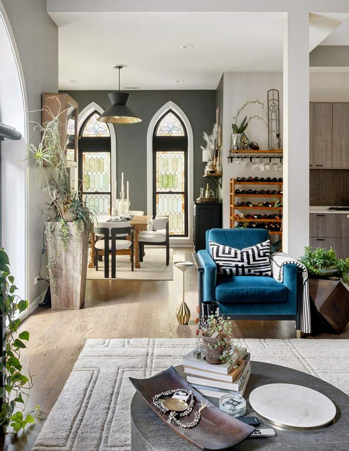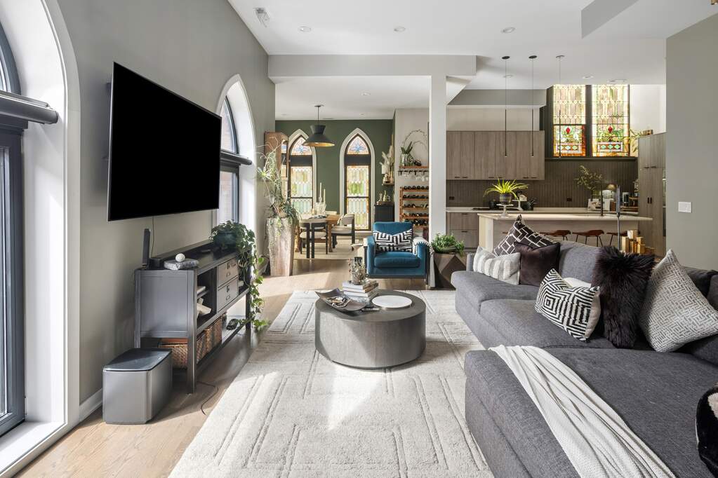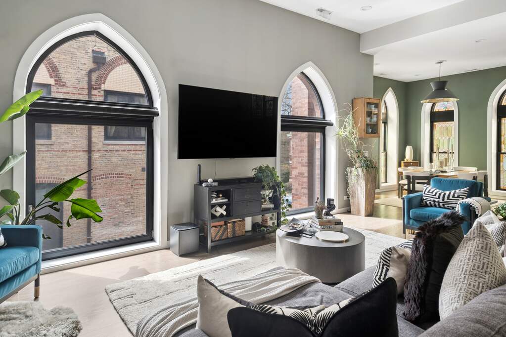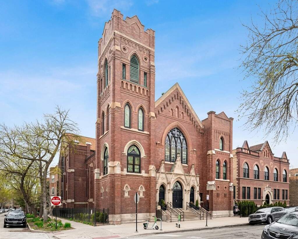 Experience The Revival Condos - a 2020 9-unit church conversion, that maintains its historic charm, while oozing modern luxury and well laid out spaces. This duplex up stuns with its BEAUTIFUL (operable) stained glass windows, 3 beds up, 3 full baths, and hardwood floors throughout. The first level features a massive kitchen with custom Italian cabinetry, Bosch appliances, soaring ceilings, and a deeply jewel toned stained-glass window that shoots up the steeple! Enjoy a dedicated dining space bathed in a corner of warm glowing stained glass, an open living room, and a fully customized 4th bedroom that has been converted into a luxe built-out office suite with architecturally stunning swinging glass enclosure. All peaked windows on this level are fully operable and all contain electronic shades. First floor also features a full bathroom with walk-in shower. Upper level features 3 bedrooms with custom closets, beautiful skylights, 3rd full bath, and washer dryer. The primary suite features a large walk-in closet that has been completely built-out, and matching floor to ceiling custom cabinetry in the bedroom for shoe and additional clothing storage. Additional nook in primary bed for a work/ exercise/ reading space. Primary bath features a massive shower with rainfall and hand held sprays - AND stained glass window views! Beautiful natural stone throughout, double vanity, separate water closet, and tons of space for additional storage pieces. Attached garage features a personal EV charger for this space. Charming brick paved terrace with 2 grills, dining setting, 2 lounge settings and 2 fire pits - fully enclosed and privatized by towering arbor vitae. This unit also features private building roof rights. All this, PLUS a fantastic UK Village/ West Town location with great access to Chicago Ave and Division St shopping and dining, buses, Blue Line, Mitchell and LaSalle II schools, and 90/94.