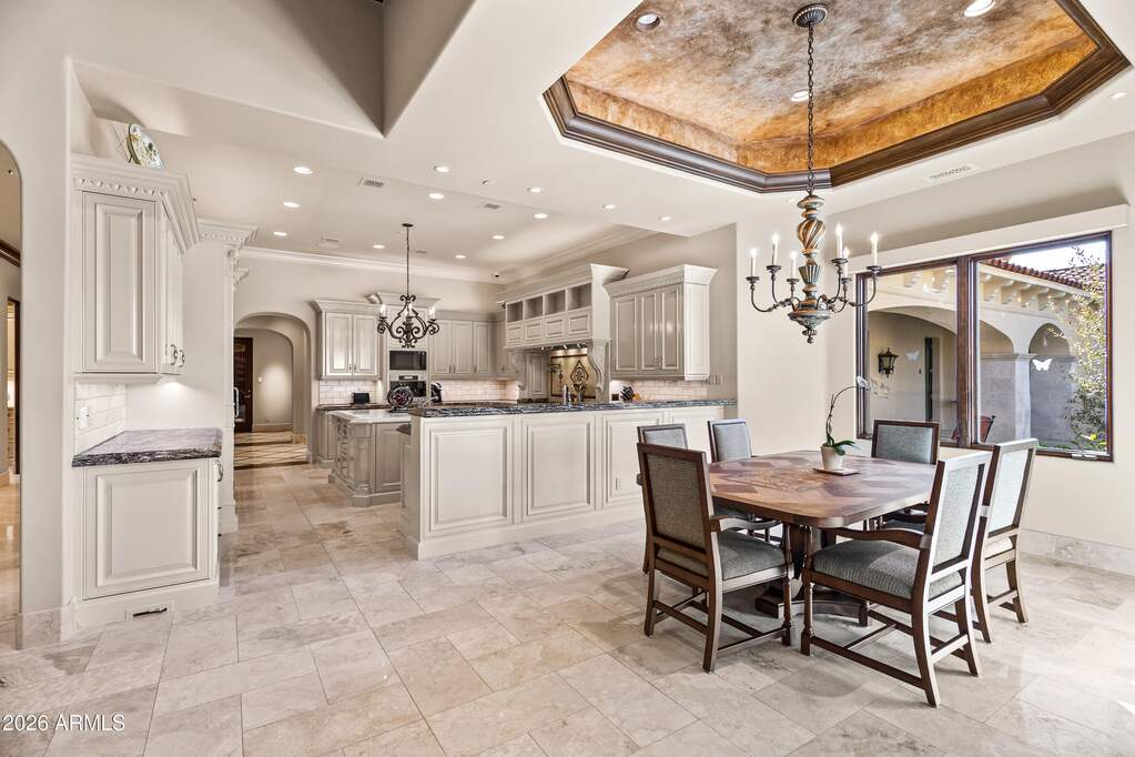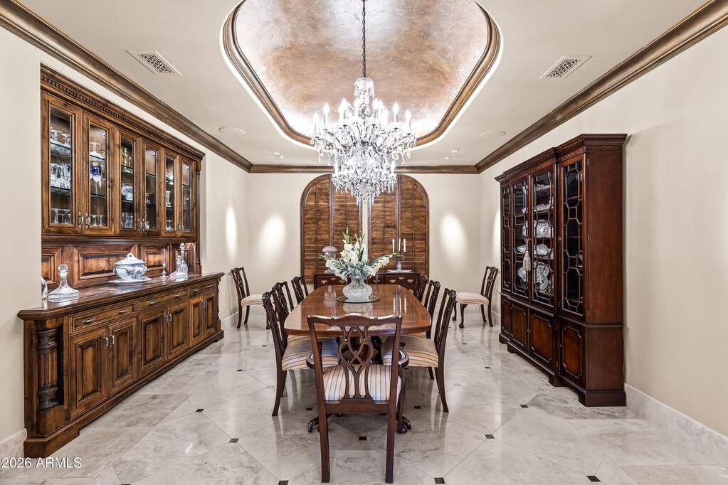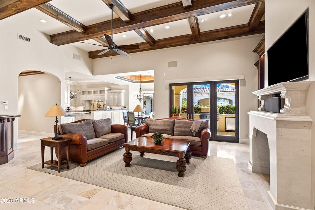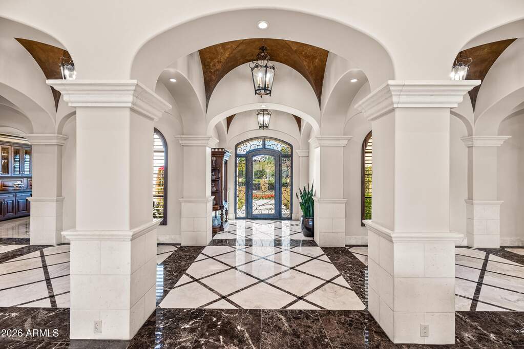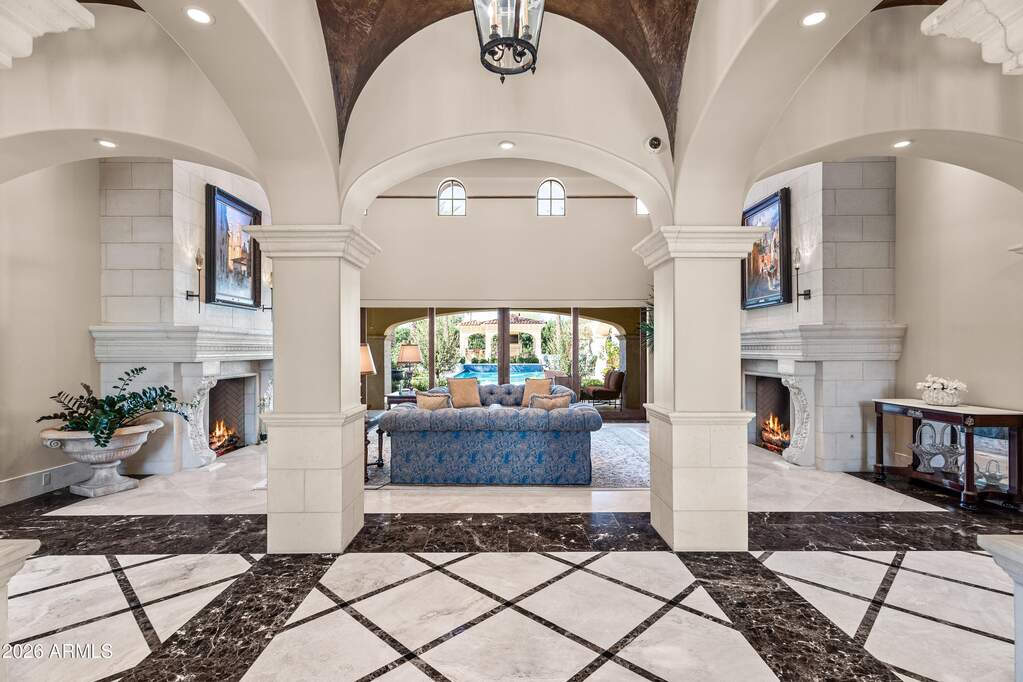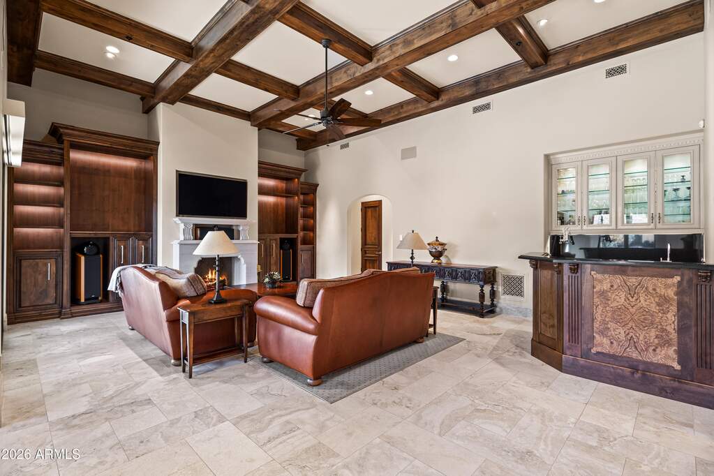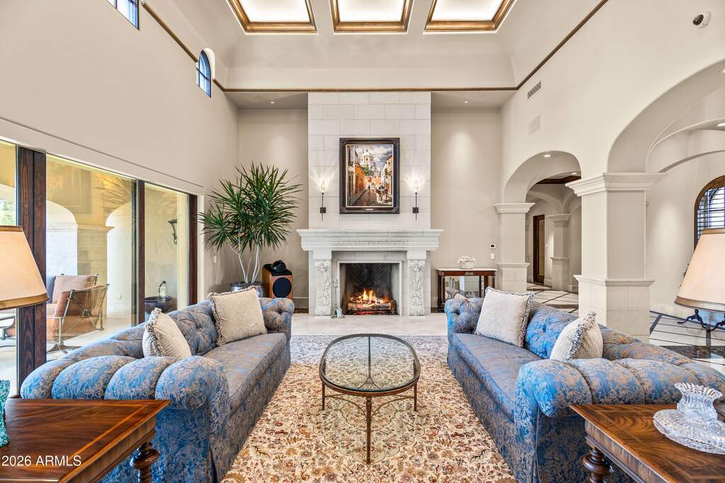 Premier 1-acre lot with breathtaking Camelback Mountain views. Experience elevated desert living in this gated Paradise Valley estate, where architectural details abound: soaring ceilings, arched entryways, multiple gas fireplaces, and stunning ceiling treatments featuring skylights, wood paneling, and exposed beams. The main residence offers an expansive open-concept layout with a grand great room, formal dining area, and a private study with custom built-ins. Entertain effortlessly with a chef's kitchen, wet bar, wine cellar, and game room, or unwind in the dedicated exercise room complete with sauna. A detached casita provides exceptional flexibility and privacy, featuring its own living room with fireplace, full kitchen, and bedroom with en-suite bath-ideal for guests or extended stay. Step outside to an extraordinary backyard retreat showcasing sweeping mountain views, tranquil fountains, and a custom pool and spa enhanced by dramatic fire and water features. Enjoy Arizona living at its finest with a ramada, covered patio, and private putting green-perfect for year-round relaxation and entertaining. Additional highlights include a 4-car garage and a premier location just minutes from world-class resorts, spas, golf, hiking, fine dining, and luxury shopping.