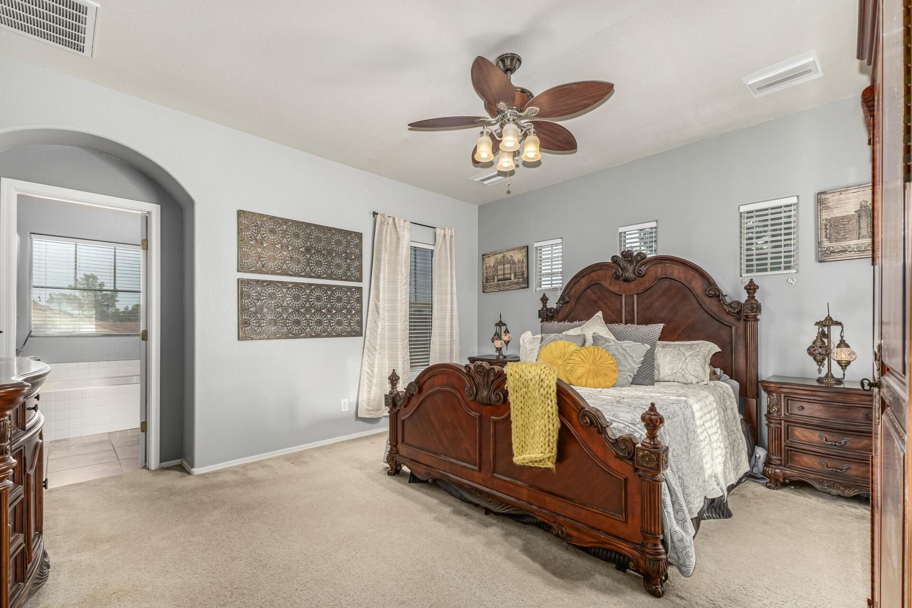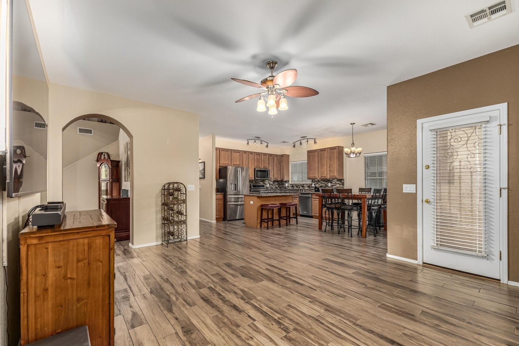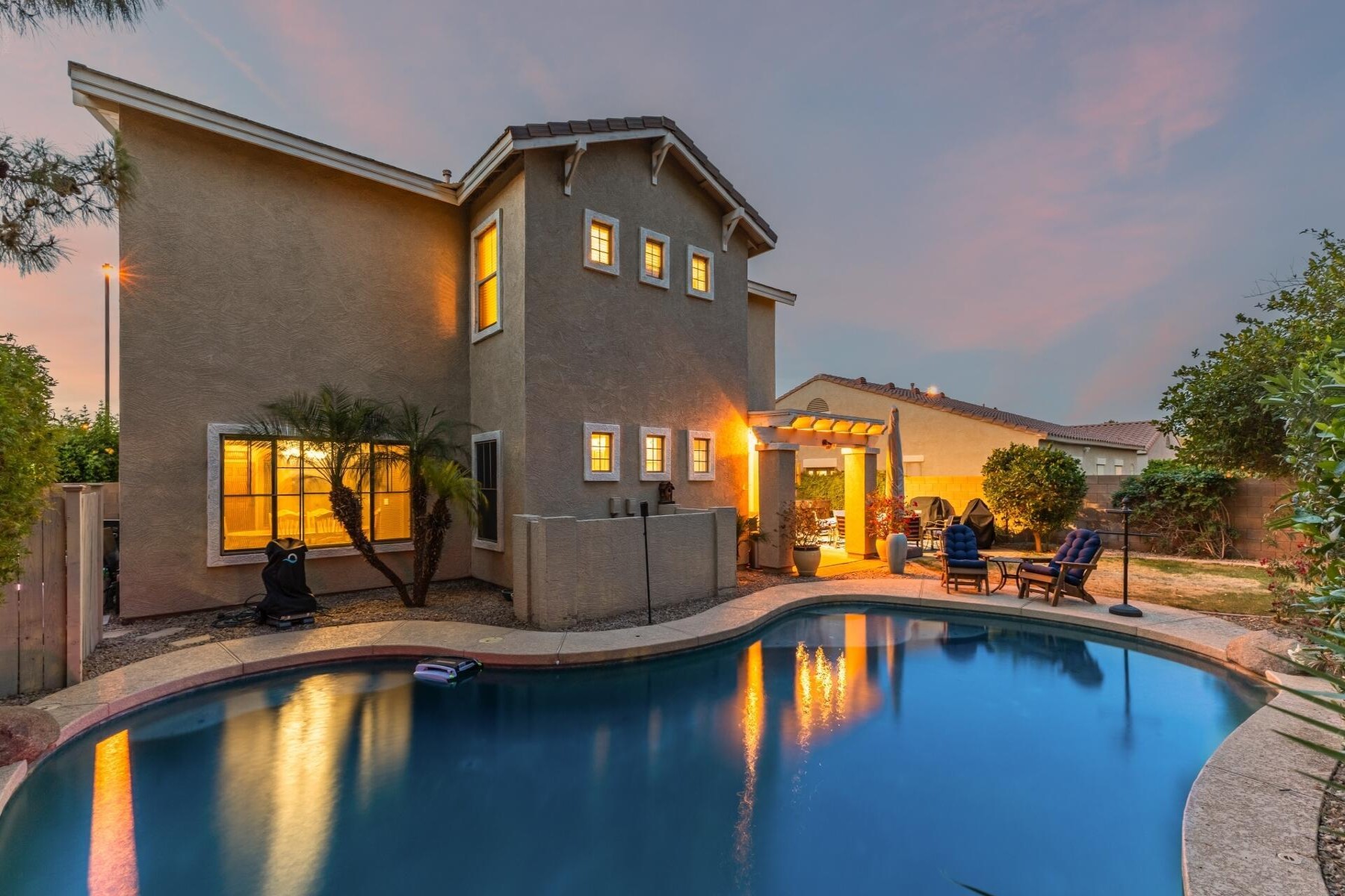 Welcome to this beautifully upgraded 6-bedroom, 3-bath home ideally located near the 202 and close by to so much including shopping and nearby restaurants. Spectrum is one of Gilbert's most sought-after communities with parks, tennis courts, and more. With only one single-story neighbor and no rear neighbor with a large green belt behind it also sits besides a children's play area, and close to school! The spacious backyard is an entertainer's dream, featuring a gorgeous pool, pavers, citrus and fruit trees, and lush grass. Inside, enjoy maple cabinets, granite countertops, tile flooring, upgraded appliances, a soft water loop, RV gate, and garage cabinets with built-in workbench.