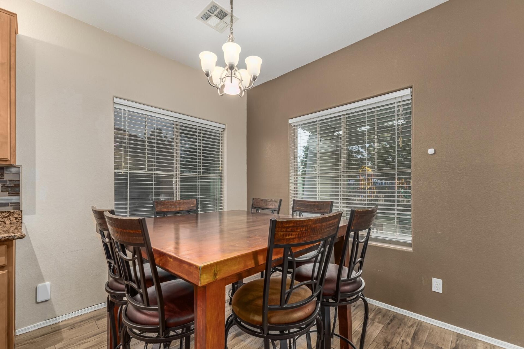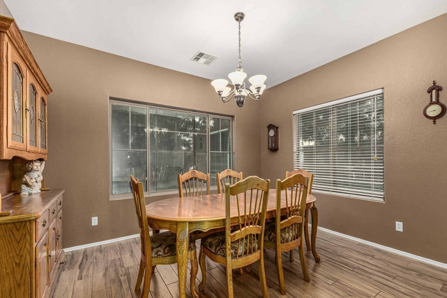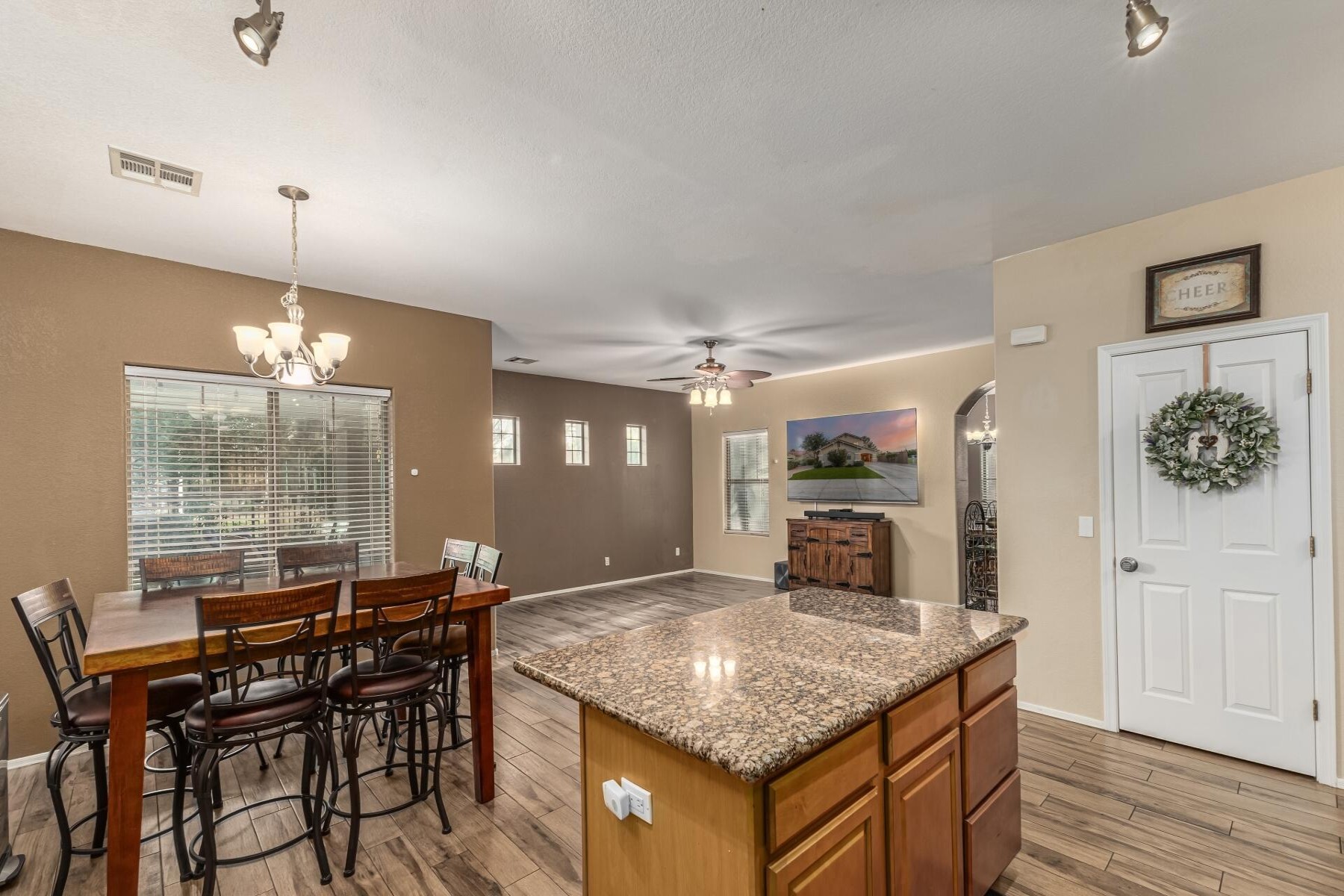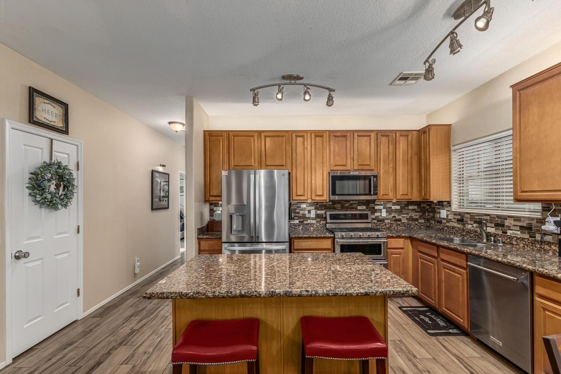 Welcome to this beautifully upgraded 6-bedroom, 3-bath home ideally located near the 202 and close by to so much including shopping and nearby restaurants. Spectrum is one of Gilbert's most sought-after communities with parks, tennis courts, and more. With only one single-story neighbor and no rear neighbor with a large green belt behind it also sits besides a children's play area, and close to school! The spacious backyard is an entertainer's dream, featuring a gorgeous pool, pavers, citrus and fruit trees, and lush grass. Inside, enjoy maple cabinets, granite countertops, tile flooring, upgraded appliances, a soft water loop, RV gate, and garage cabinets with built-in workbench.