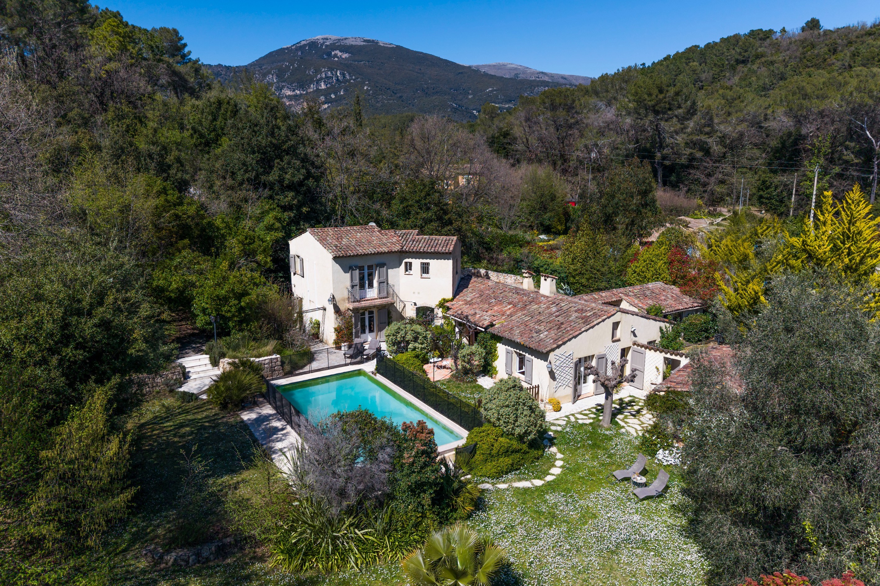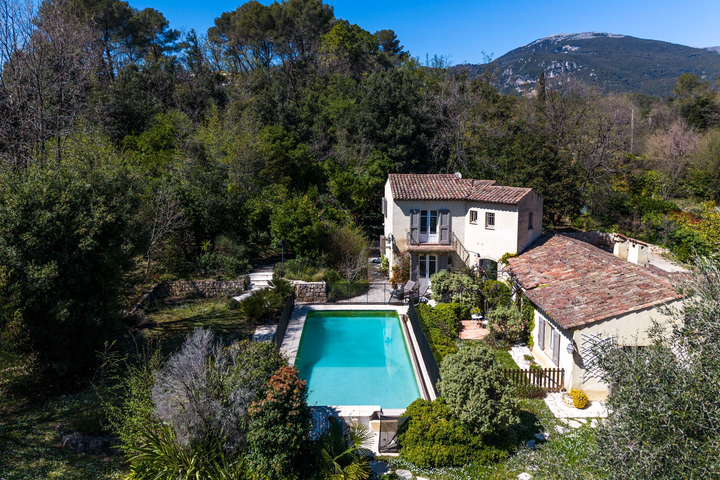 Roquefort les Pins villa 3 bedroom 3432 sqm land infinity pool buildable plot near Valbonne international schools French Riviera Located in Roquefort-les-Pins, this Provençal villa is set on approximately 3,432 sqm of land in a quiet residential environment with open views over the surrounding hills and forest. The property includes a bright living area with cathedral ceiling and fireplace, a semi open kitchen with dining area, a study space, utility room and laundry. The ground floor features a master bedroom with en suite bathroom and direct garden access. The upper level includes two additional bedrooms with a shared shower room. An independent outbuilding currently used as an office can be converted into a guest room or studio. Features include air conditioning, wine cellar and storage spaces. The landscaped grounds include an infinity pool with counter current system, terraces, pool house, summer kitchen with pizza oven and pétanque court. Parking for approximately 6 vehicles. A buildable section of land offers development potential. Located close to shops, international schools, Valbonne and Sophia Antipolis. Suitable as a primary residence, second home or investment property, particularly for buyers seeking space and development potential on the French Riviera. Côte d’Azur Sotheby’s International Realty For further information or to arrange a private viewing, please contact Côte d’Azur Sotheby’s International Realty.