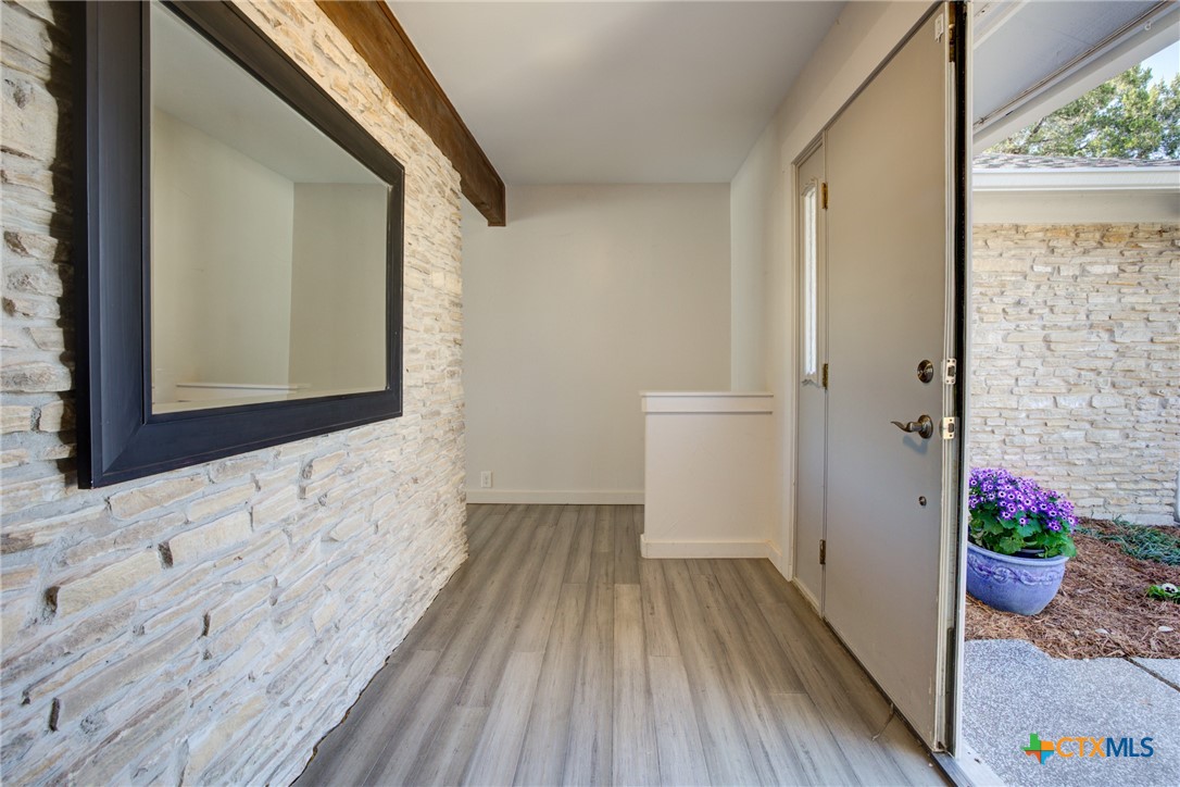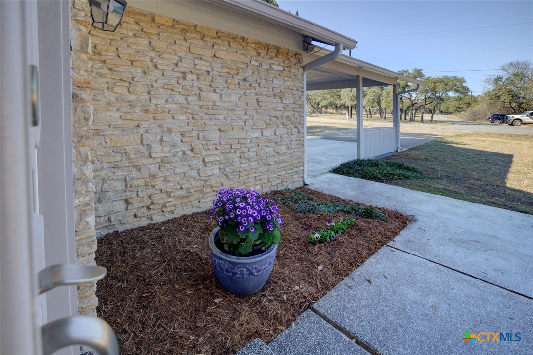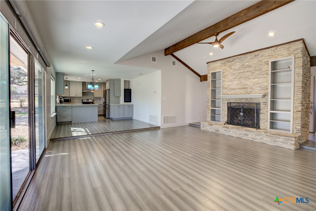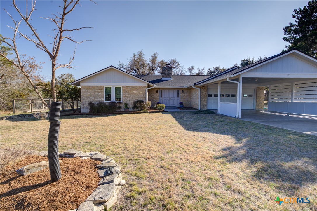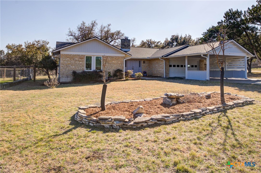 Sophisticated charm meets modern flair on over an acre of private, tree-lined paradise. Perfectly positioned on a prime corner lot in a coveted Hill Country community, this fully reimagined residence stuns with designer finishes, vaulted ceilings, and seamless indoor-outdoor living. Step into a light-filled, open-concept layout featuring a show-stopping stone accent wall, beamed ceilings, and a chef-inspired kitchen that flows effortlessly into the grand living and dining areas. The luxurious primary suite offers serene backyard views, a spa-like en suite with a soaking tub, and a beautifully tiled walk-in shower. Secondary bedrooms are bright and inviting with a chic guest bath to match. Outside, a newly built fence encloses the lush yard-ideal for pets and play-while a masonry firepit and covered patio invite unforgettable evenings under the stars. Energy-efficient upgrades, smart storage, and a 2-car garage with laundry pass-through.