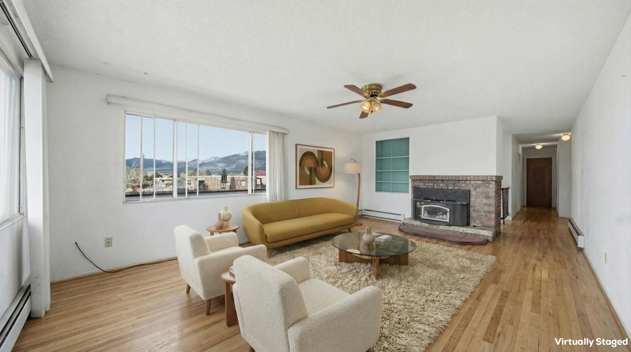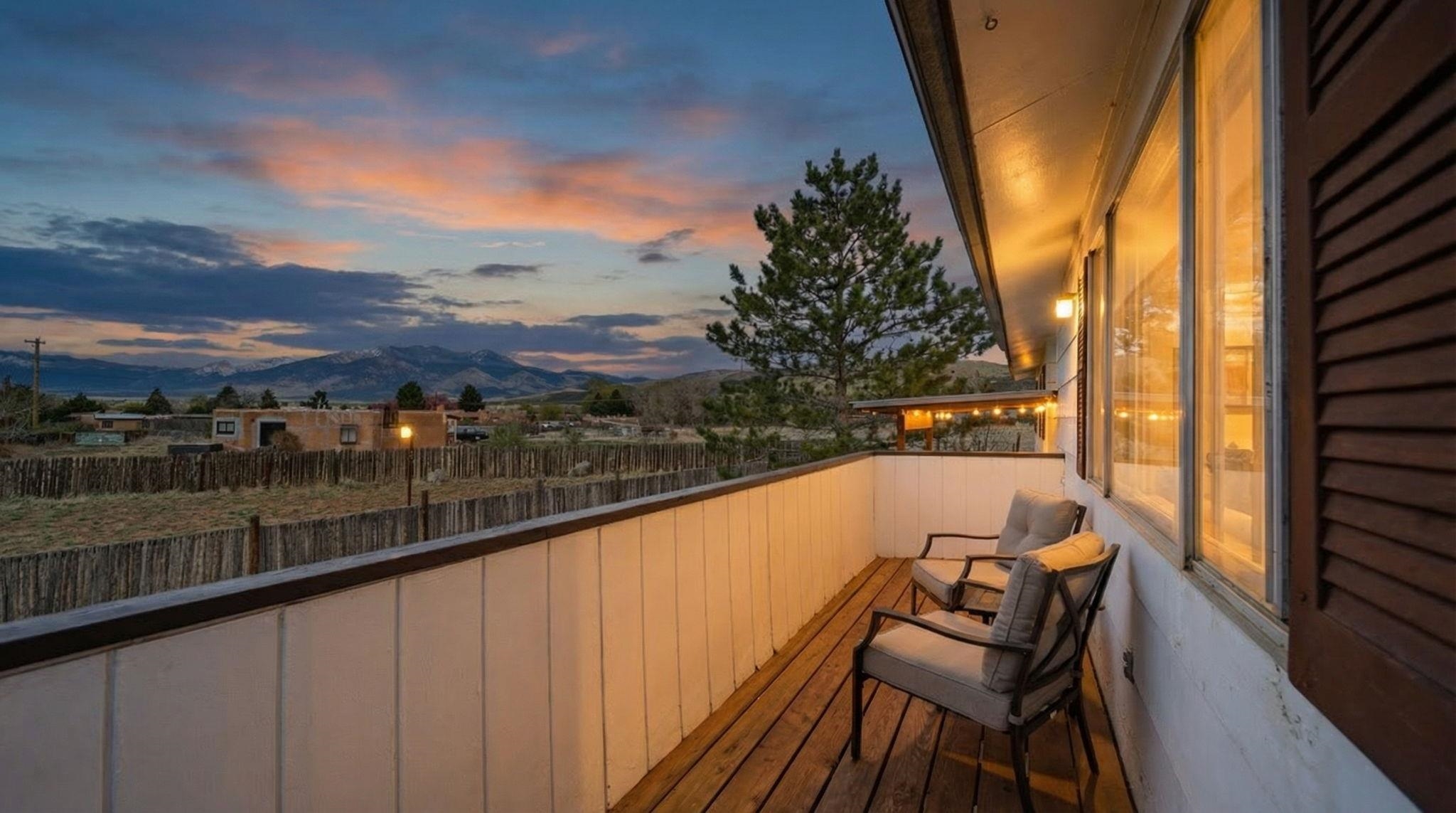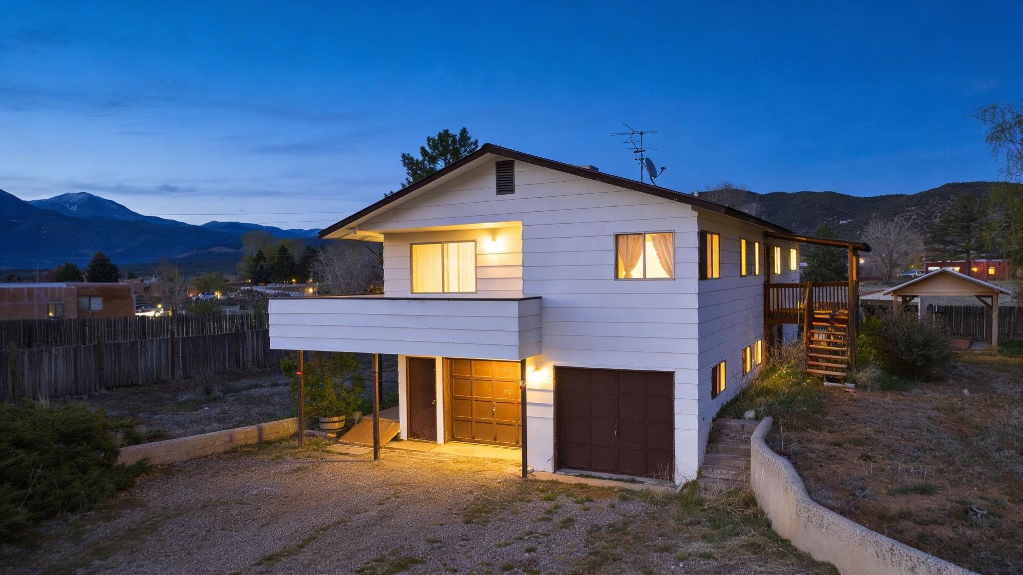 Classic Two-Story Taos Starter in Town ~ Tucked into one of the nicest, quietest, and most traditional neighborhoods in town, this two-story, five-bedroom, two-bathroom property is a fantastic starter home with the space to evolve alongside you. The upper-level deck takes full advantage of the surrounding landscape and dramatic mountain sunsets and sunrises. Outside, the large fenced yard features an authentic outdoor horno ready for baking, a treehouse to renovate for the kids, and plenty of open space with the real potential to expand into a large in-town garden or perhaps another home. Inside, the generous footprint provides serious flexibility, giving you plenty of room to set up a home office, art studio, yoga meditation space, or rooms to host family & guests, with a practical attached two-car garage. You get a highly convenient everyday balance here: the calm feel of a well-established street paired with quick access to local schools, nearby shopping, and an easy outlet to nature via the backroads for hiking, biking, skiing, fishing, hunting, and so on. Whether you want a spacious place to plant your roots right now or a property you can steadily transform over time, this home is a solid foundation.