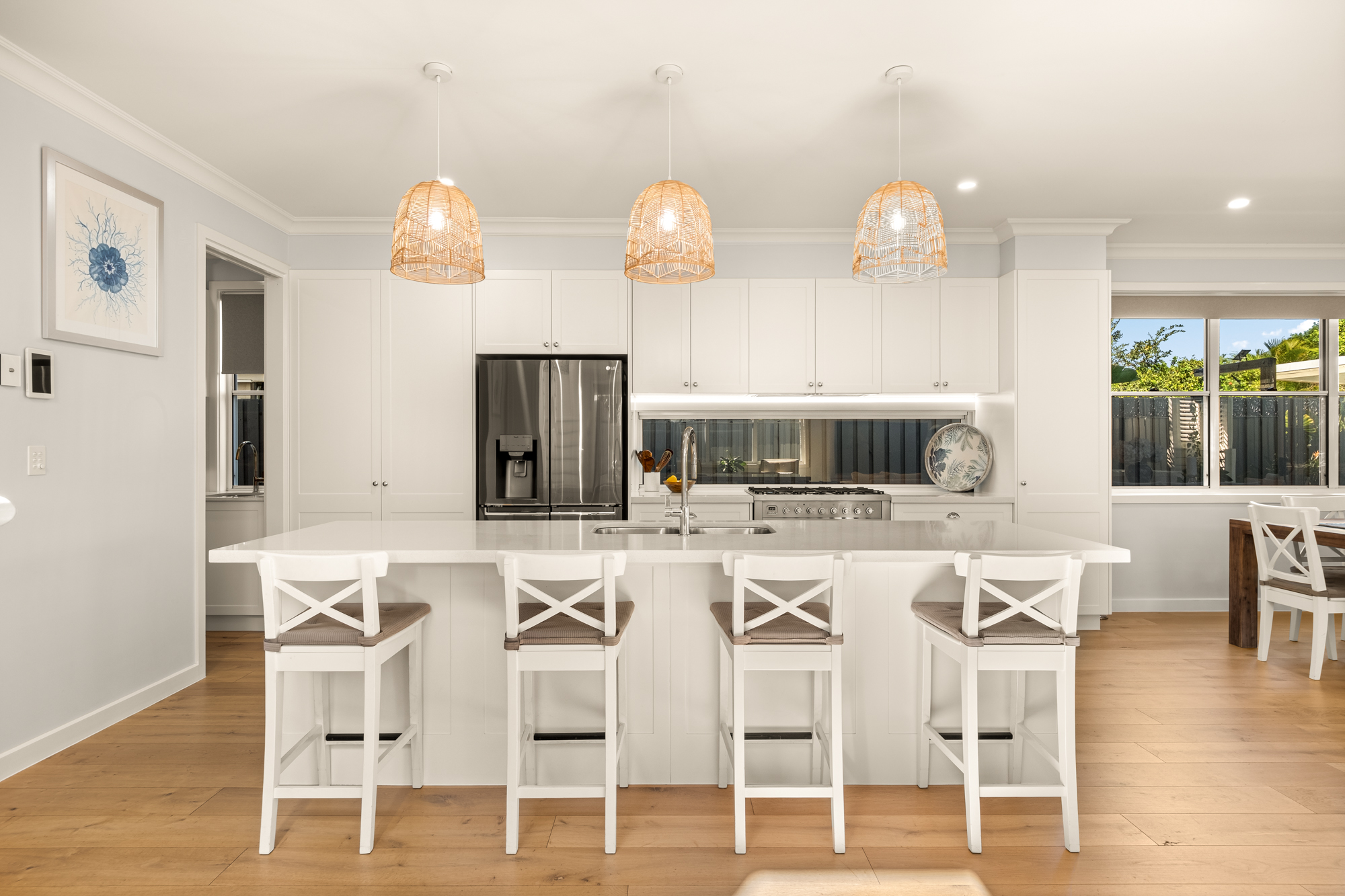 A Hamptons-style haven of undeniable warmth, this light-filled residence has been thoughtfully crafted for family functionality and easy entertaining. Enhanced by a neutral palette, VJ panelled walls, French Oak timber floors and high ceilings across two levels, it is spacious and soothing, with all five bedrooms nicely tucked away upstairs. Led by a sunlit master suite with dual walk-in robes and an elegant ensuite, it captures a lush, leafy outlook from a private balcony.