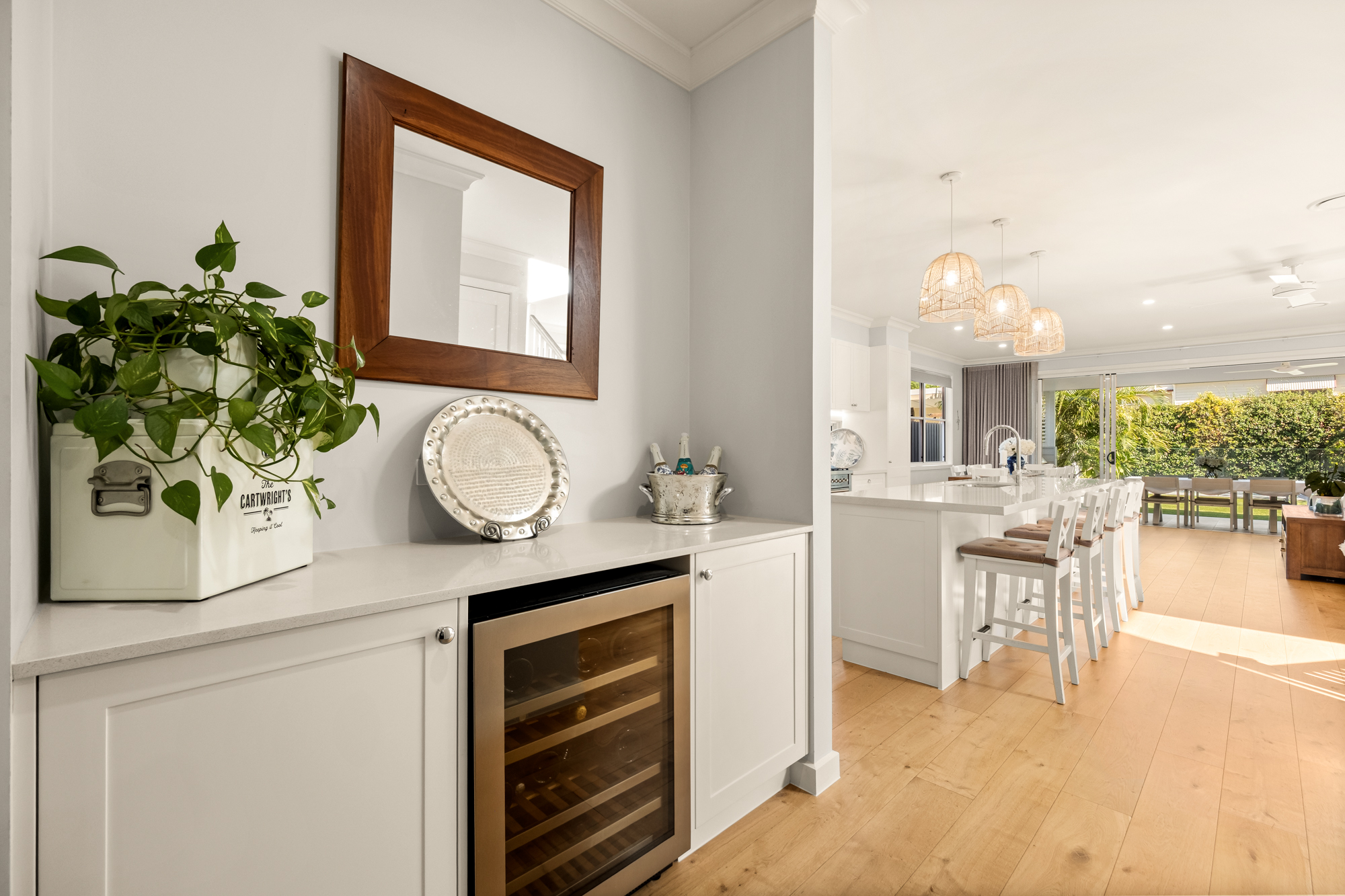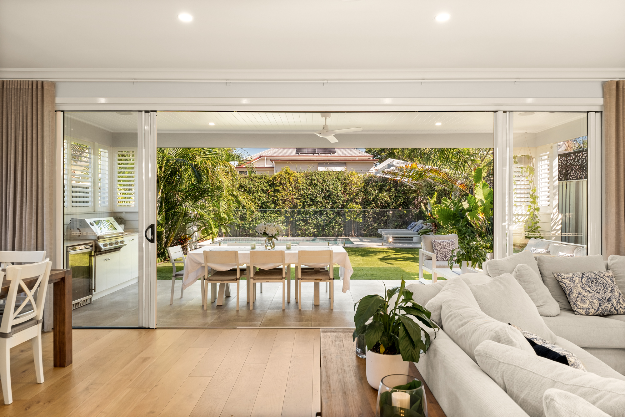 Boasting multiple relaxation zones, enjoy movie nights in the media room, give teens a place to retreat with an upstairs rumpus, while an expansive open plan kitchen, living and dining zone acts as the beating heart. Beautifully appointed with stone benchtops, premium appliances and a butler’s pantry, vast stacker sliding doors seamlessly dissolve the boundaries between indoors and the alfresco terrace with a built-in BBQ. Host gatherings here or at sunset savour the glow of the sky through the palms. The tropical holiday ambience continues with a sparkling saltwater pool and arboured pavilion, plus embrace the pure privacy of the backyard, framed by a natural green screen.