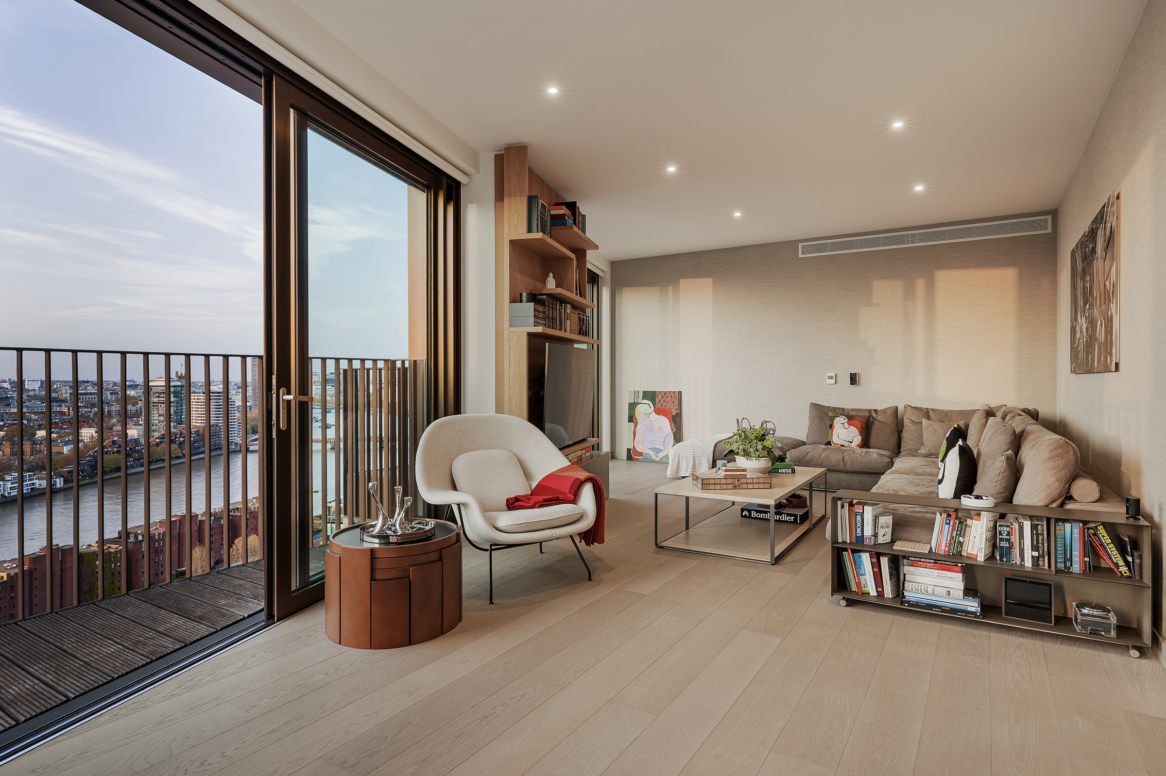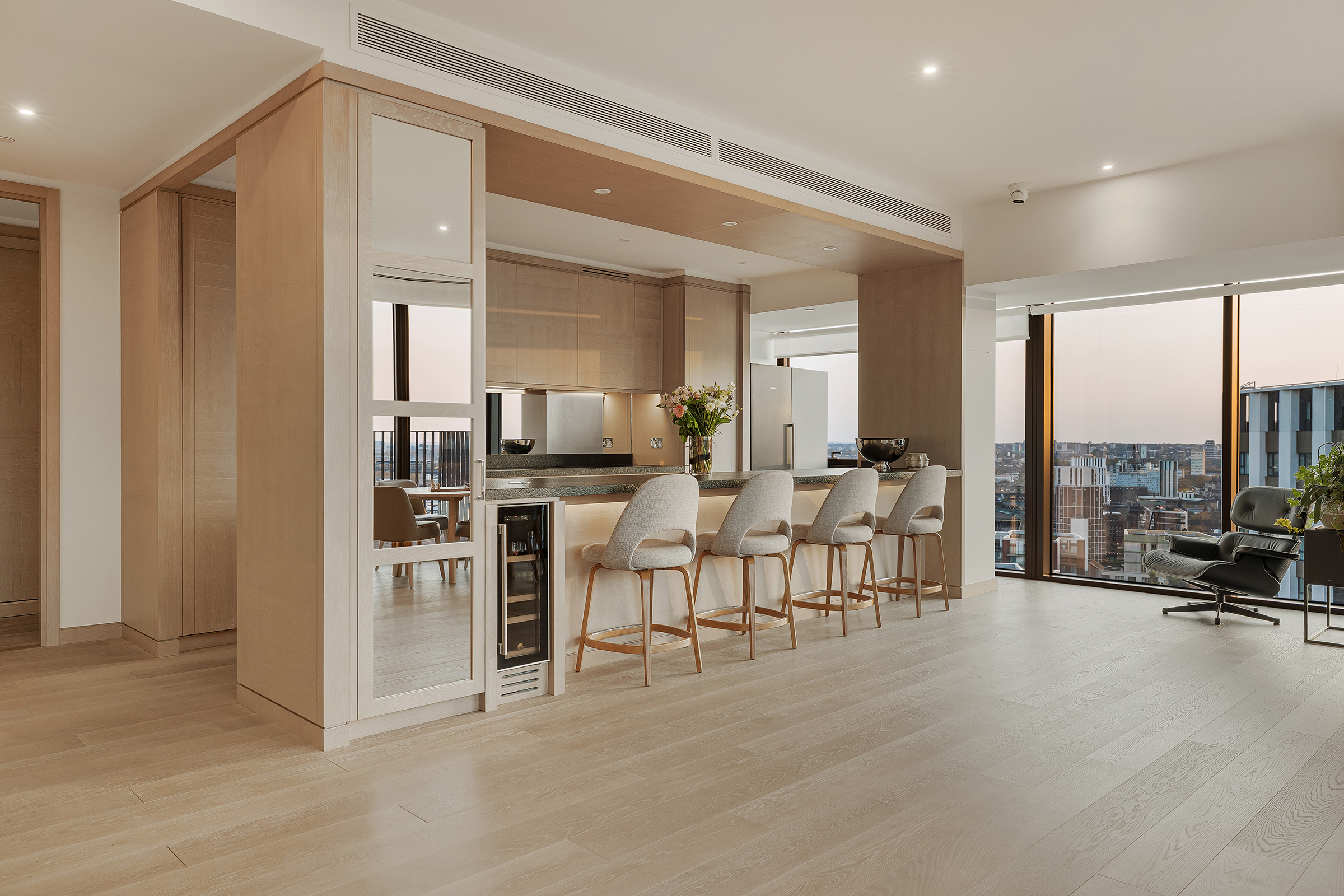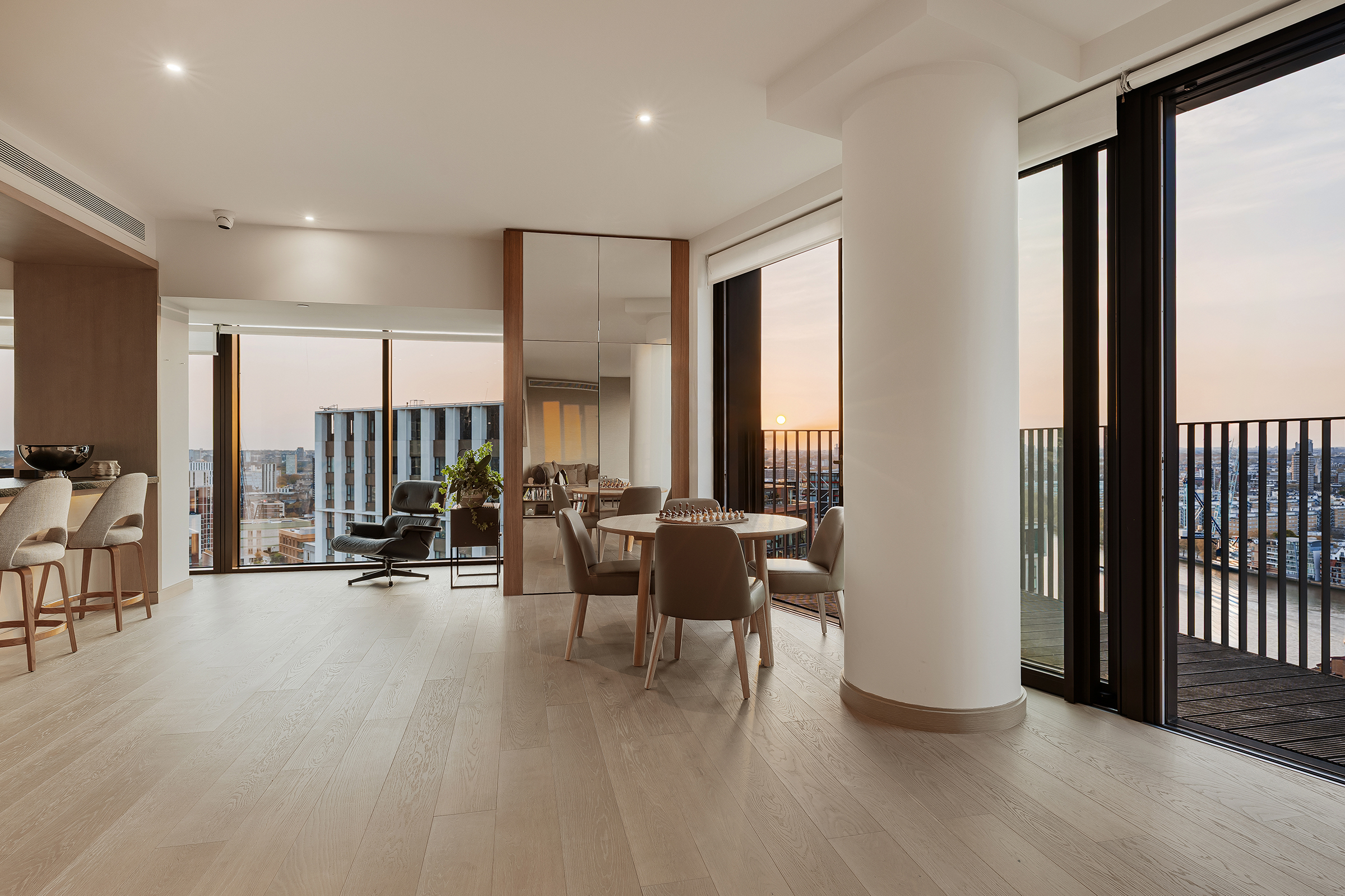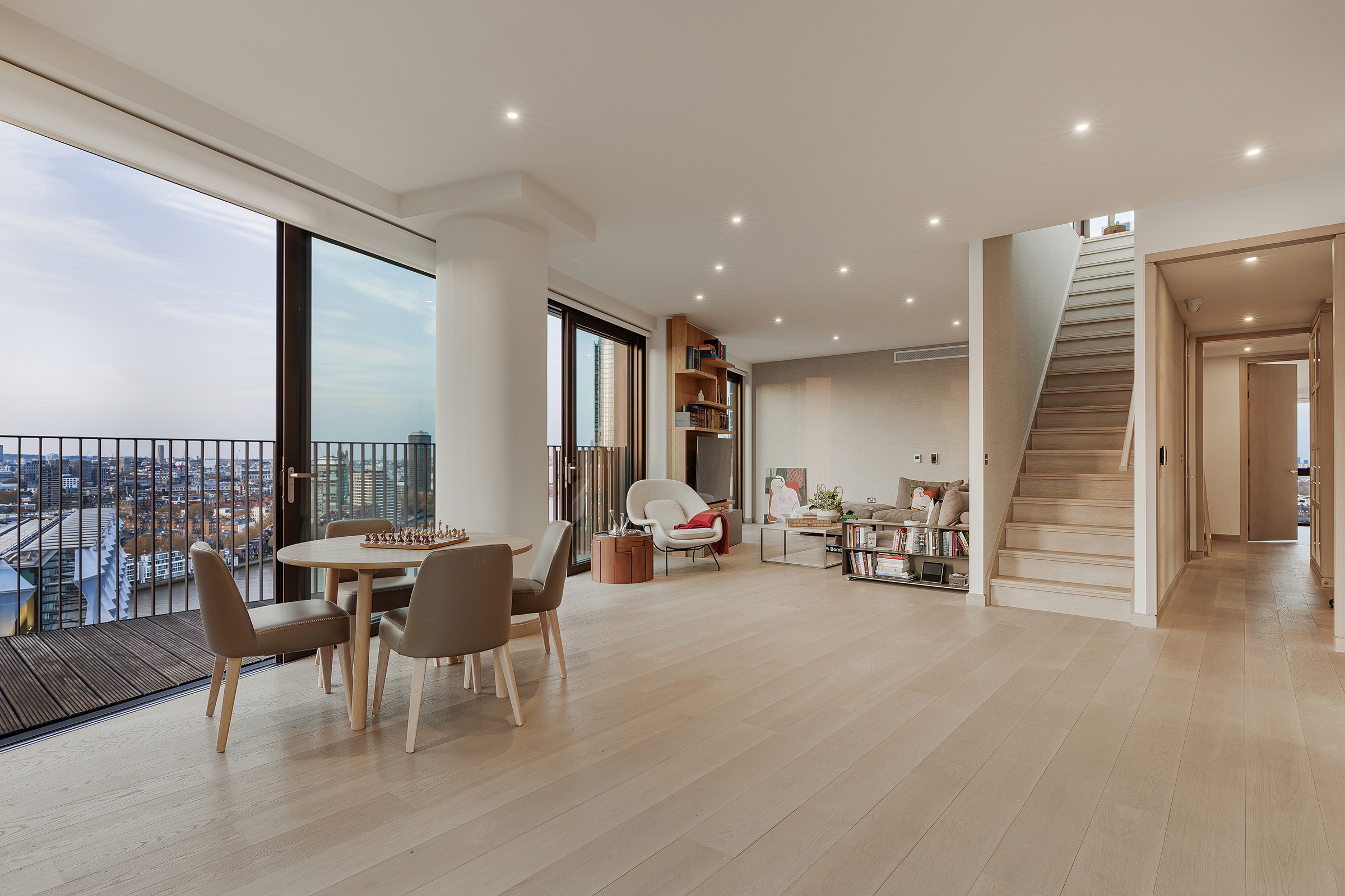 High above the Thames in the Legacy Building at Embassy Gardens, this three-bedroom duplex penthouse unfolds across the twenty-second and twenty-third floors, with far-reaching views that stretch across the river and deep into the London skyline. The sense of elevation is immediate, with light pouring in from multiple aspects and the city forming a constant, shifting backdrop.