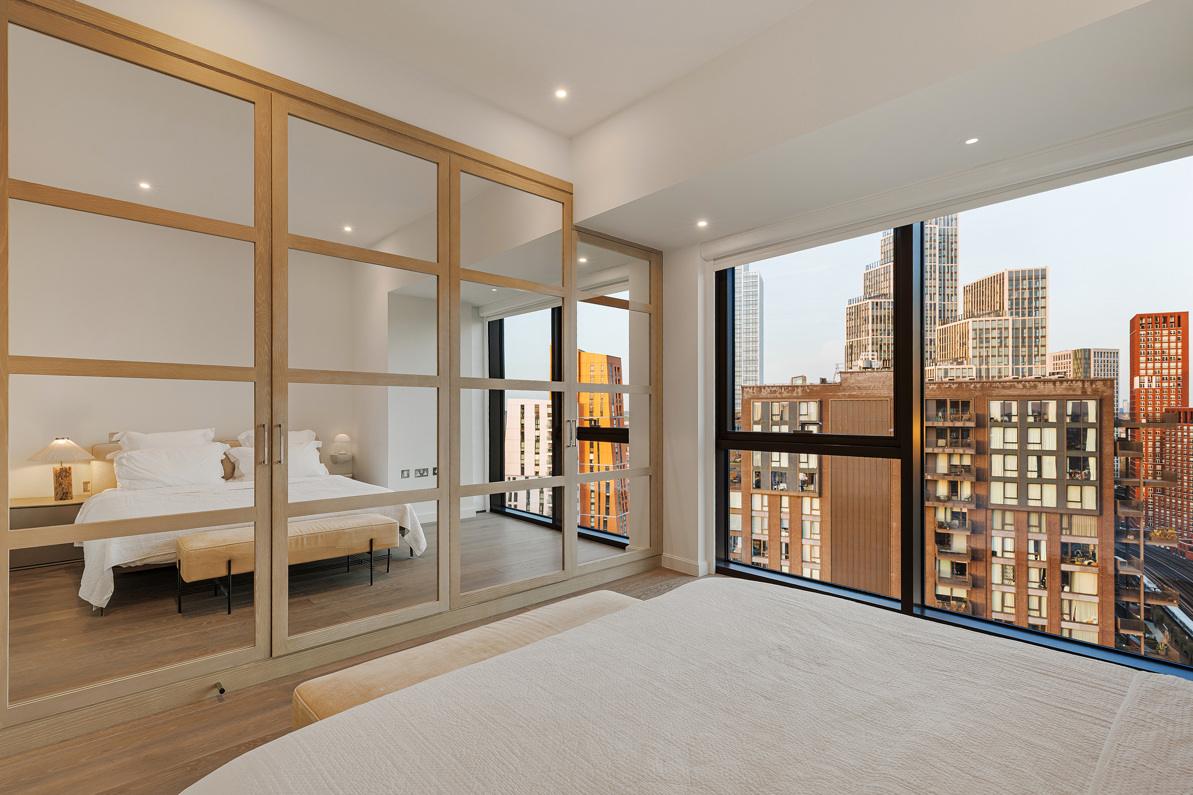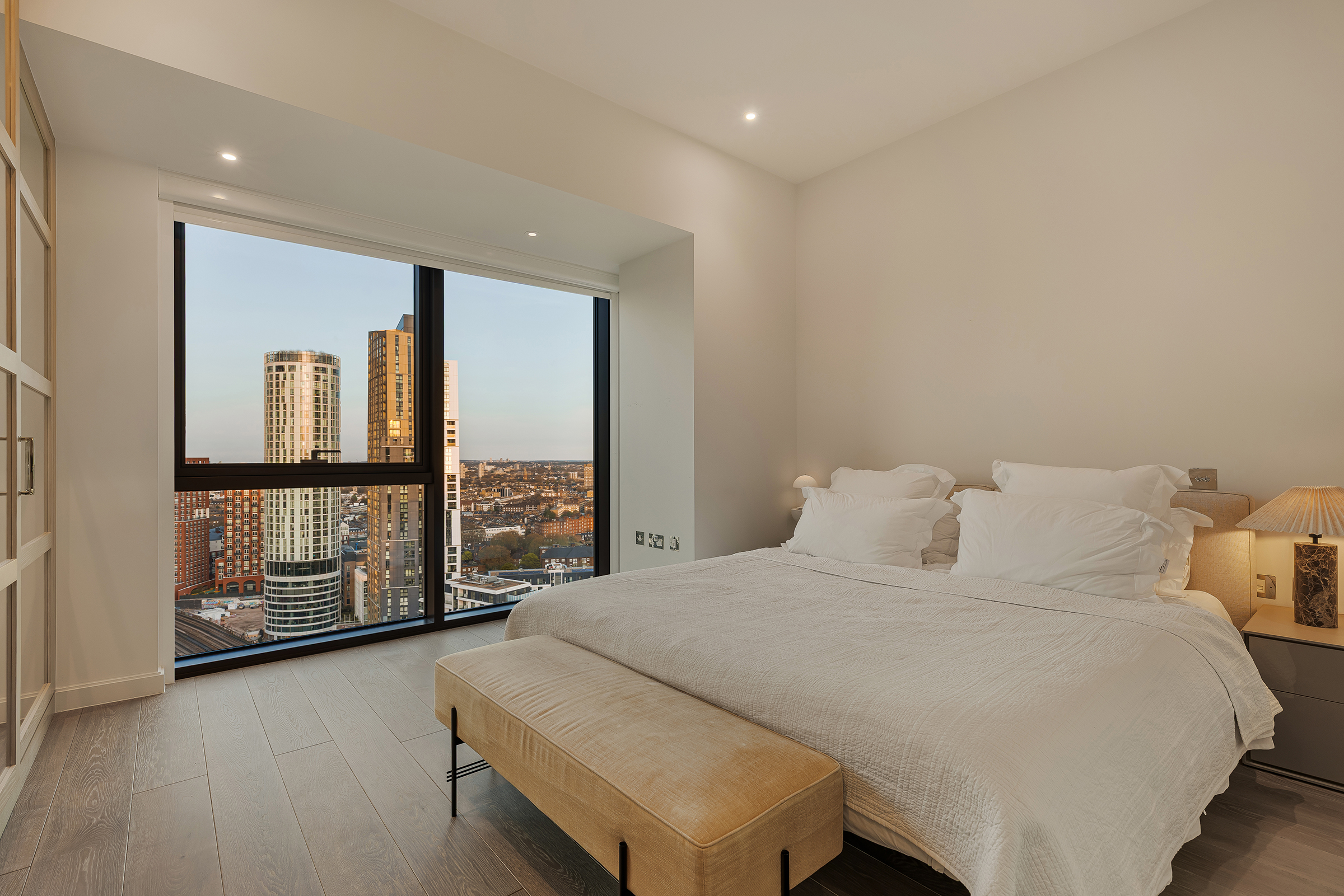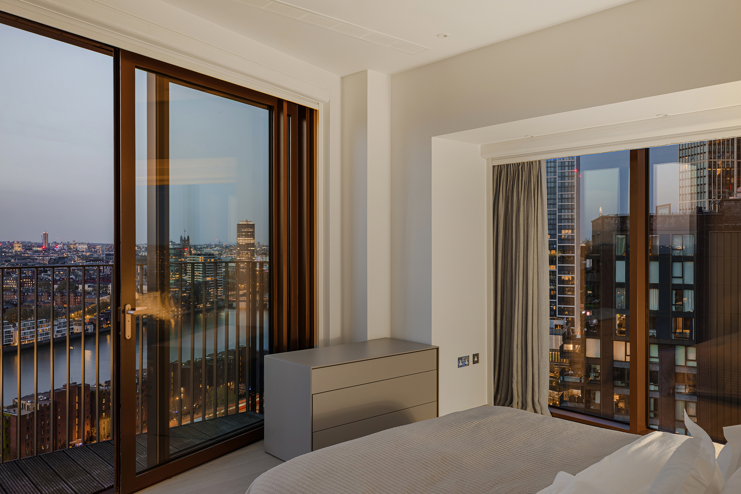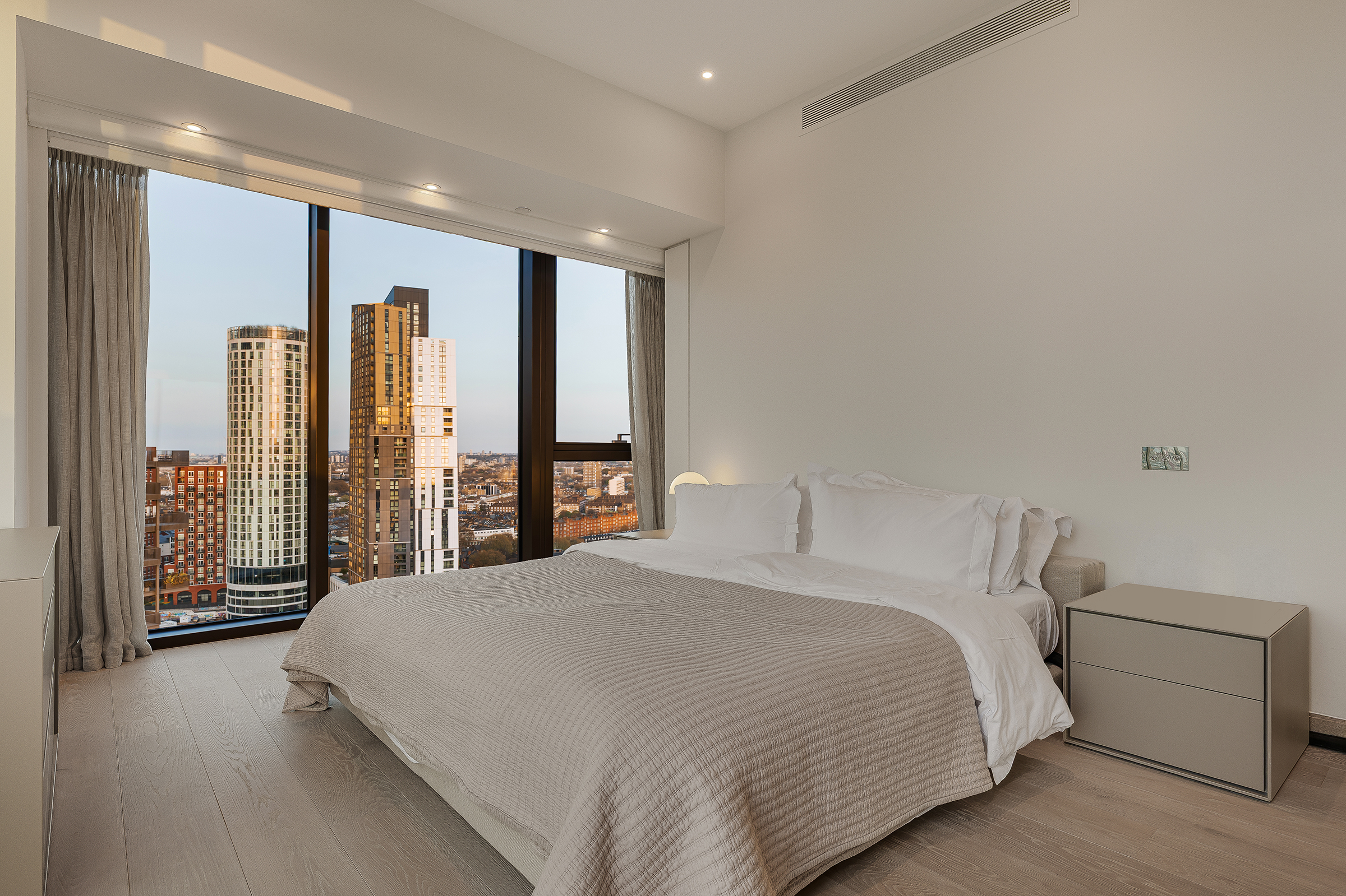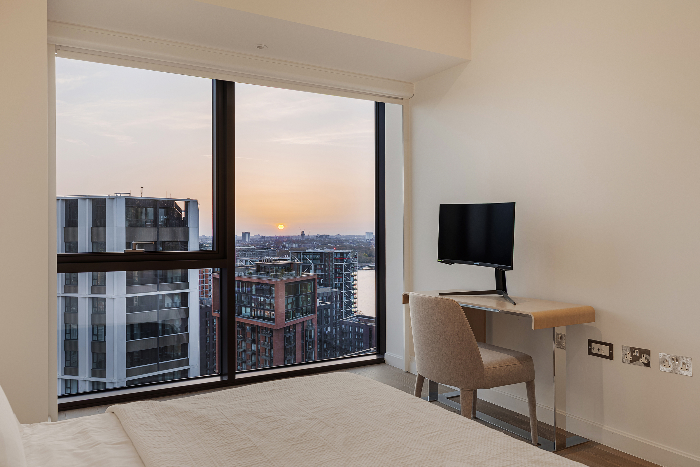 High above the Thames in the Legacy Building at Embassy Gardens, this three-bedroom duplex penthouse unfolds across the twenty-second and twenty-third floors, with far-reaching views that stretch across the river and deep into the London skyline. The sense of elevation is immediate, with light pouring in from multiple aspects and the city forming a constant, shifting backdrop.