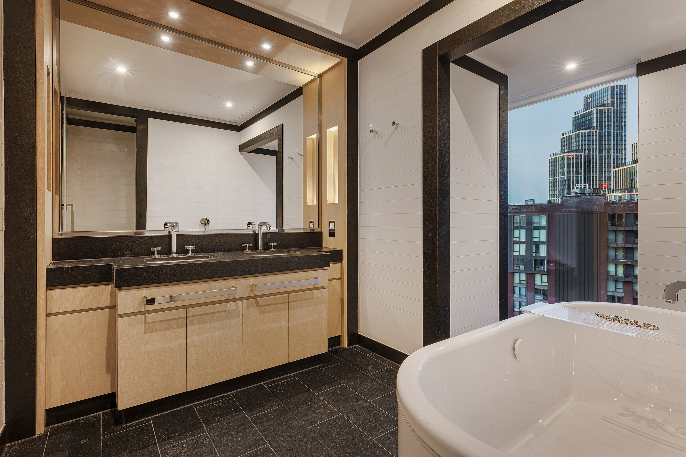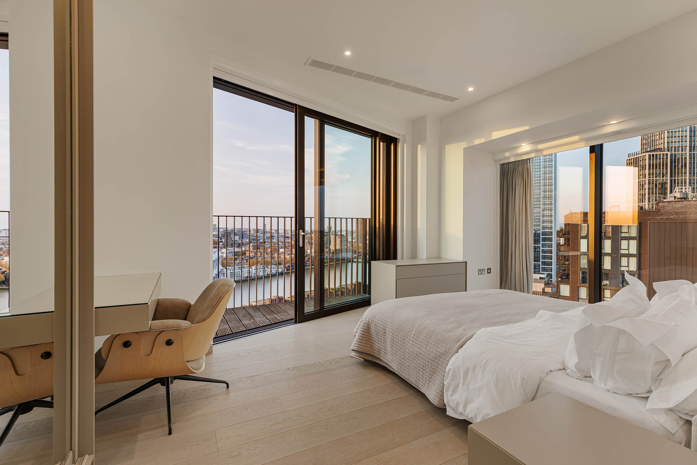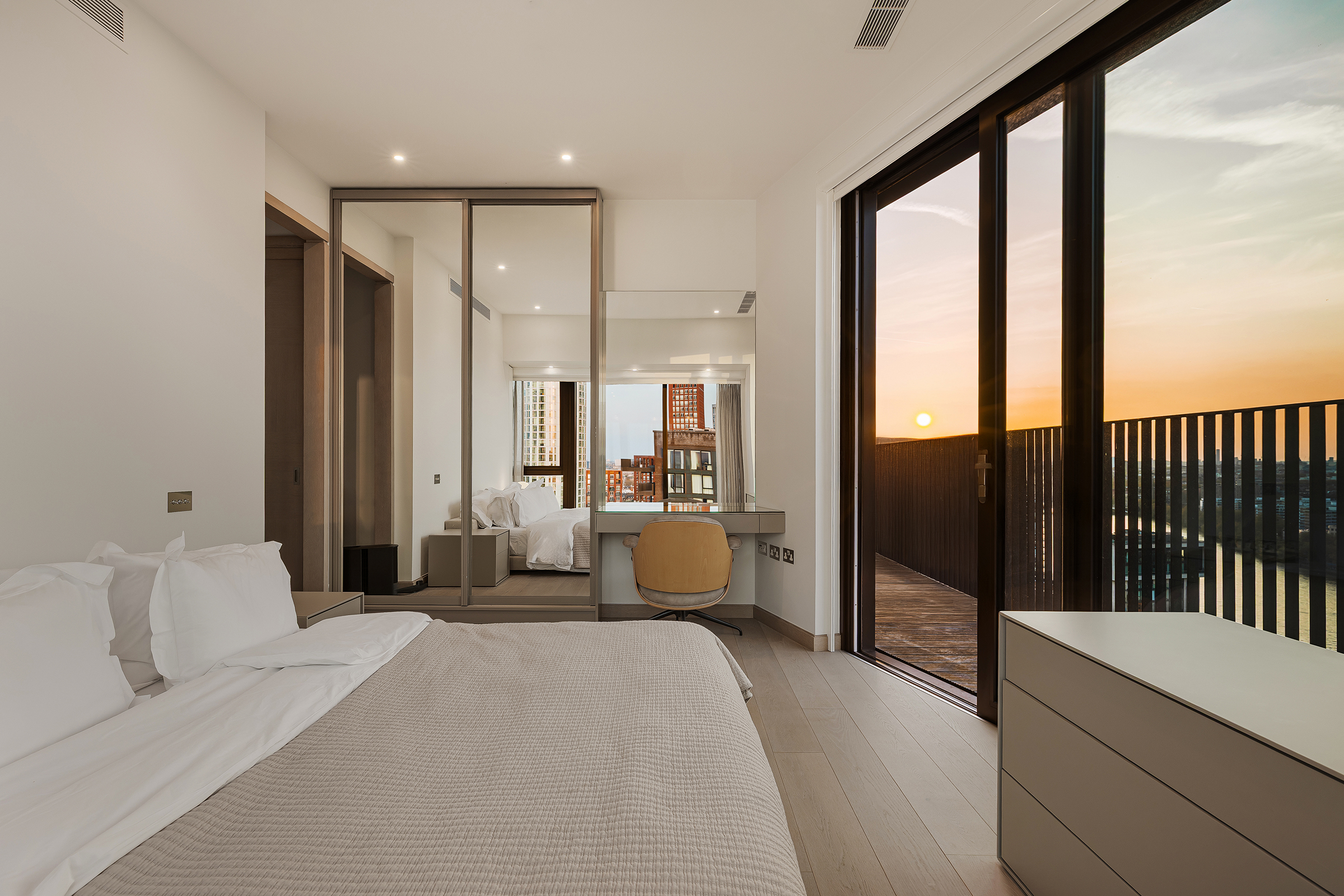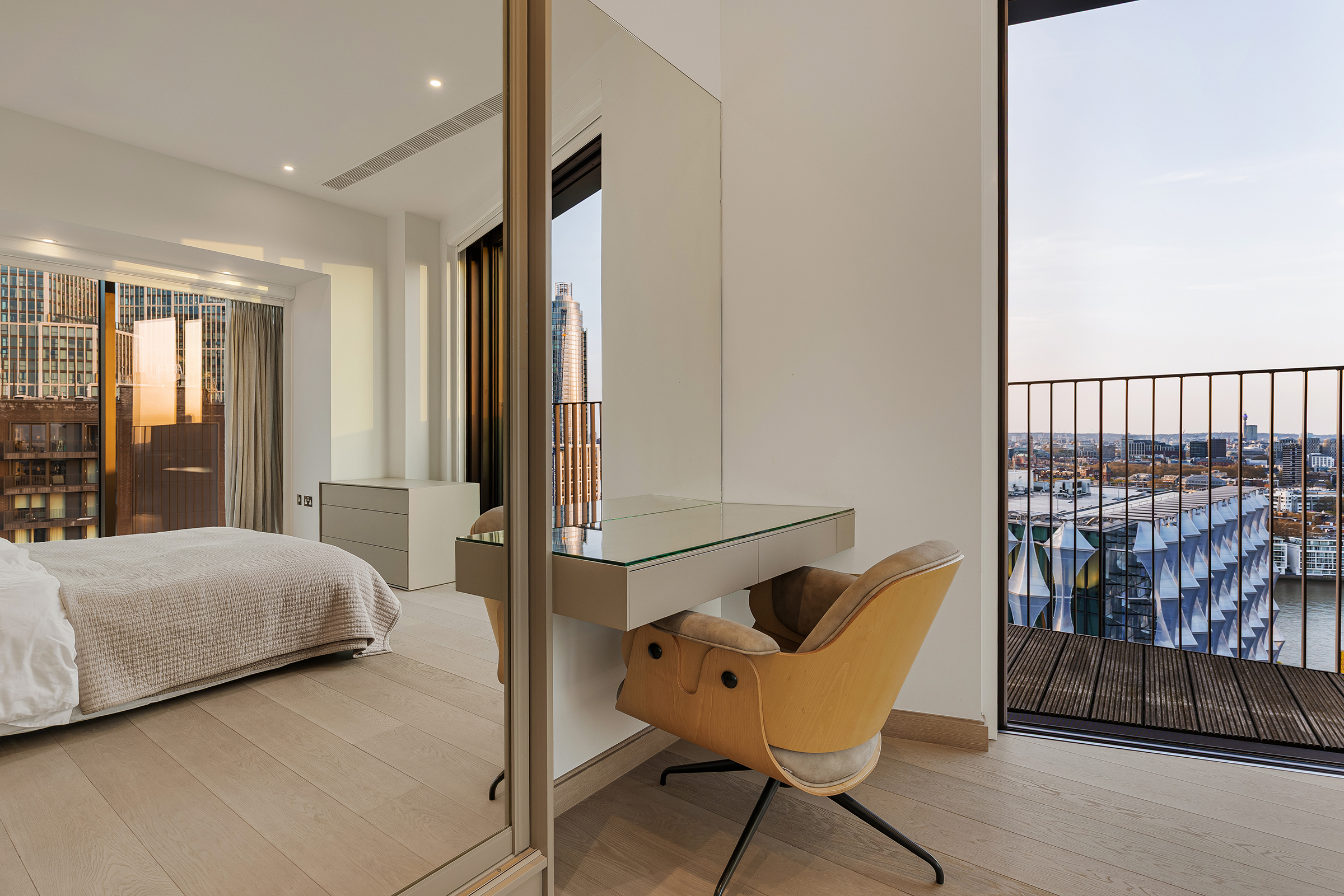 Upstairs, the apartment opens onto its defining feature: an exceptional private roof terrace measuring over 42 ft in width. Set against uninterrupted views of the Thames and London beyond, it is a rare outdoor space of real scale, suited to both large gatherings and quieter moments at sunset. The perspective from this level is striking, with the surrounding architecture and river activity unfolding below.