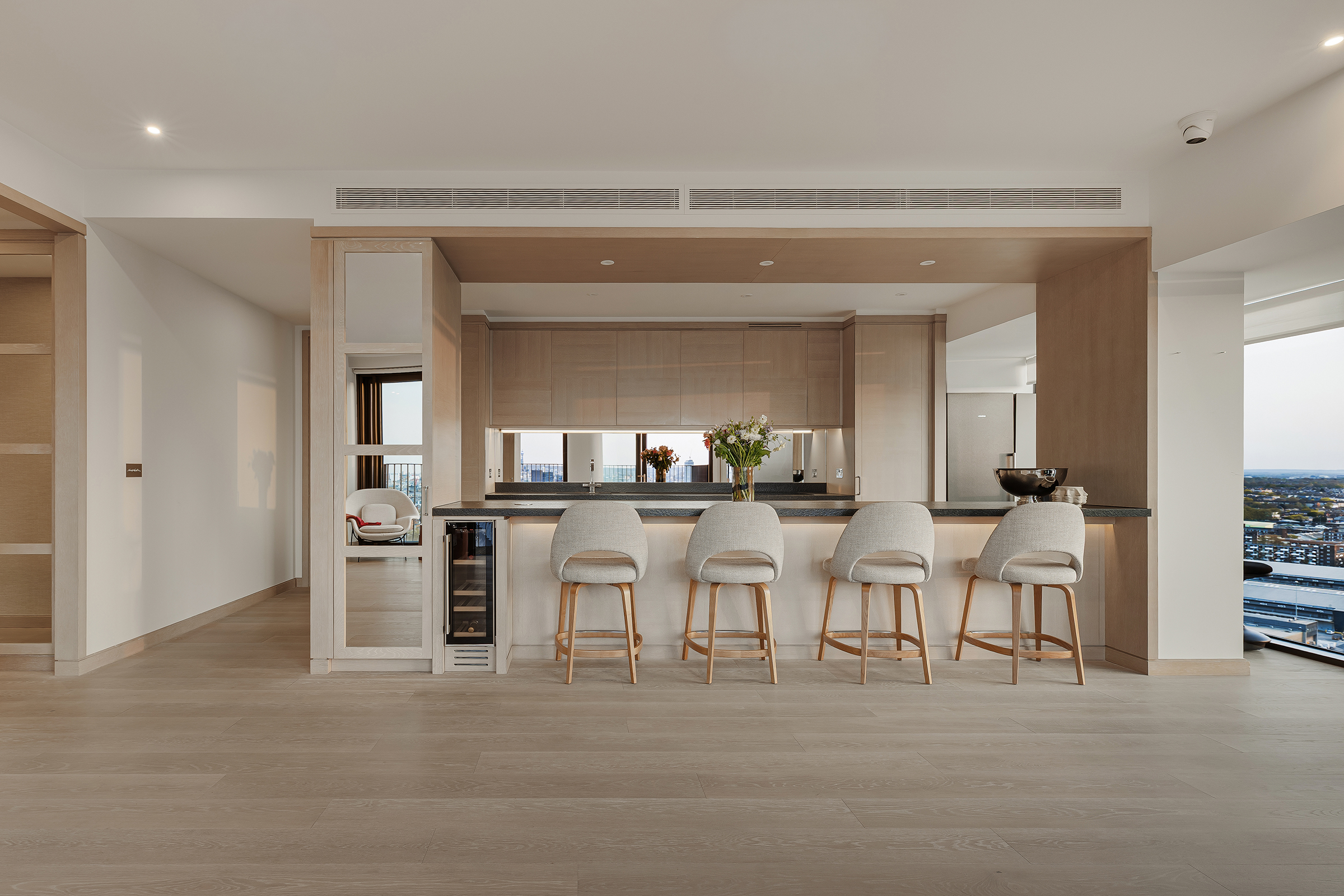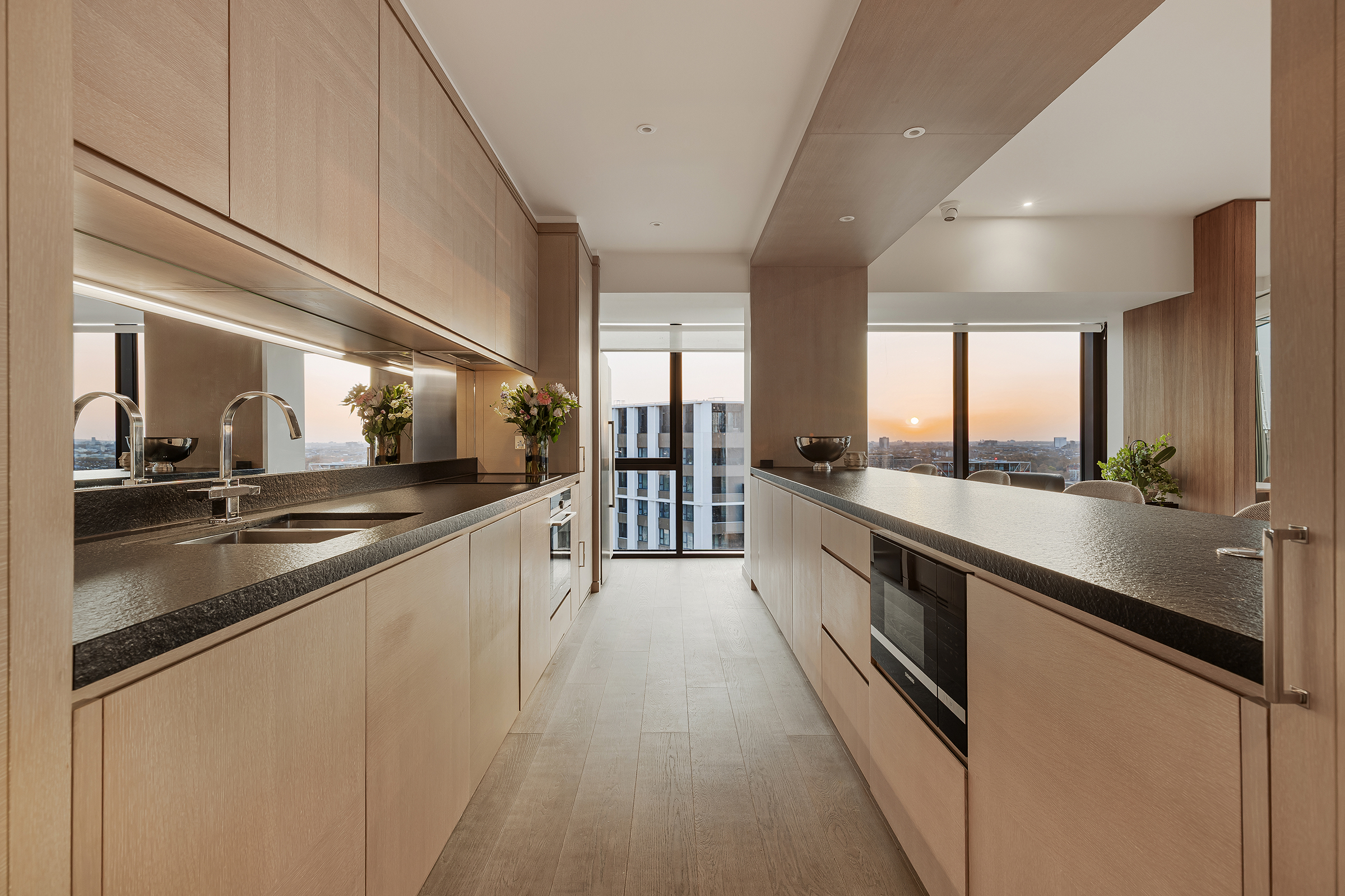 The principal living space is arranged on the lower level, where a wide, open-plan kitchen, dining and reception room runs laterally across the building. Floor-to-ceiling glazing draws the eye outward, while two private balconies extend the living space further, offering moments to step outside and take in the river below. The kitchen is modern and well-resolved, centred around a generous island with integrated appliances and clean-lined cabinetry, designed as much for entertaining as for everyday.