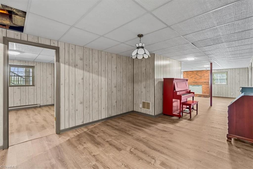 Brick ranch on a corner lot in Pine Hill Estates offering main-level living with a fully finished lower level. This 3-bedroom, 3-bath home features ~2,600+ finished square feet with a functional layout and multiple living spaces. The main level includes a spacious living area, flexible dining space, and a kitchen with custom wood cabinetry, tile backsplash, Corian countertops and stainless appliances. LVP and laminate flooring throughout with built-ins for added storage. The primary suite is on the main level with an ensuite bathroom, plus an additional full bath. The finished basement offers a large rec room with fireplace, flex rooms for office or guest use, and workshop/storage space. Outdoor features include a covered front porch, screened porch, Trex deck, fenced yard, and storage building. Updated windows, oversized 2-car garage, and no HOA. Refrigerator remains. 3D Tour & Floor plan available.