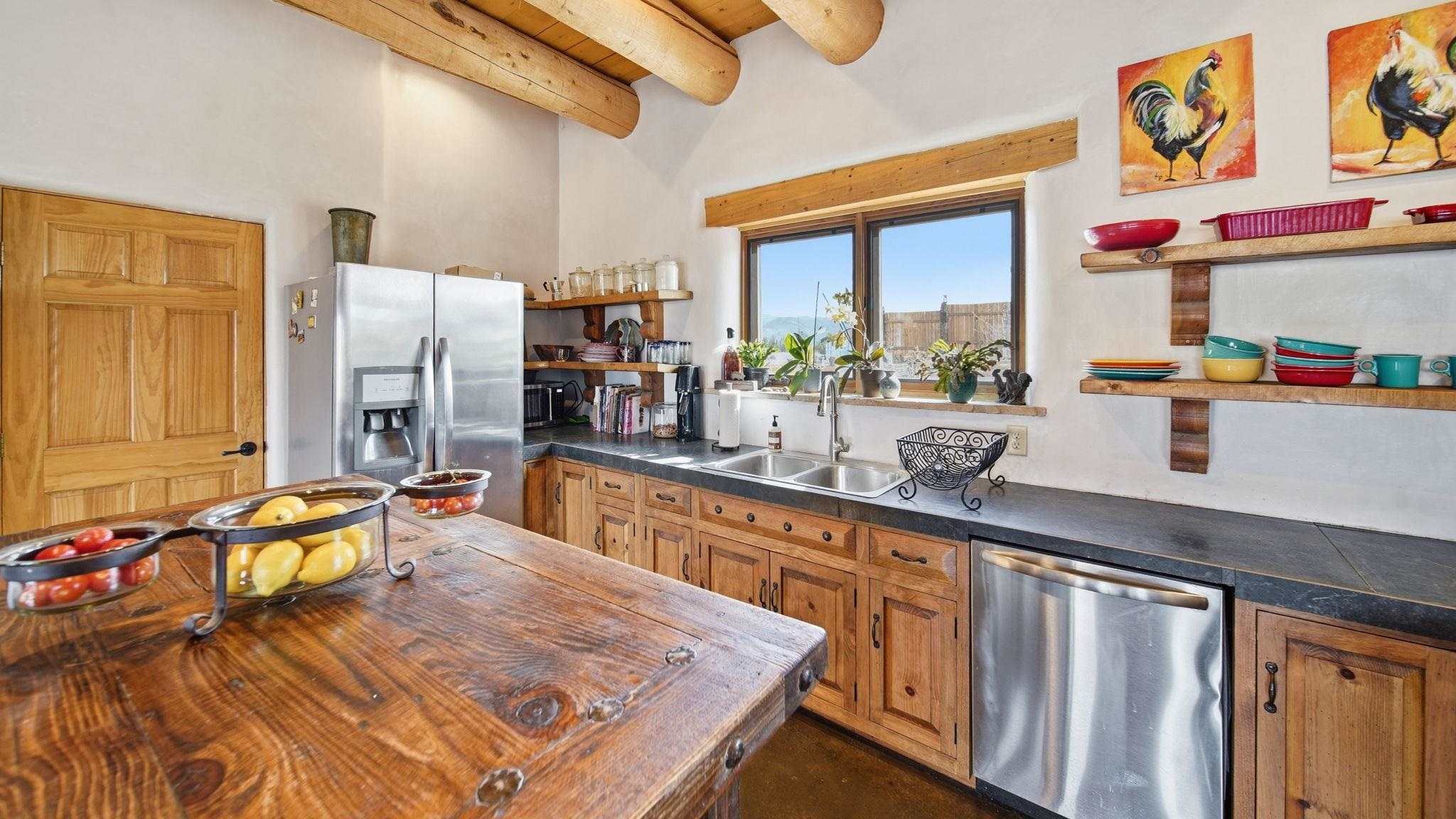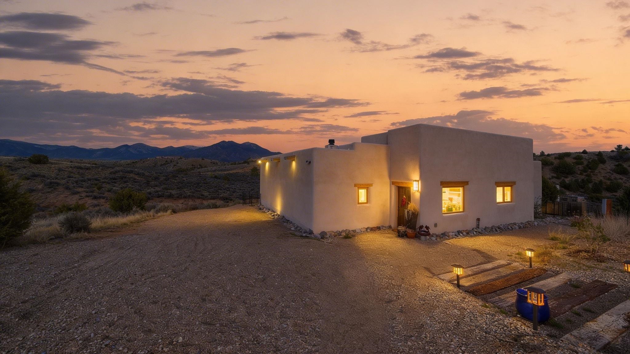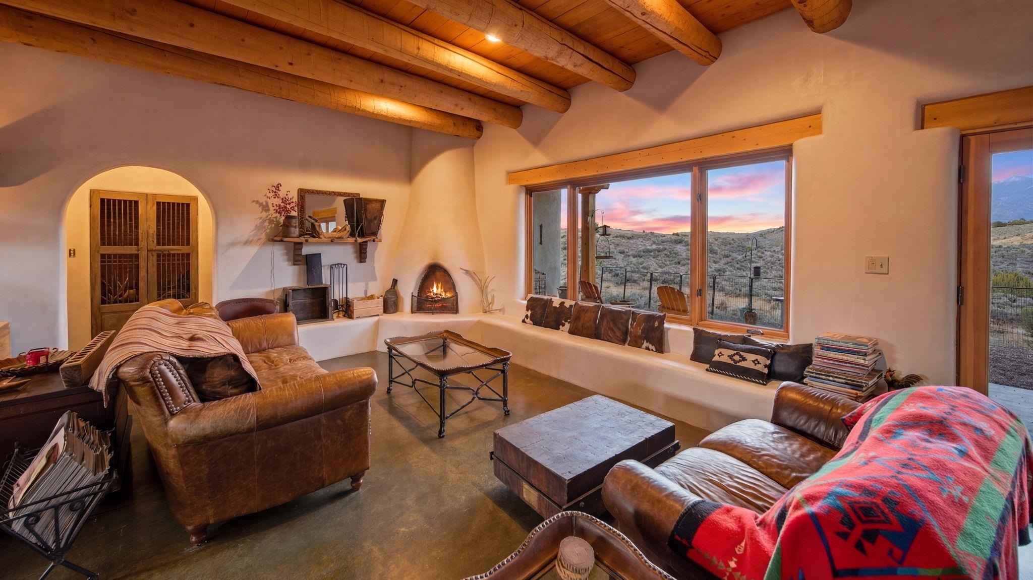 In the heart of Blueberry Hill, tucked into a private and quiet neighborhood, you will find this practically brand-new pumice-crete home and studio resting on a lush 1.08 acre lot. Enjoy absolutely stunning, direct, and unobstructed Taos Mountain views from both the living room and bedrooms. The property perfectly balances contemporary style with the timeless character and warmth of a classic Northern New Mexico pueblo style home. Inside the main house, elegant details abound. The space features smooth white diamond-finish R-42 walls, tall ceilings constructed of solid planks and pine vigas, and dark green radiant-heated floors that beautifully and efficiently keep the home warm. Just beyond the dining room - framed by a floor-to-ceiling beam adorned with a classic hanging chile ristra - sits the gourmet kitchen. This culinary space is equipped with a work island, counter seating, high-quality stainless steel appliances, tasteful Italian title countertops, and floating upper cabinets paired with handmade lower cabinetry. Conveniently tucked into the corner beside the kitchen is a laundry and mechanical room featuring an on-demand hot water heater. The spacious living room is anchored by a traditional kiva fireplace and features a large, built-in bancito. This inviting space perfectly captures the magnificent mountain views and offers direct access to the backyard and a dedicated dog run, making it the ideal spot for daily hangouts with family, friends, and pets. Step through rustic, antique turquoise doors to enter the expansive primary bedroom, which boasts its own built-in bancito beneath a large mountain-facing window, as well as direct outdoor access. The en-suite primary bathroom is a serene space designed for waking up or winding down, complete with a large soaking tub, a double vanity, and a generous walk-in closet. On the opposite side of the home, accessed through a graceful archway, you will find a spacious second bedroom with equally impressive views. The stunning guest bathroom features a rustic vanity alongside a walk-in shower beautifully appointed with ash-tone Italian tile and river rock accents - ensuring your guests feel right at home. Outside, the grounds surrounding the residence are a gardener's delight. You will find established gardens filled with young deciduous trees, vibrant perennials, and boxes ready for growing your own herbs and vegetables. A quaint detached building, currently serving as a music studio, offers endless potential to be customized to your needs or used as a private retreat for visiting guests. Just beyond your property line, you will discover a welcoming community of great neighbors and informal walking trails winding through the beautiful surrounding arroyos. Ultimately, this property offers the perfect sanctuary: a peaceful, private retreat situated in an absolutely ideal location, putting you just a short, scenic drive away from taking advantage of everything in vibrant Taos. Reach out today to see this special Blueberry Hill property.