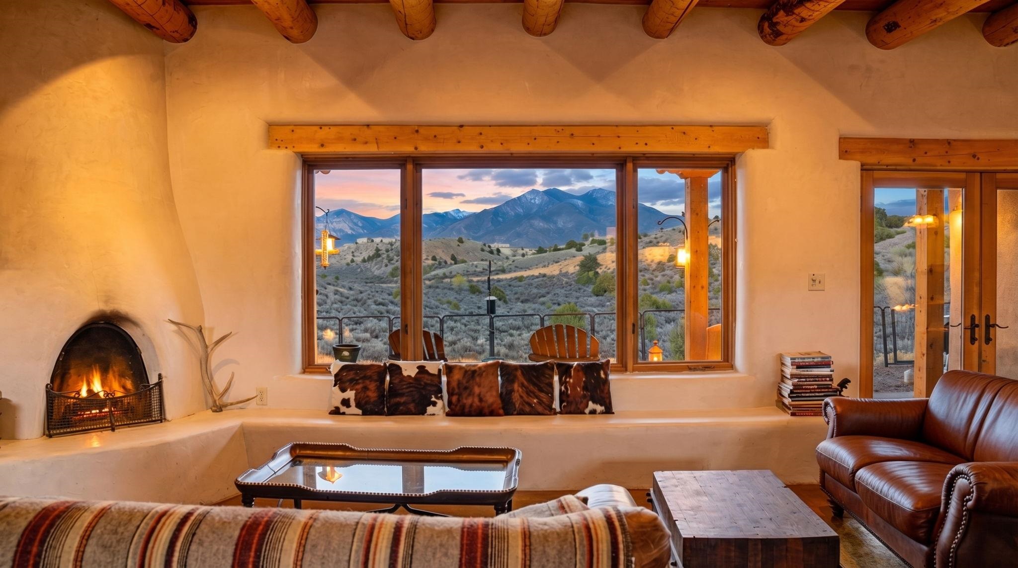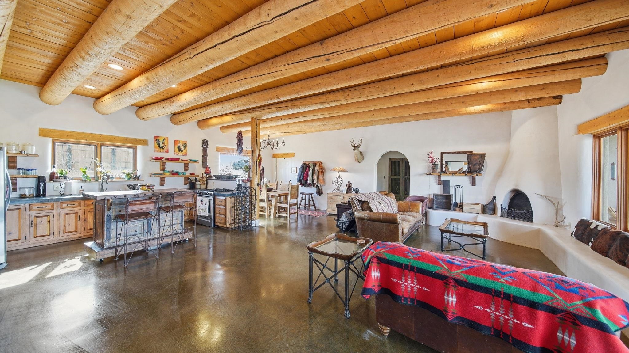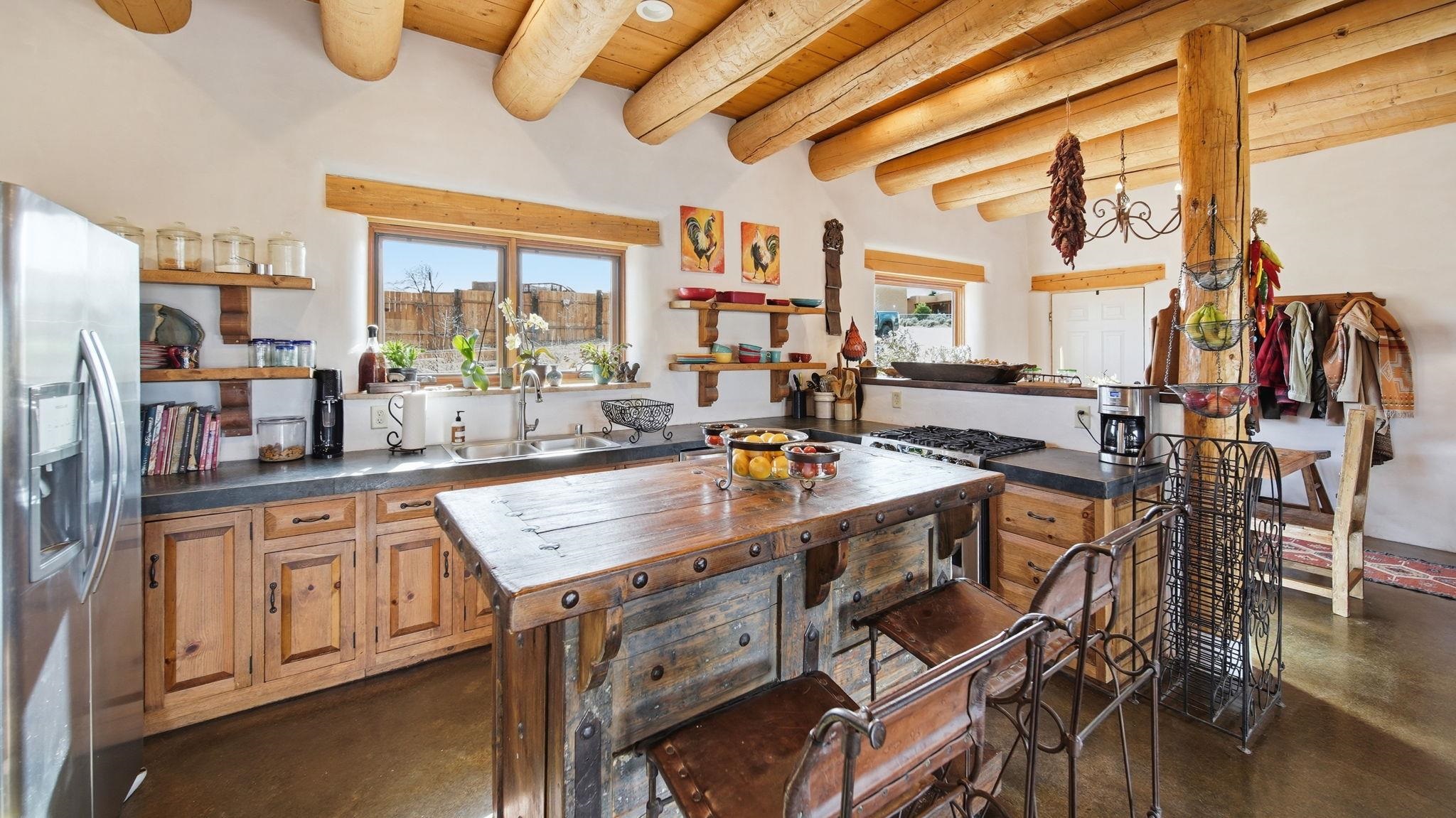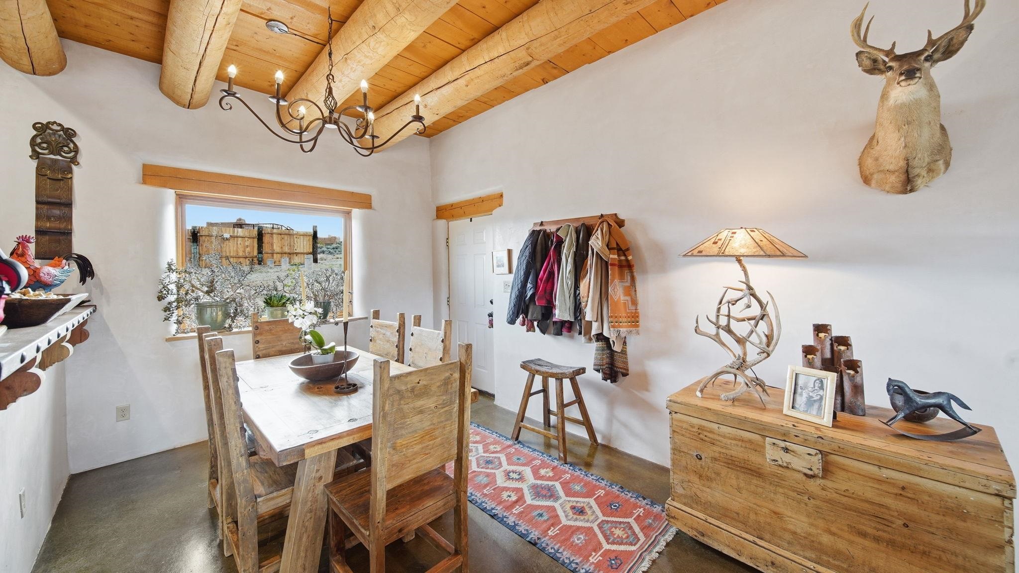 In the heart of Blueberry Hill, tucked into a private and quiet neighborhood, you will find this practically brand-new pumice-crete home and studio resting on a lush 1.08 acre lot. Enjoy absolutely stunning, direct, and unobstructed Taos Mountain views from both the living room and bedrooms. The property perfectly balances contemporary style with the timeless character and warmth of a classic Northern New Mexico pueblo style home. Inside the main house, elegant details abound. The space features smooth white diamond-finish R-42 walls, tall ceilings constructed of solid planks and pine vigas, and dark green radiant-heated floors that beautifully and efficiently keep the home warm. Just beyond the dining room - framed by a floor-to-ceiling beam adorned with a classic hanging chile ristra - sits the gourmet kitchen. This culinary space is equipped with a work island, counter seating, high-quality stainless steel appliances, tasteful Italian title countertops, and floating upper cabinets paired with handmade lower cabinetry. Conveniently tucked into the corner beside the kitchen is a laundry and mechanical room featuring an on-demand hot water heater. The spacious living room is anchored by a traditional kiva fireplace and features a large, built-in bancito. This inviting space perfectly captures the magnificent mountain views and offers direct access to the backyard and a dedicated dog run, making it the ideal spot for daily hangouts with family, friends, and pets. Step through rustic, antique turquoise doors to enter the expansive primary bedroom, which boasts its own built-in bancito beneath a large mountain-facing window, as well as direct outdoor access. The en-suite primary bathroom is a serene space designed for waking up or winding down, complete with a large soaking tub, a double vanity, and a generous walk-in closet. On the opposite side of the home, accessed through a graceful archway, you will find a spacious second bedroom with equally impressive views. The stunning guest bathroom features a rustic vanity alongside a walk-in shower beautifully appointed with ash-tone Italian tile and river rock accents - ensuring your guests feel right at home. Outside, the grounds surrounding the residence are a gardener's delight. You will find established gardens filled with young deciduous trees, vibrant perennials, and boxes ready for growing your own herbs and vegetables. A quaint detached building, currently serving as a music studio, offers endless potential to be customized to your needs or used as a private retreat for visiting guests. Just beyond your property line, you will discover a welcoming community of great neighbors and informal walking trails winding through the beautiful surrounding arroyos. Ultimately, this property offers the perfect sanctuary: a peaceful, private retreat situated in an absolutely ideal location, putting you just a short, scenic drive away from taking advantage of everything in vibrant Taos. Reach out today to see this special Blueberry Hill property.