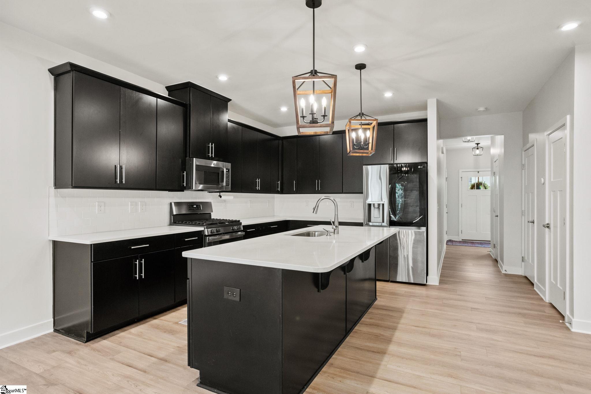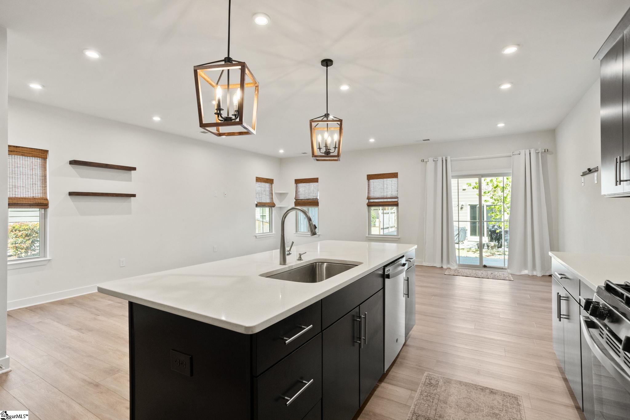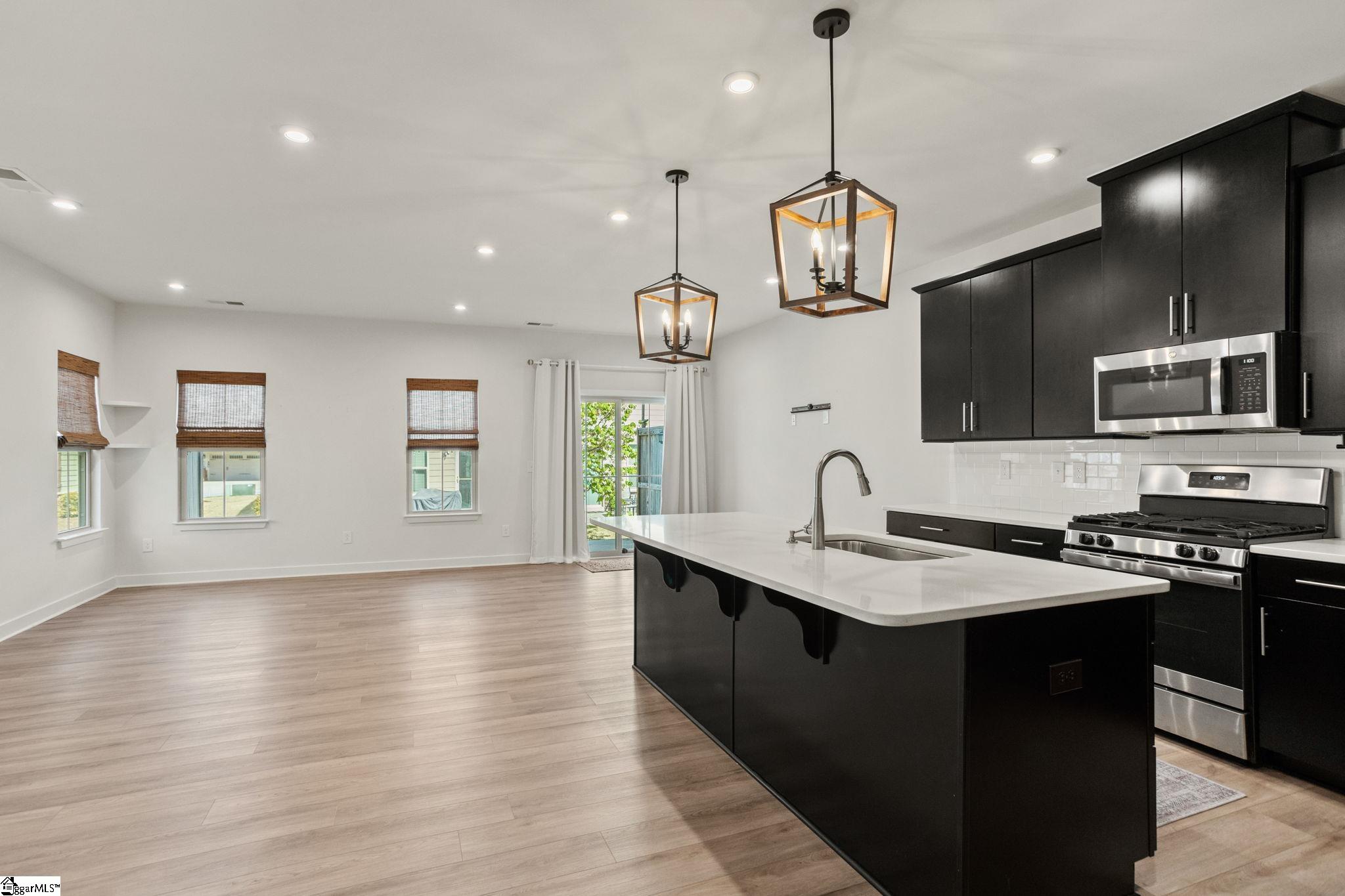 Location, convenience, and easy living come together in this beautifully designed townhome at 146 Eagle Wood Dr.! This 3-bedroom, 2.5-bath end unit in the sought-after Market Point Townes community offers the perfect blend of style and low-maintenance comfort. Enjoy a prime location just a short walk to The Shops at Greenridge, with endless dining, shopping, and entertainment options along Woodruff Road. Commuters will love the quick 3-minute access to I-85! Step inside to an inviting open-concept main level, ideal for both everyday living and entertaining. The spacious kitchen flows seamlessly into the dining and living areas and features quartz countertops, a large island with breakfast bar, stainless steel appliances, 42" cabinets, and a gas range - perfect for hosting or honing your culinary skills. Upstairs, you'll find three generously sized bedrooms, including a stunning primary suite with a tray ceiling, walk-in closet plus an additional closet, and a luxurious en-suite bath complete with dual sinks, a tiled shower with dual shower heads, and a private water closet. Two additional bedrooms offer ample space, including one with its own walk-in closet. The conveniently located upstairs laundry includes a washer and dryer that convey with the home. Relax outdoors large size patio - perfect for morning coffee or evening unwinding. Additional features include a one-car garage, tankless water heater, and access to fantastic neighborhood amenities such as a pool, fire pit, and dog park. Move-in ready and loaded with upgrades - all appliances convey. Don't miss your chance to call this one home!