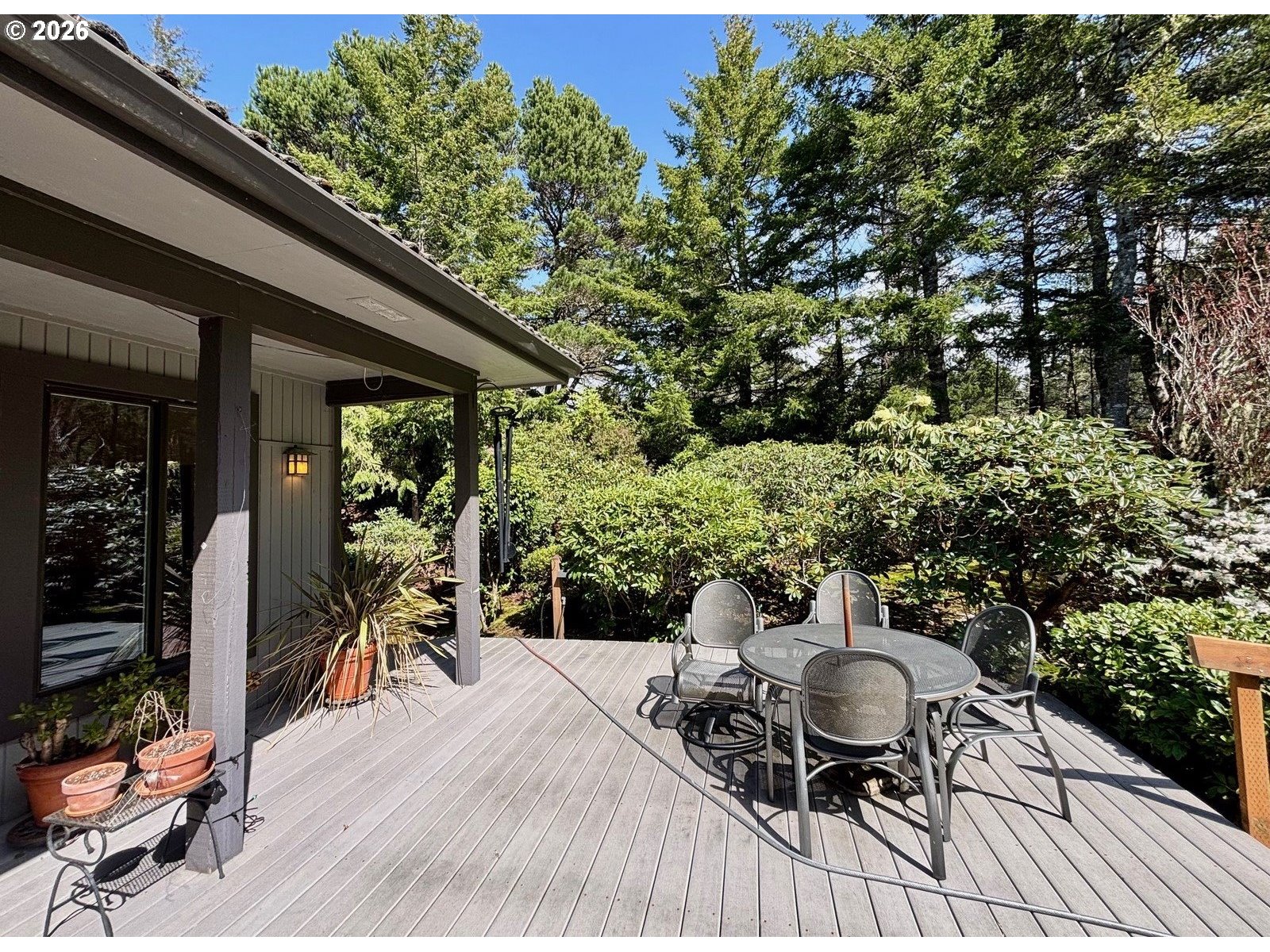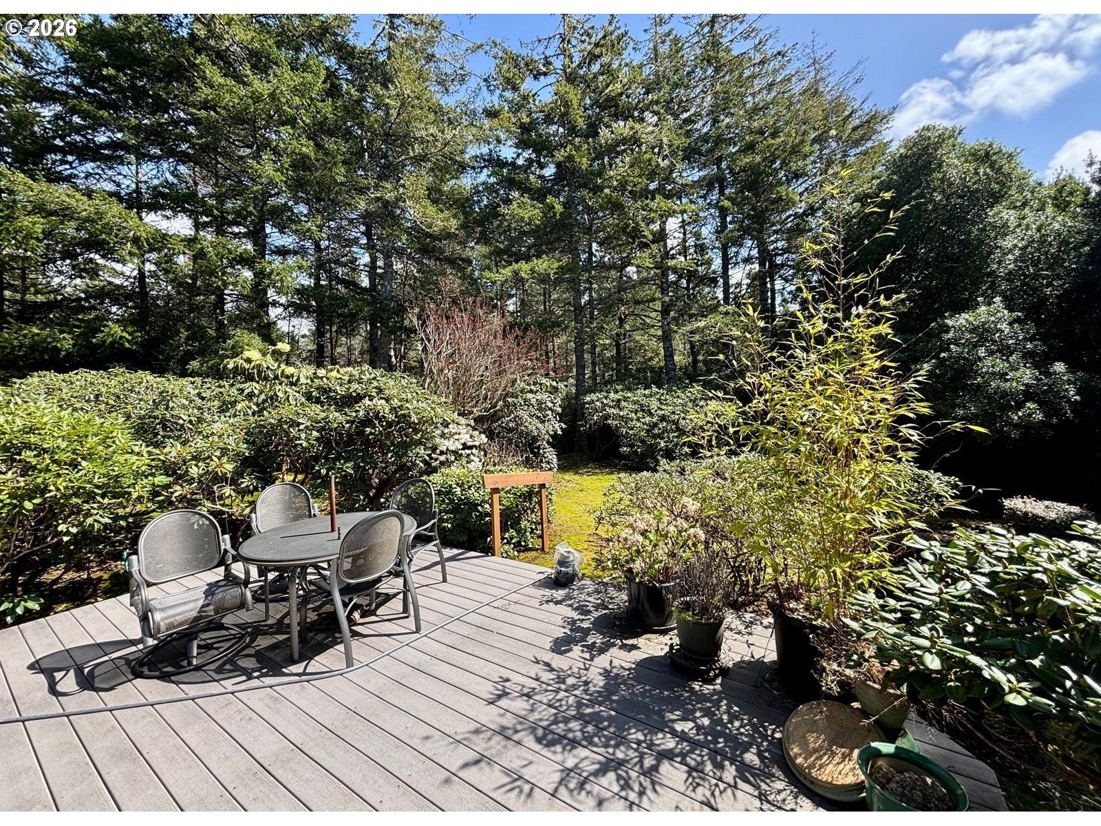 Nestled at the end of a quiet cul-de-sac in desirable Heceta South, this 2,787 sq. ft. custom home offers unmatchedprivacy and charm on two lots totaling one full acre. The beautifully landscaped backyard is a true sanctuary, featuring over 110 unique rhododendrons, mature plantings, drip irrigation, and peaceful rear decks perfect for relaxing or entertaining. Inside, you'll and real hardwood floors, high ceilings, and a see-through replace adding warmth and character. The chef's kitchen boasts solid surface countertops, hickory cabinets and a skylight. There is a sunlit solarium for year-round enjoyment. A separate office with built-in bookshelves, shoji pocket doors, and a custom movable desk creates the perfect work-from-home space. The attached guest quarters feature soaring 10-foot ceilings, a private bath, and sliding doors leading directly to the lush backyard - ideal for guests, multi-generational living, or a home studio. Additional features include: 3 bedrooms, 3 bathrooms. Tile roof for durability and style. Central vacuum, heat pump, and a full sound system. Skylight for added natural light. solarium for year-round sun enjoyment. Attached 2-car garage. Office with built-ins & custom desk. This home is the perfect blend of function, beauty, and tranquility. Don't miss the chance to own a piece of the Pacific Northwest's nest living!