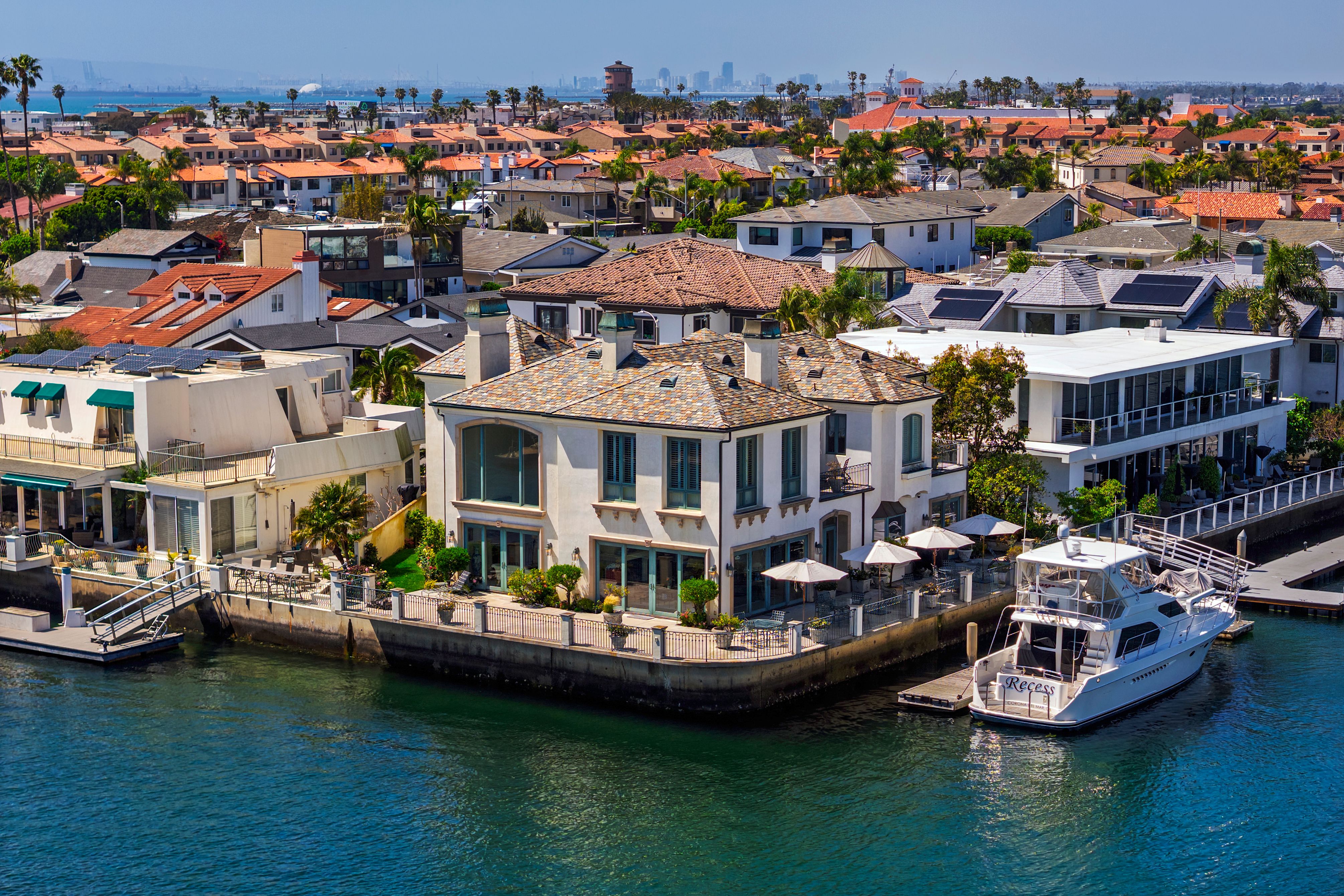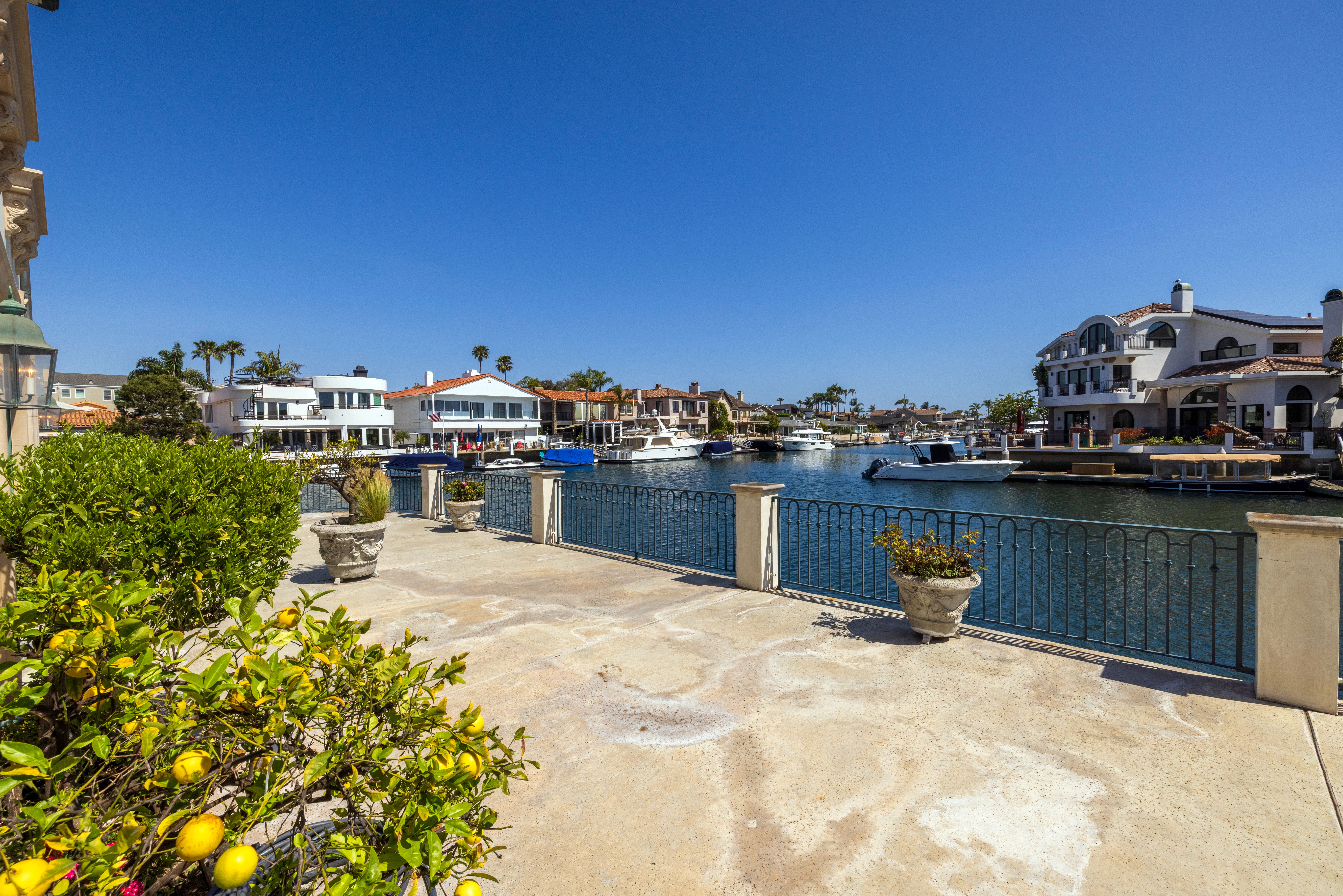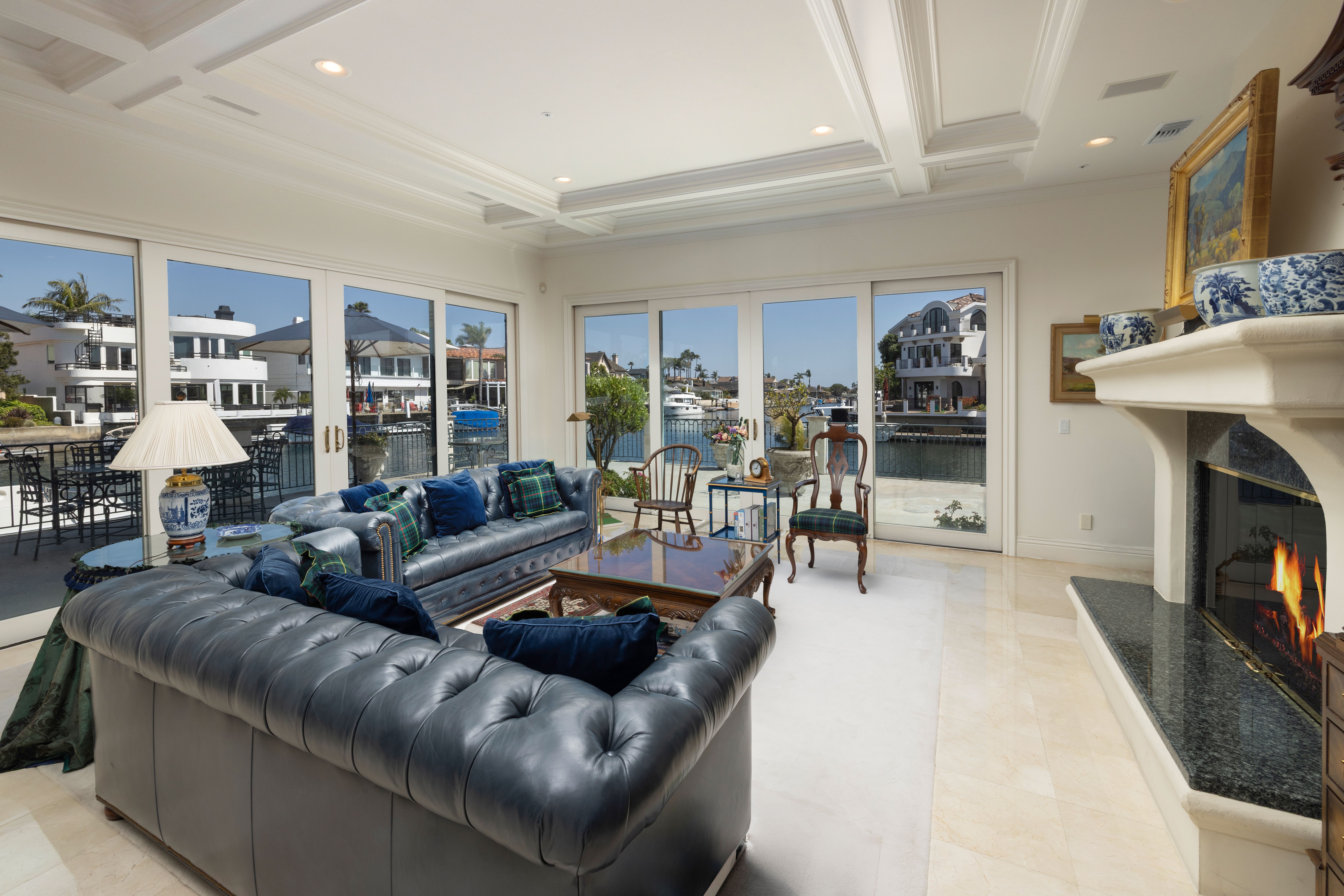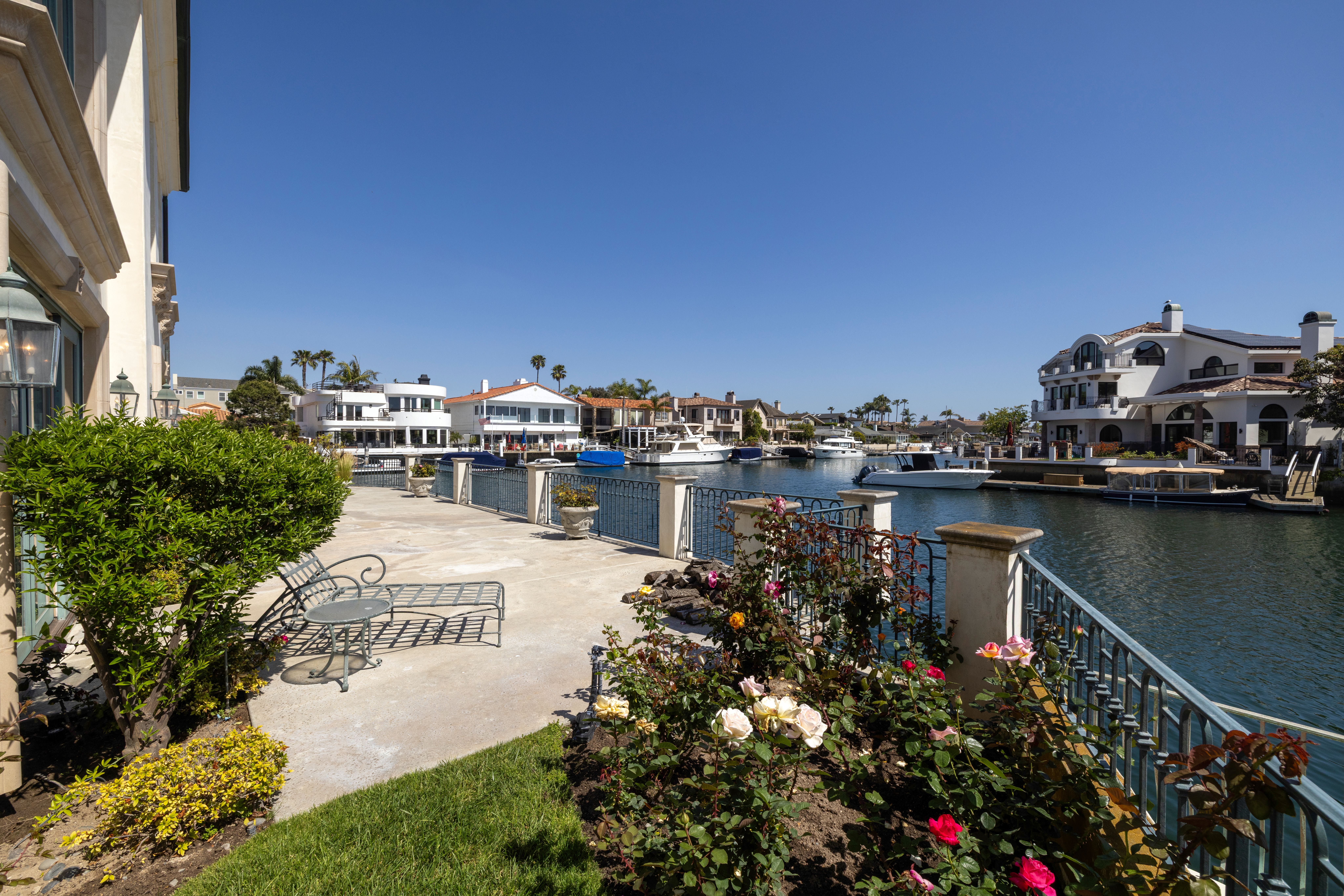 Positioned on a rare corner point within Huntington Harbour, this custom built French Provincial residence commands one of the community's most exceptional waterfront settings – defined by two-sided water exposure, expanded channel frontage, and large dock that could be expanded up to 170 feet. Set on an approximately 8000-square-foot parcel, the home encompasses over 4,500 square feet of interior living space, with 3 car garage, four bedrooms, all en-suite and four-and-a-half baths arranged across a generous, highly livable floor plan. The home’s dramatic foyer and sweeping staircase contribute to the structural presence and underlying scale that define the Harbour's most substantial properties — and that provide the foundation for elevated living. Where most waterfront properties offer a single linear edge, this rare point location broadens the visual field, deepening the connection to the surrounding channels, and creating a spatial relationship to the Harbour with maximized captivating views. The interior spaces are organized around volume and natural light, with well-proportioned living areas designed to support both comfort and larger-scale entertaining. A clear separation between primary and secondary spaces allows the home to function with ease across a range of uses, with the primary suite positioned as a private retreat and additional en-suite bedrooms offering flexibility for guests or extended family. The strong architectural foundation, along with layers of fine materials, enhances the entire dwelling. A small selection includes a dramatic stair; abundant use of stone and custom millwork; three fireplaces; multiple rooms complemented by elegant ceiling details; and an impressive assemblage of custom windows, French doors, and stacking rows of glass capturing cascading illumination and the splendid exterior surround. The outdoor spaces provide a delightful extension of the residence with a private, verdantly landscaped garden courtyard and a sprawling, wrapping waterside terrace. Set just moments from the sands of Sunset Beach, the property is further distinguished by its optimal proximity to the region’s myriad recreational offerings, sought-after dining and shopping, as well as community and local resources – an optimal opportunity to enjoy the benefits of a coastal lifestyle and elegant accommodations.