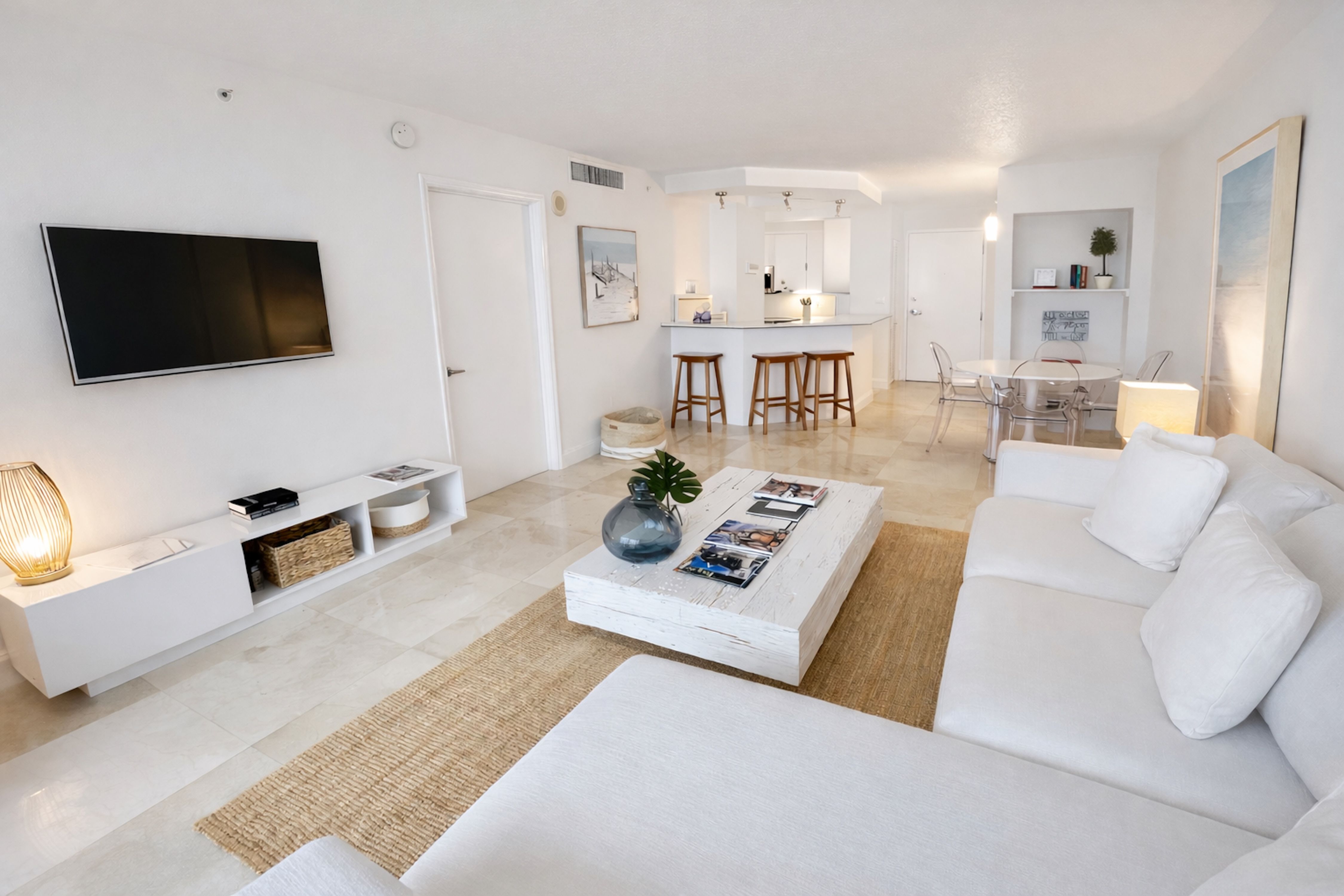 Beautifully updated residence at The Collins, an oceanfront building ideally located in Miami Beach. This bright and inviting unit features a clean, modern design with white cabinetry, stone countertops, and light flooring throughout, creating an open and airy feel. The functional kitchen offers ample storage and stainless steel appliances, seamlessly connecting to a comfortable living area filled with natural light.
