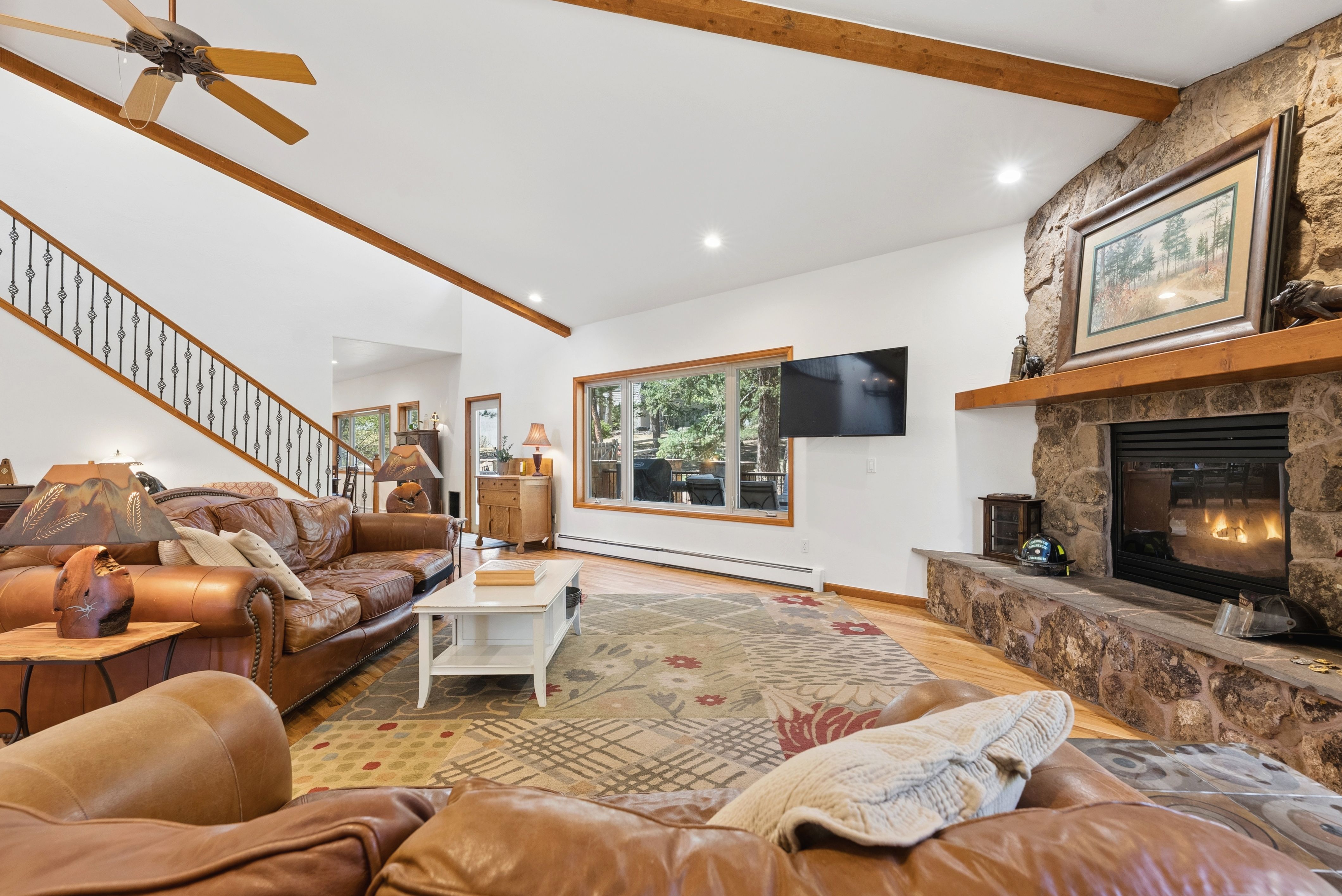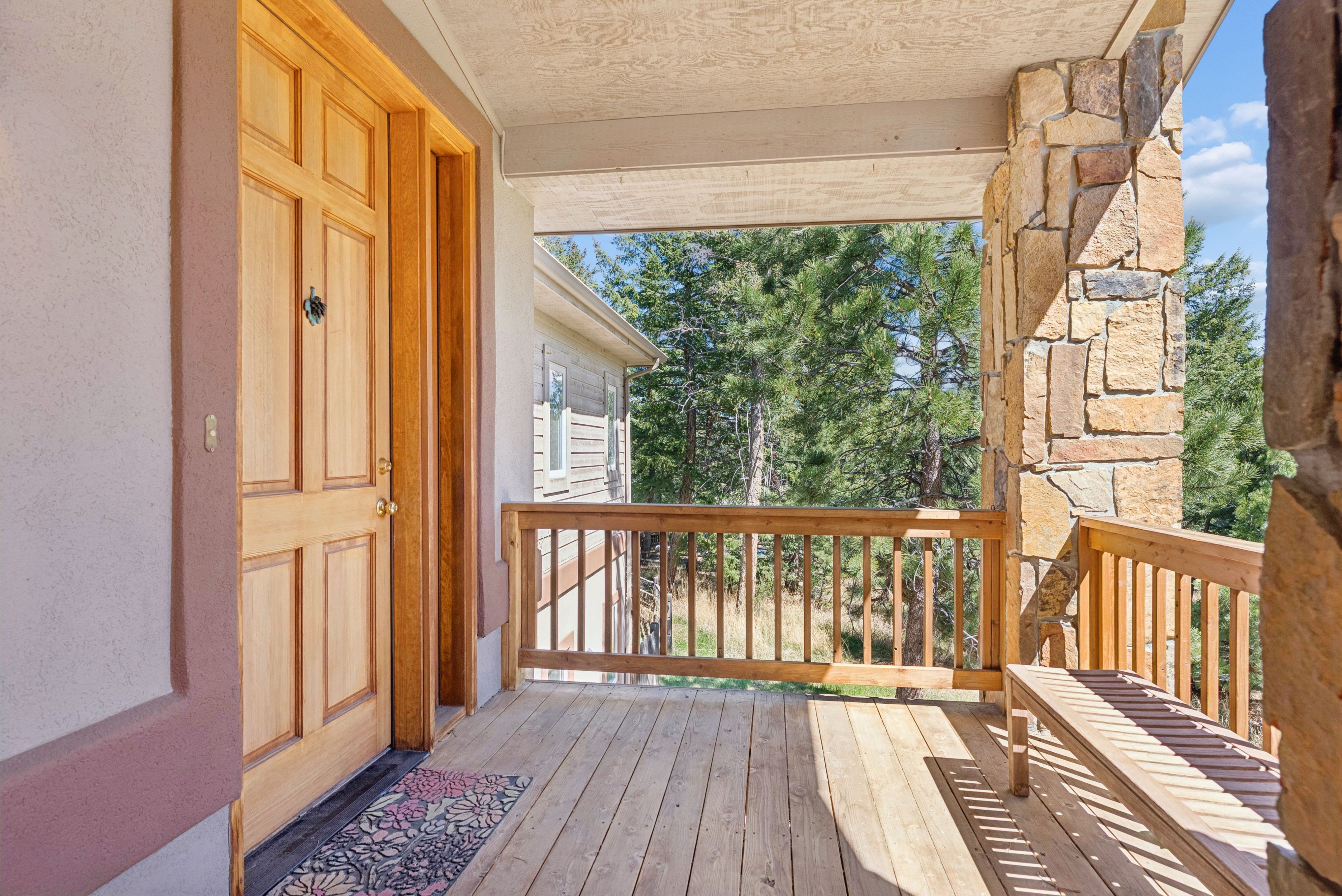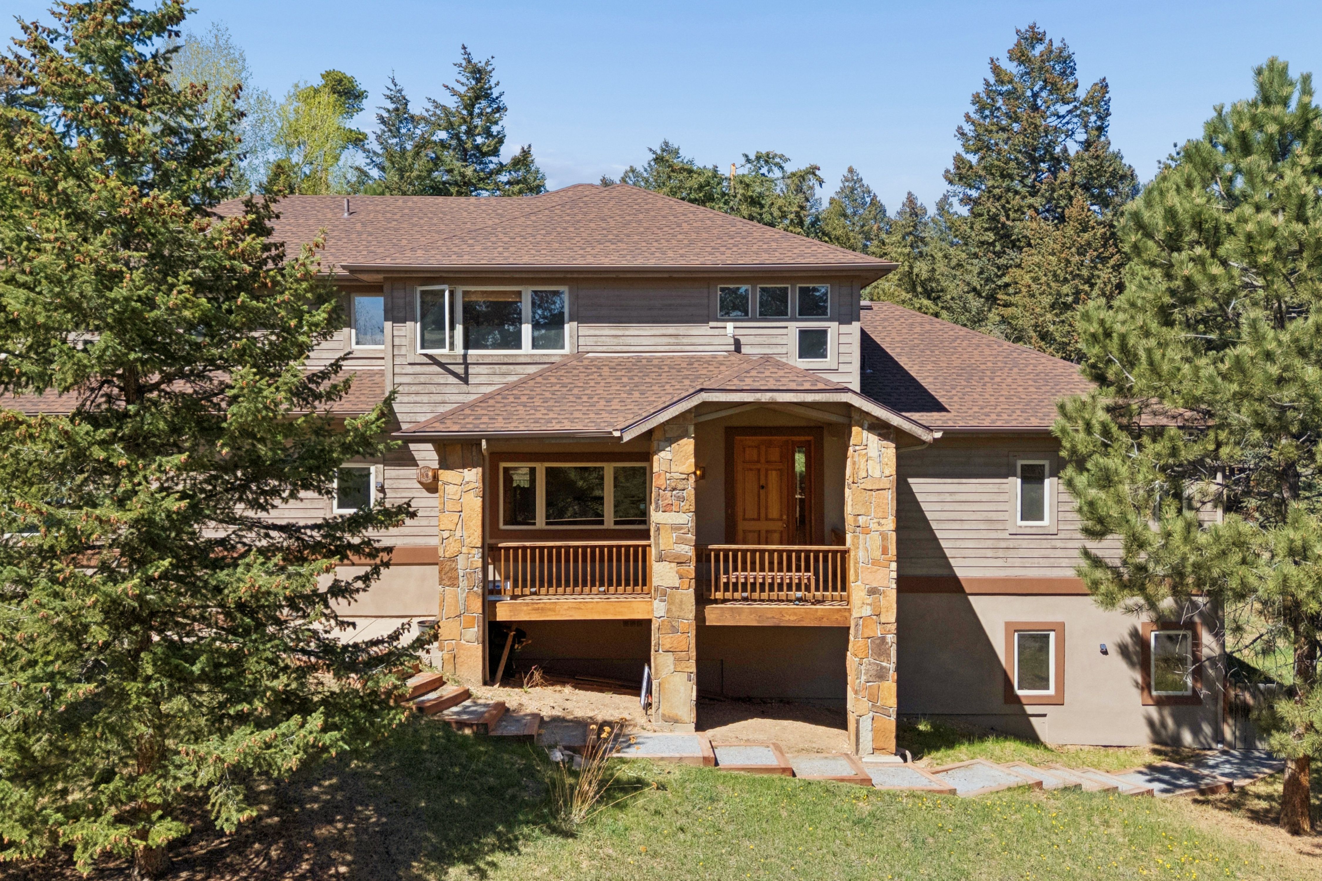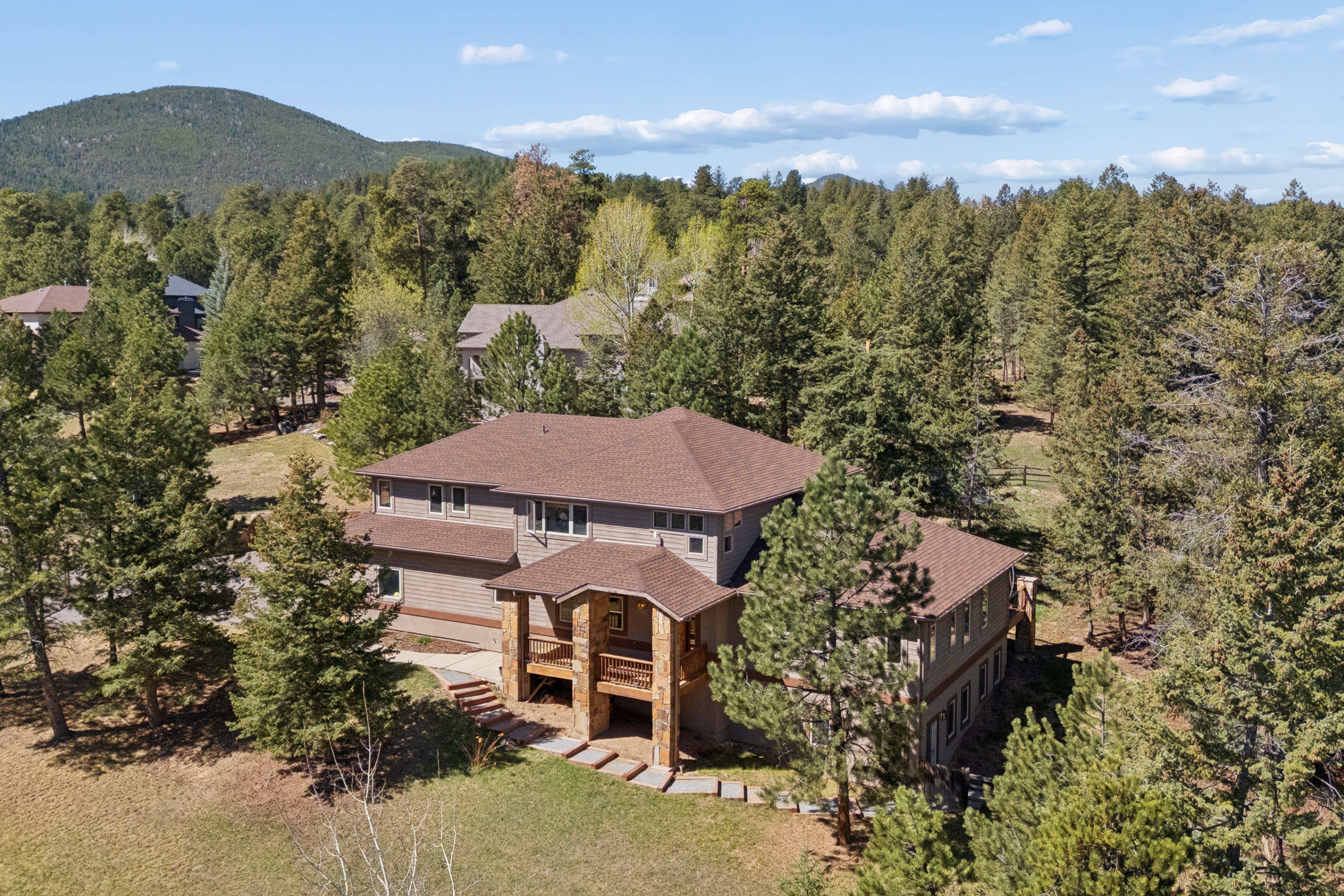 Nestled in one of North Evergreen’s favorable enclaves, The Promontory at Soda Creek offers an exceptional opportunity to experience elevated mountain living with everyday convenience. Set on a level, partially fenced lot, this property delivers a special combination of usability, privacy, and natural beauty. The thoughtfully designed open floor plan showcases exposed beams, graceful archways, and abundant natural light, creating a warm and tastefully curated ambiance. The main level features a spacious great room with a focal point fireplace, an inviting dining area, and a private office—ideal for both productive workdays and relaxed living. The kitchen is both functional and stylish, featuring a large center island, abundant counter space, eat-in dining area, and a comfortable lounge area —perfectly suited for entertaining or daily living. An expansive deck extends the living space outdoors, offering generous seating areas and access to a usable, level yard—ideal for recreation, gatherings, or simply enjoying the peaceful surroundings. Upstairs, three generous sized bedrooms include a well appointed primary suite with vaulted ceilings, gas fireplace, and dual walk-in closets. The ensuite bath provides a private retreat, while the secondary bedrooms share a convenient, dual-access full bath. The lower level with additional exterior, separate entrance enhances flexibility with a spacious family room, guest bedroom, and full bath. A secondary kitchen space and dedicated washer and dryer create an ideal setup for guests, multigenerational living, or private accommodations. The South facing, level driveway with bonus parking turn around spaces provided easy in/out access. With close proximity to Evergreen Recreation Center, hiking/biking trails, parks, schools, hundreds of acres open space—and convenient access to Denver—this home offers a great blend of comfort, versatility, and the very best of Evergreen living.