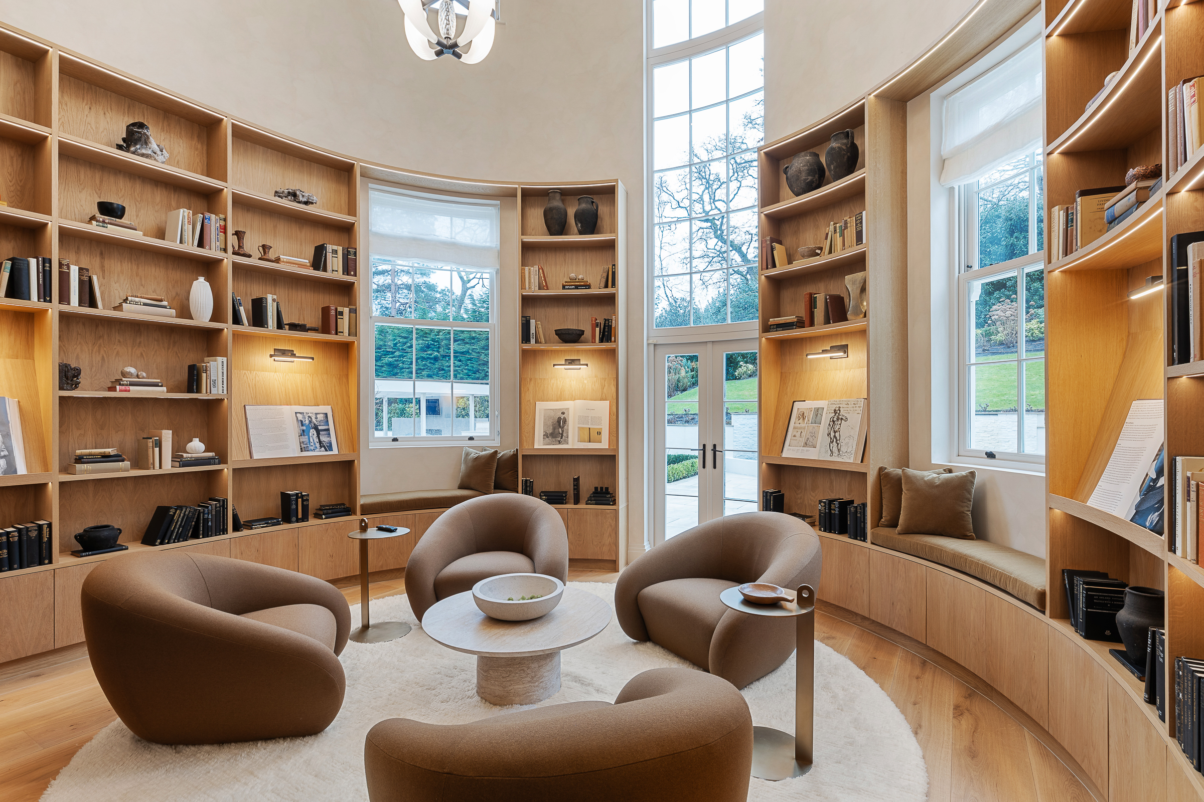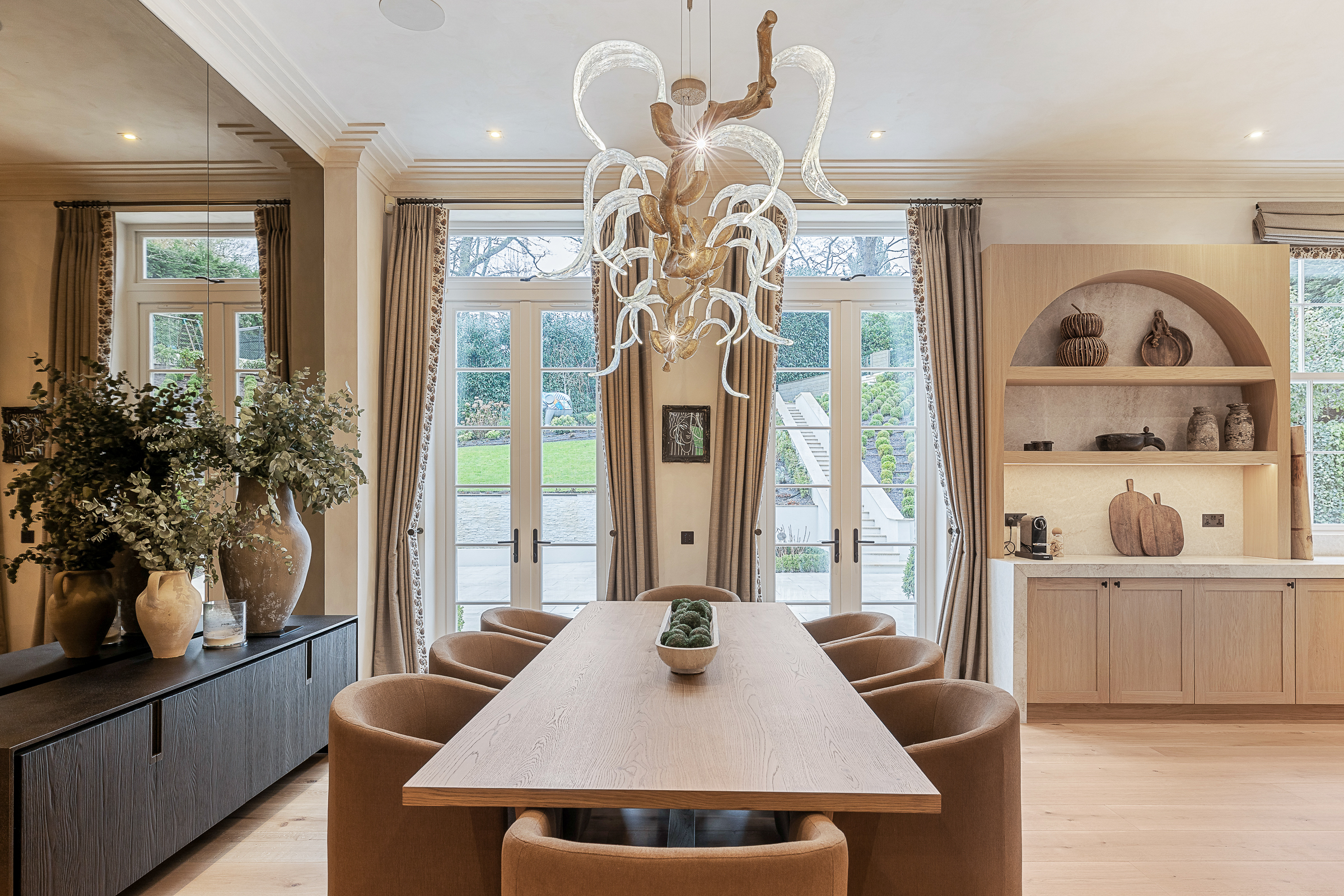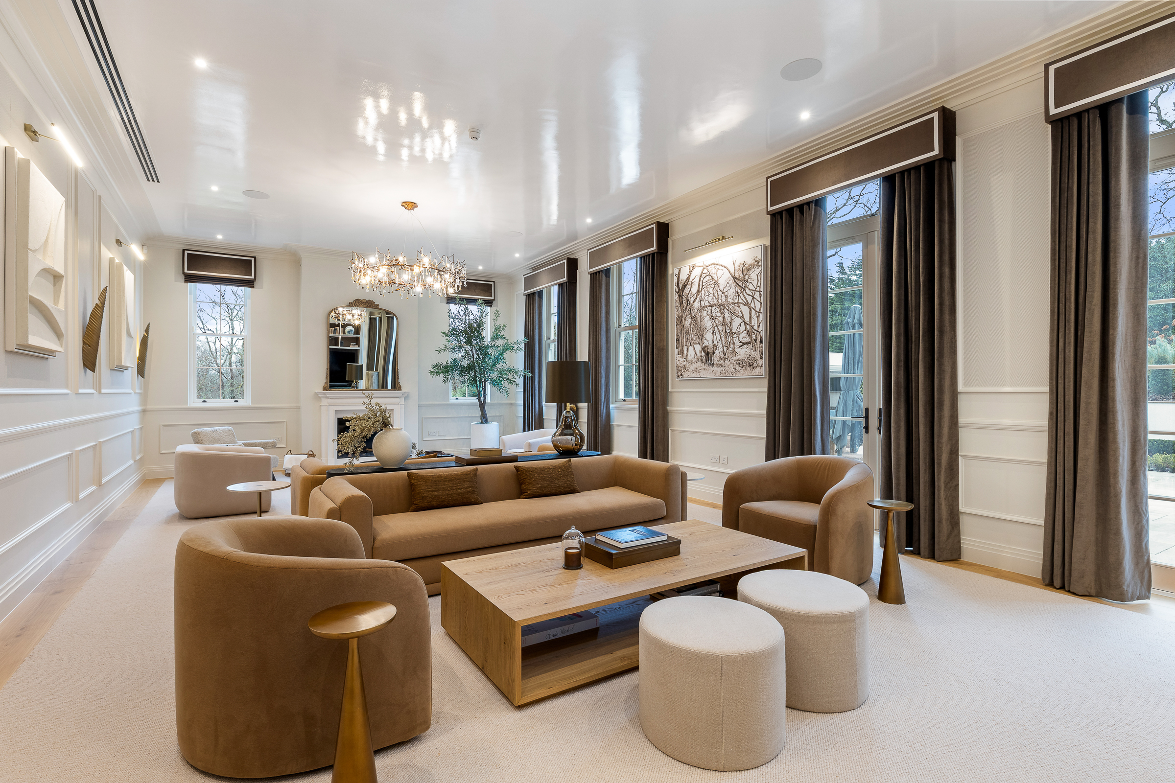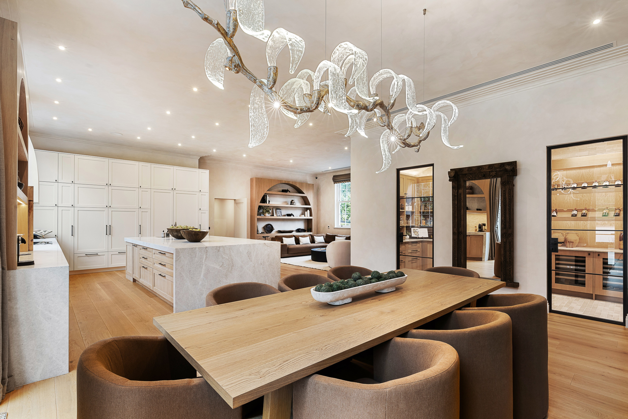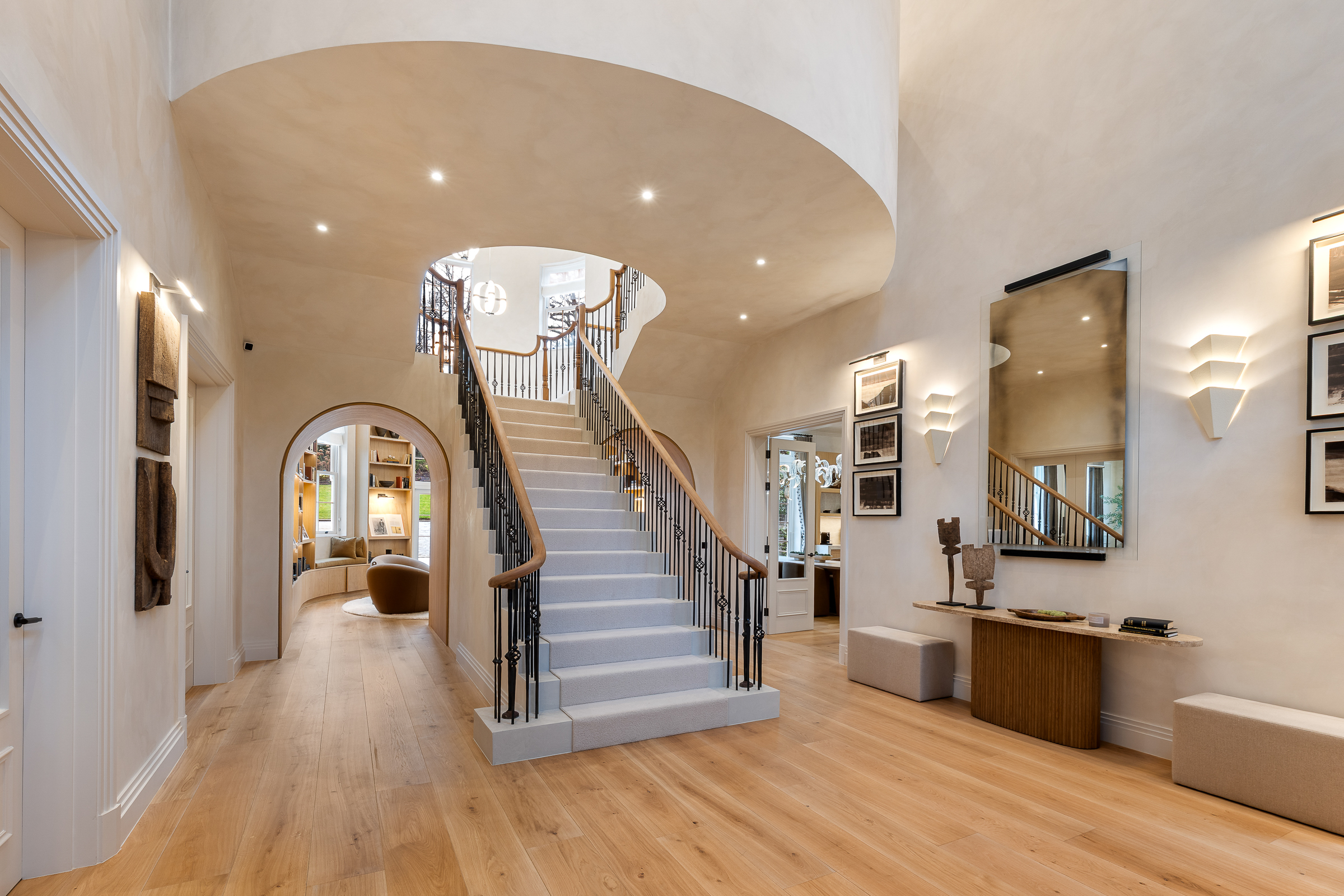 The house is arranged for both everyday living and large-scale entertaining, centred around a spectacular kitchen-dining-family room with bespoke cabinetry, premium integrated appliances and a climate-controlled wine room. Elegant formal rooms include a beautifully proportioned drawing room, a bespoke library / morning room, and a striking double-height galleried reception hall which sets the tone on arrival.