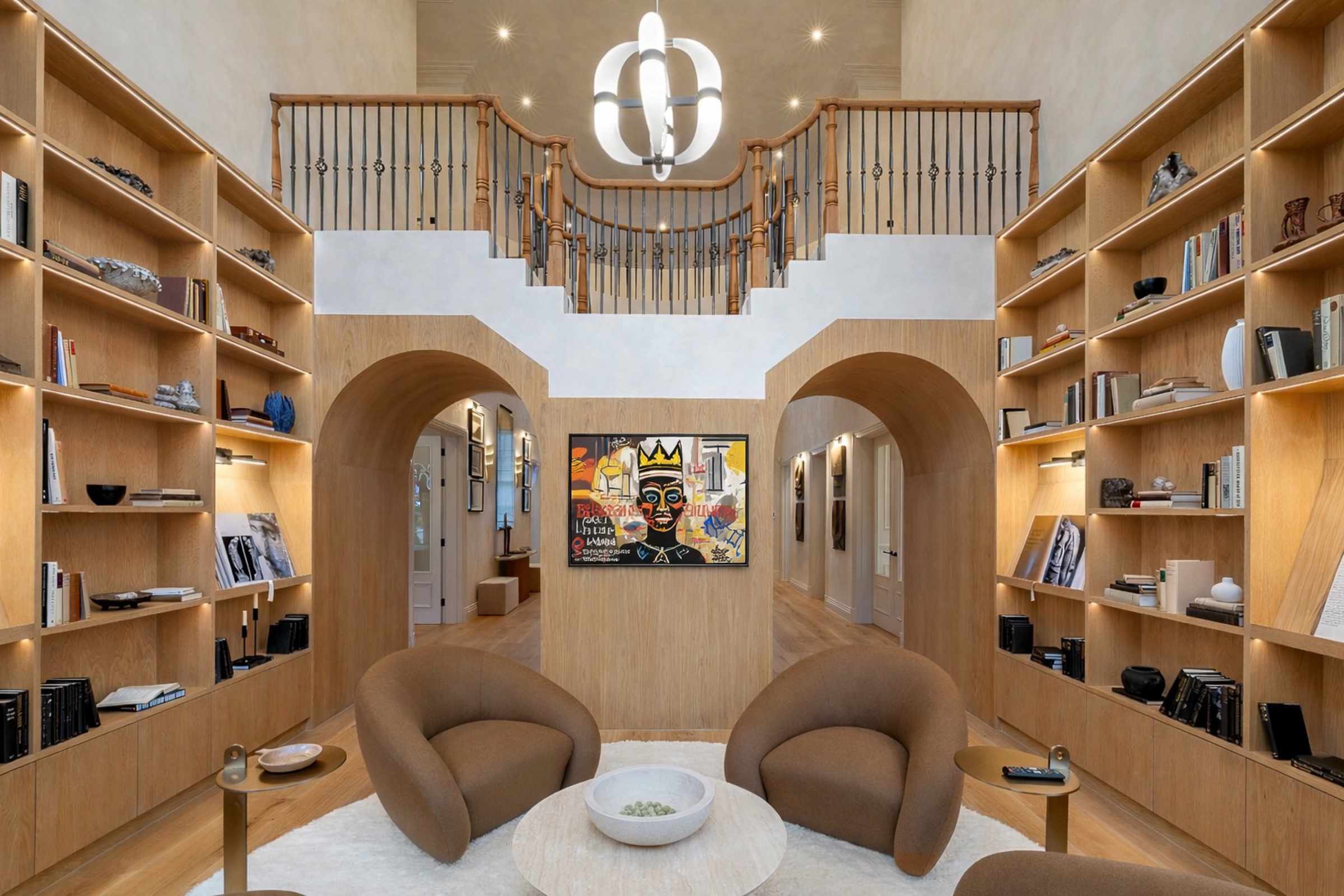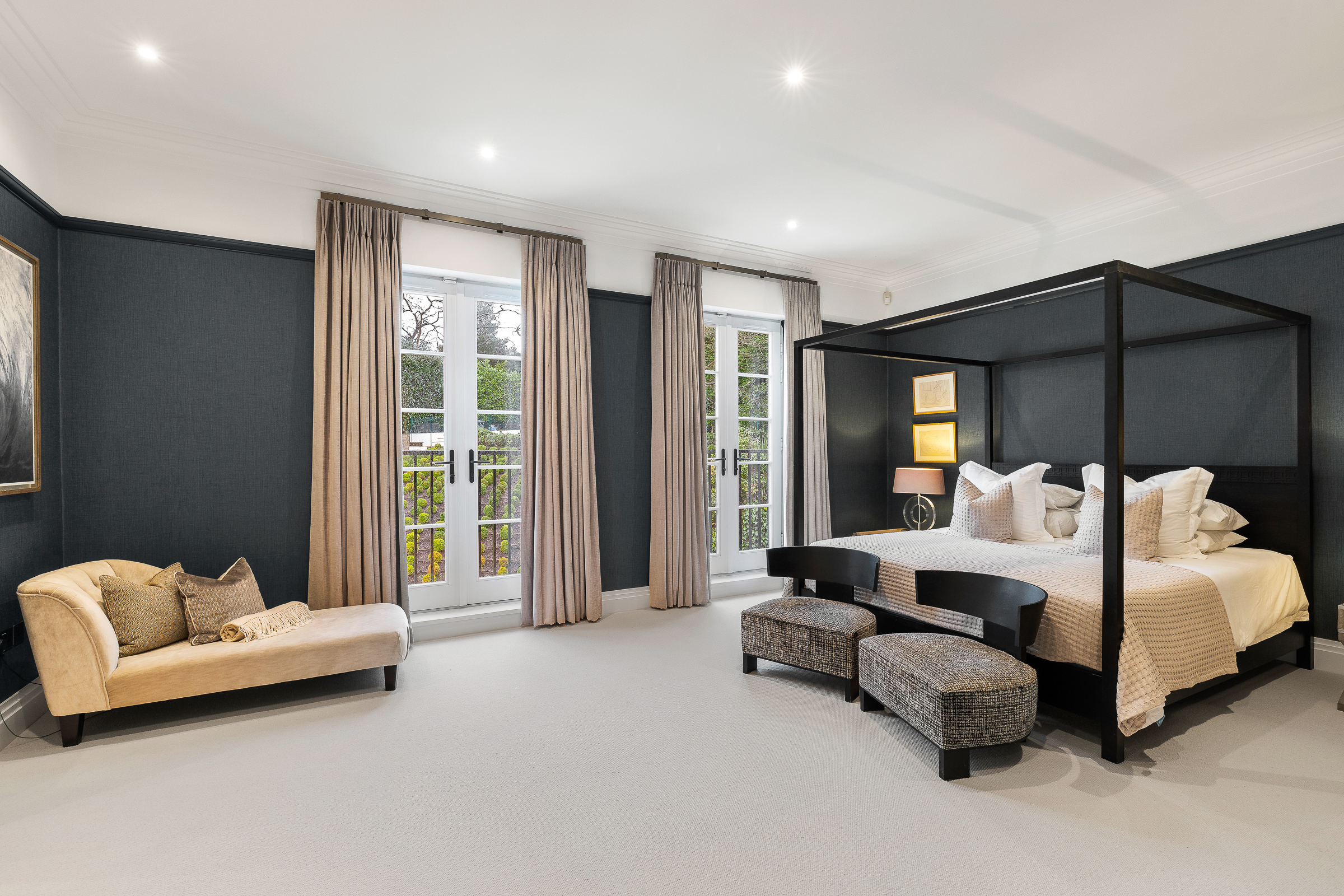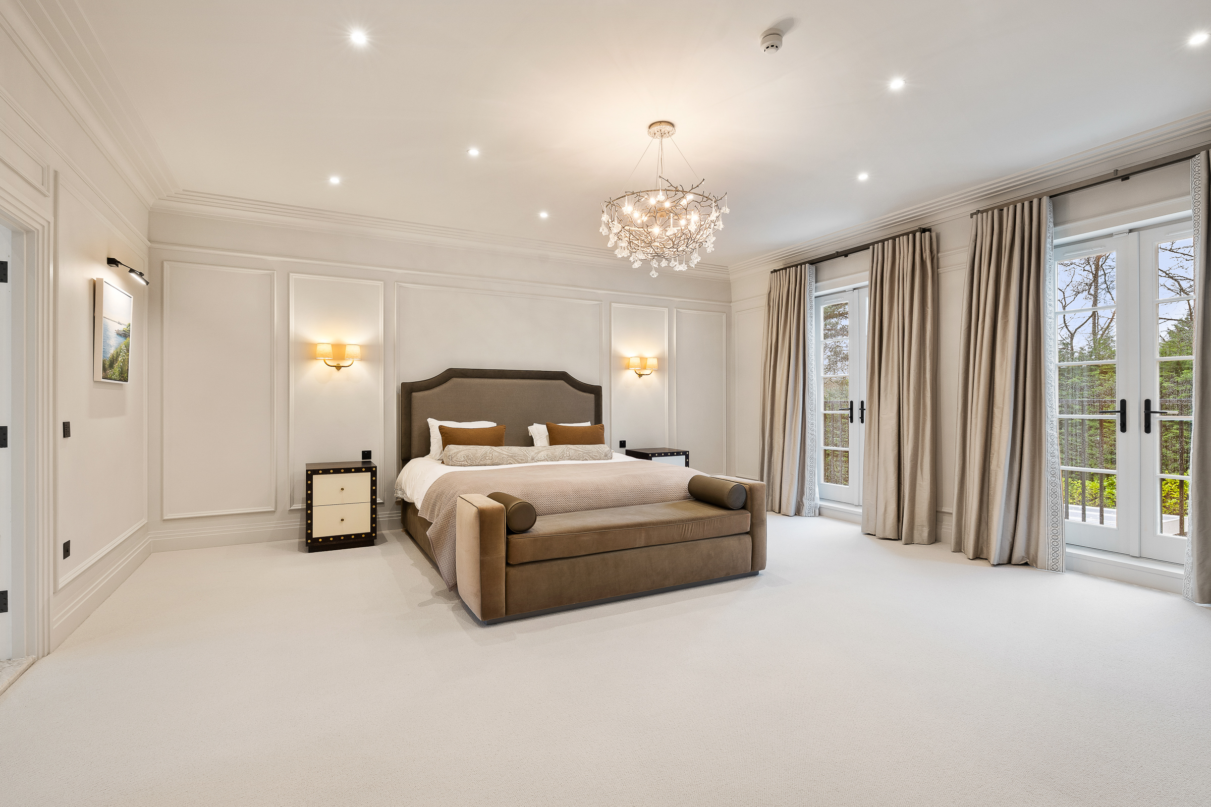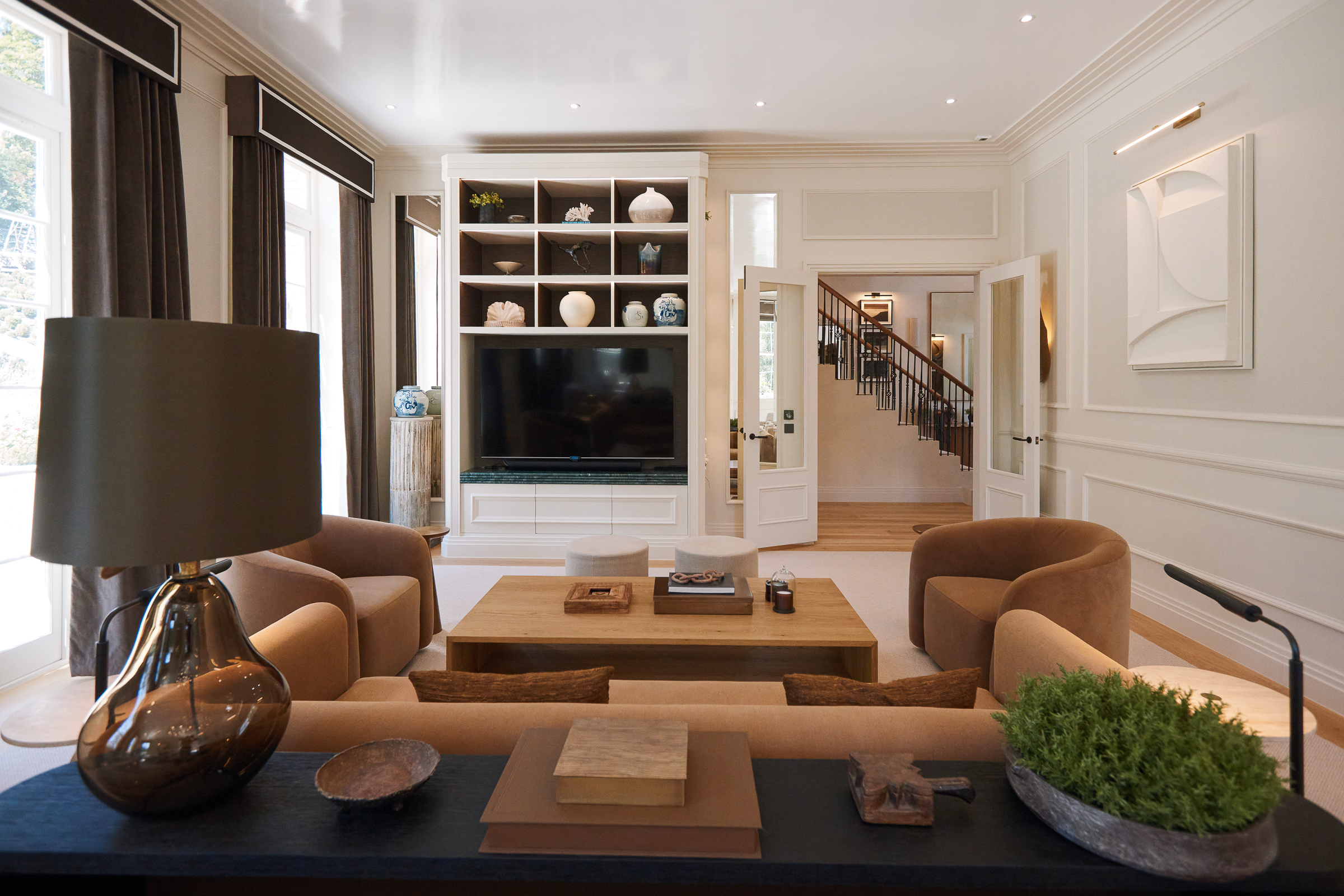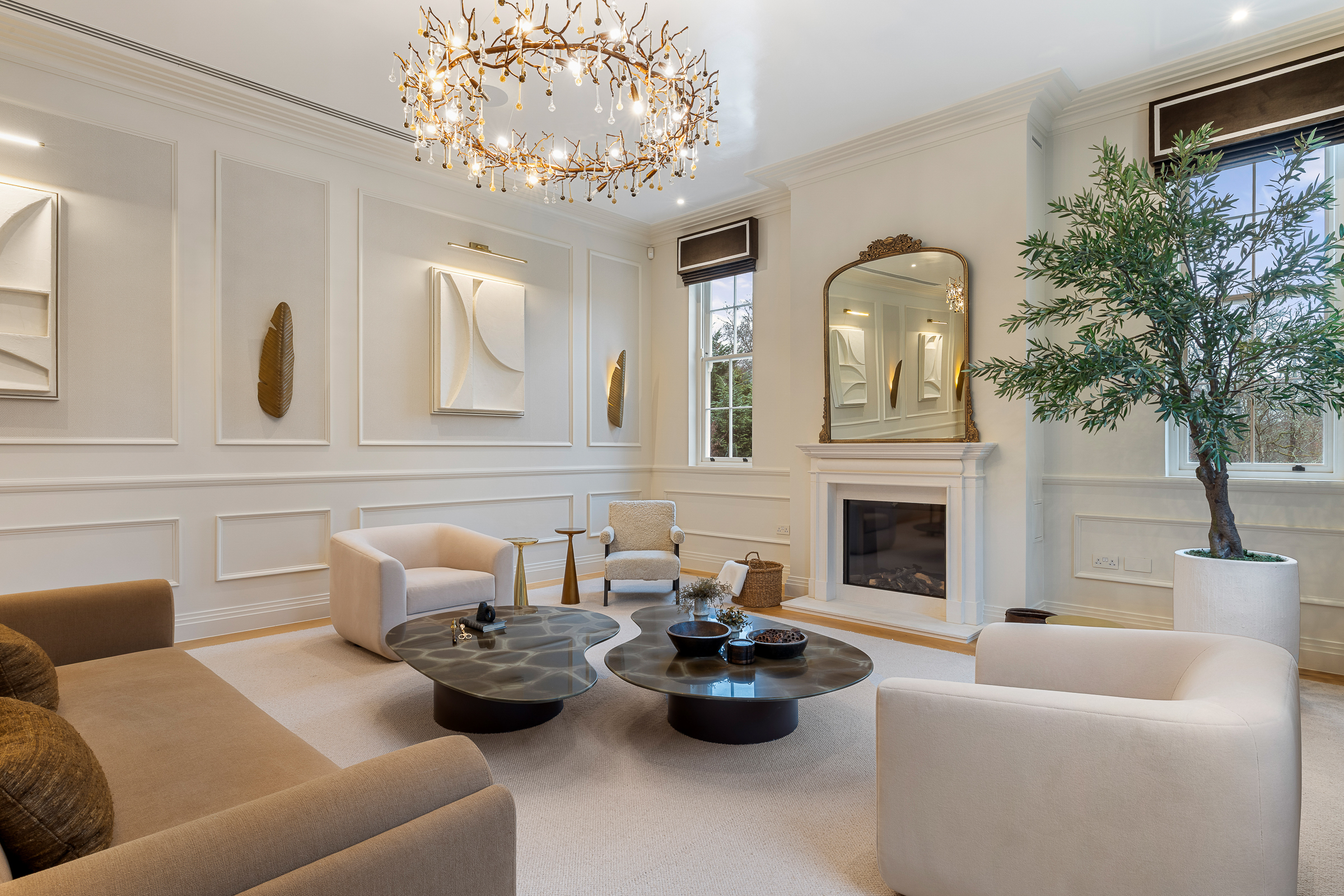 The house is arranged for both everyday living and large-scale entertaining, centred around a spectacular kitchen-dining-family room with bespoke cabinetry, premium integrated appliances and a climate-controlled wine room. Elegant formal rooms include a beautifully proportioned drawing room, a bespoke library / morning room, and a striking double-height galleried reception hall which sets the tone on arrival.