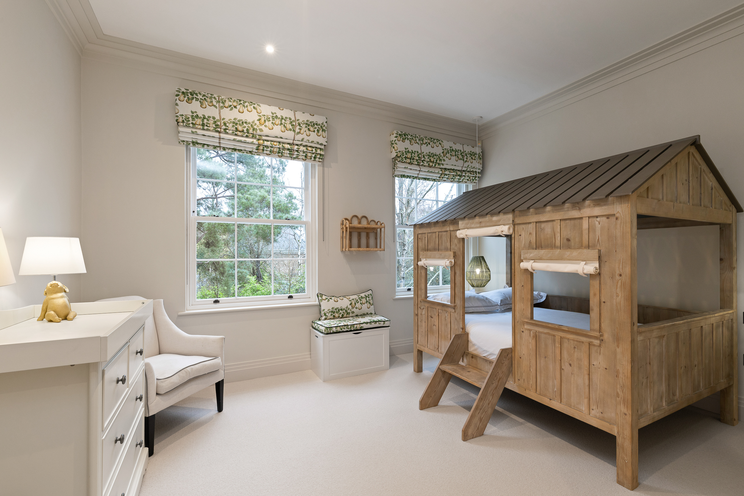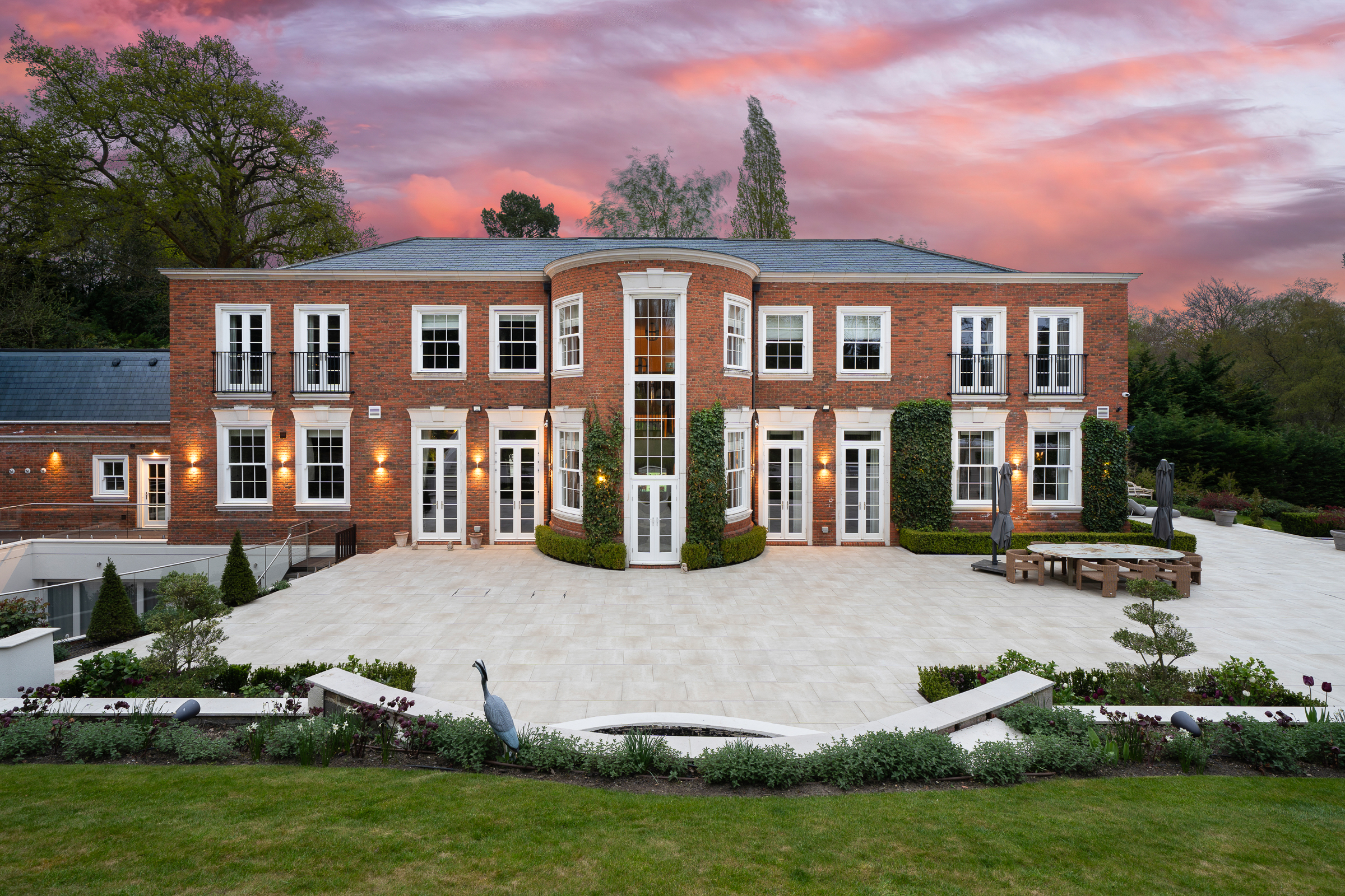 Outside, the landscaped approximately one-acre grounds have been professionally designed for family life and entertaining, with expansive patios, broad terraces, an outdoor pool, outdoor kitchen, covered seating area with fireplace and TV, level lawns, children’s play area, football pitch, putting green, ornamental pond and triple garaging.