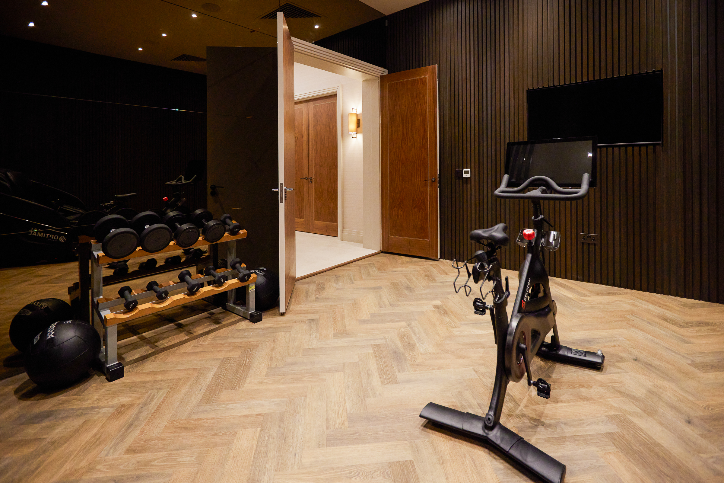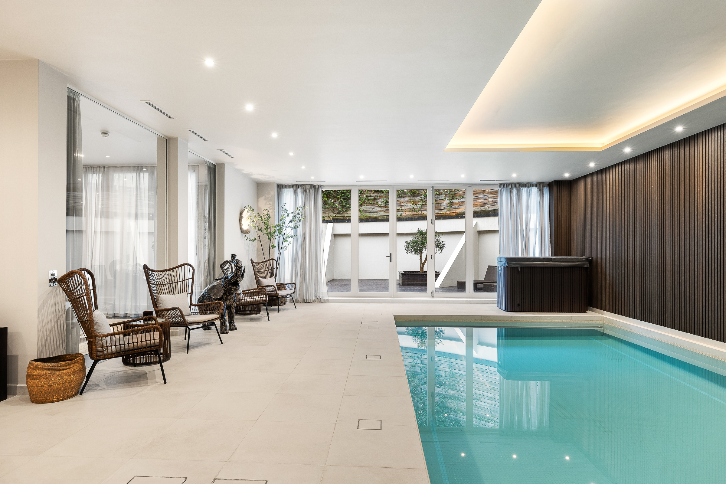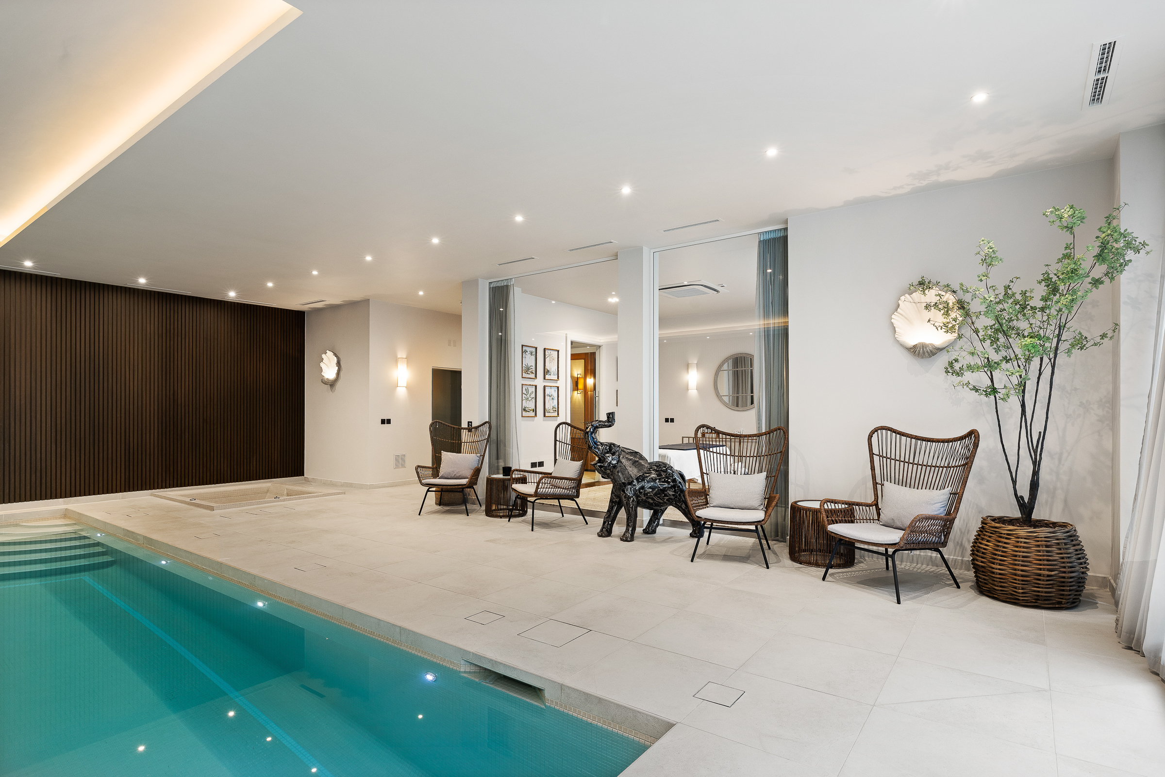 A particular highlight is the outstanding wellness and leisure floor, designed in the style of a private retreat, with an indoor pool, spa, plunge bath, gym, treatment and massage rooms, steam room, sauna, and twin changing facilities. Unusually, it also includes a hyperbaric chamber, cryotherapy chamber and red light bed, giving the house a truly distinctive wellness focus.