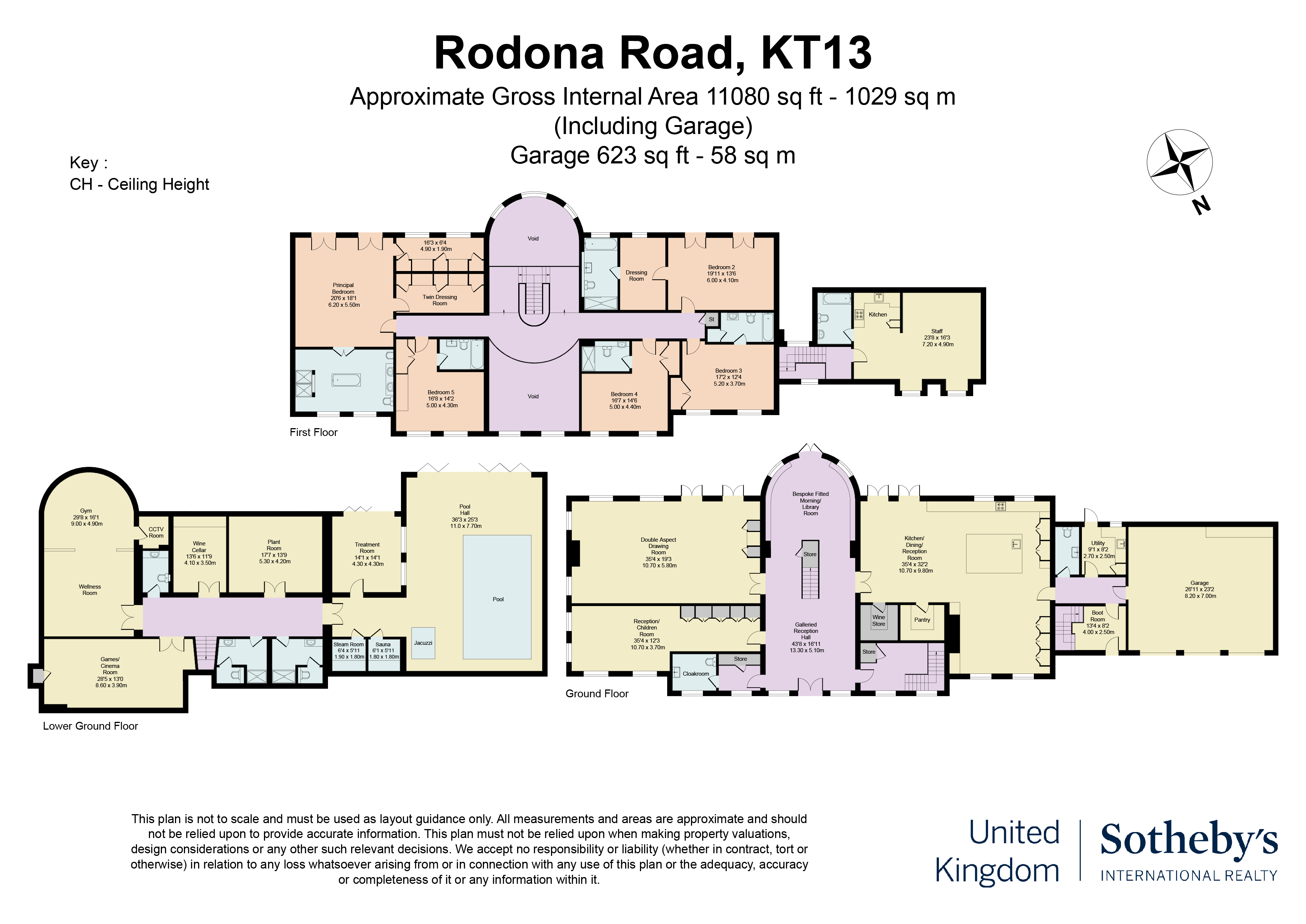 Further features include underfloor heating throughout, air conditioning to selected principal areas, integrated Sonos audio, smart lighting control, electric blinds, and a comprehensive alarm and CCTV system.