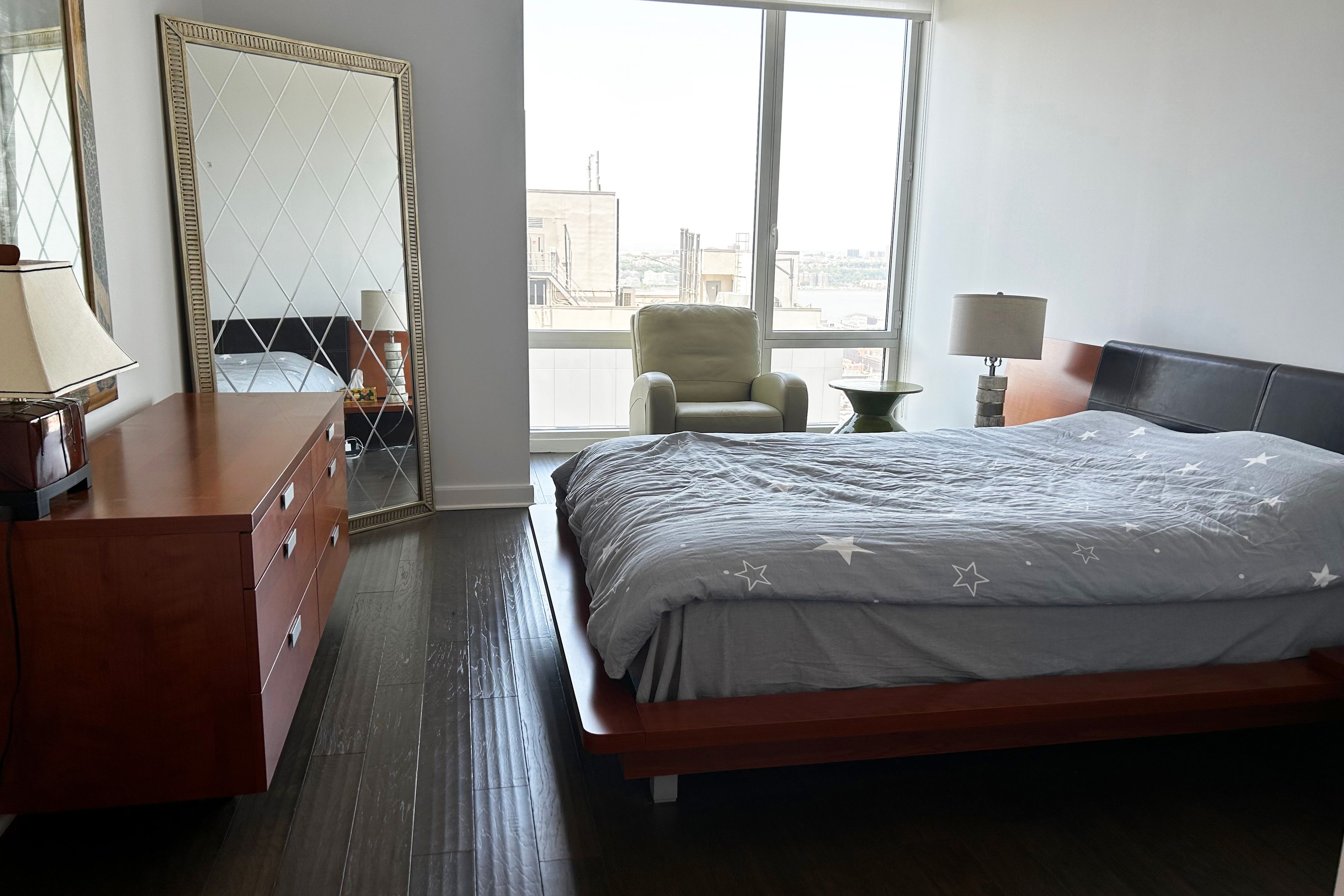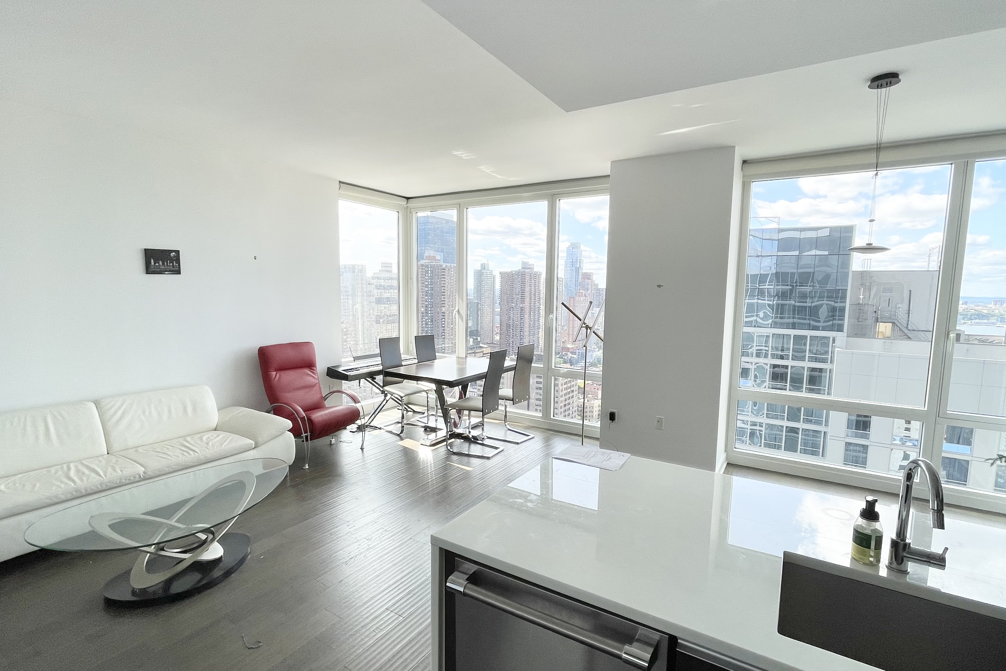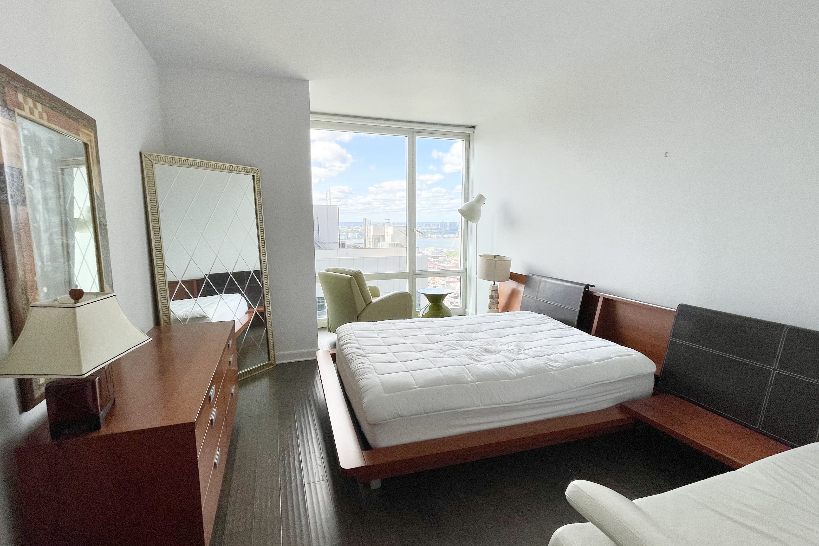 Stunning High Floor superbright Corner 1bed/one and a half bath Condo with beautiful Hudson River and City views. This very desirable apartment is flooded with sunlight with floor to ceiling 9.5 feet windows faces south and west and is just under a 1000+/-sf! The formal entry foyer leads into a generously proportioned and bright living room, dining area and a large open chef's kitchen, featuring white quartzite countertops, an oversized refrigerator, a wine cooler, garbage disposal and stainless-steel appliances. The spacious bedroom features impressive south-facing windows, a walk-in closet, an ensuite bath with a luxurious spa tub, and a separate shower. Substantial closet space, a powder room for your guests and an in-unit Bosch washer & dryer complete this apartment home. 247 West 46th Street is a luxury condominium designed by Costas Kondylis Architects and features a modern glass and steel facade. It is a full-service building with a range of amenities, including a 24-hour attended lobby, a 26-foot fireplace and water feature, bicycle storage, and cold storage. The Zone resort amenities floor spans 6,000SF: Indoor and outdoor Yoga Studios, Golf Simulator, Life Fitness Weight Training, Cardio, Spa, Social Sauna, LCD televisions for viewing enjoyment, and the Zone Lounge with billiard tables and access to a plush outdoor wrap around terrace-lounge with spectacular Manhattan Skyline Views. The Platinum is conveniently located close to Rockefeller Center, Grand Central, Lincoln Center and Central Park, at the heart of the Theater District. Subway lines include; C,E,N,R, W, and 1 train. Application Fee: $400 Credit Check Fee: $80 Move-in Fee: $500 Move-out Fee: $500 Move-in Deposit: $500 Move-out Deposit: $500 No dogs please. Available FURNISHED only on June 1, 2026.