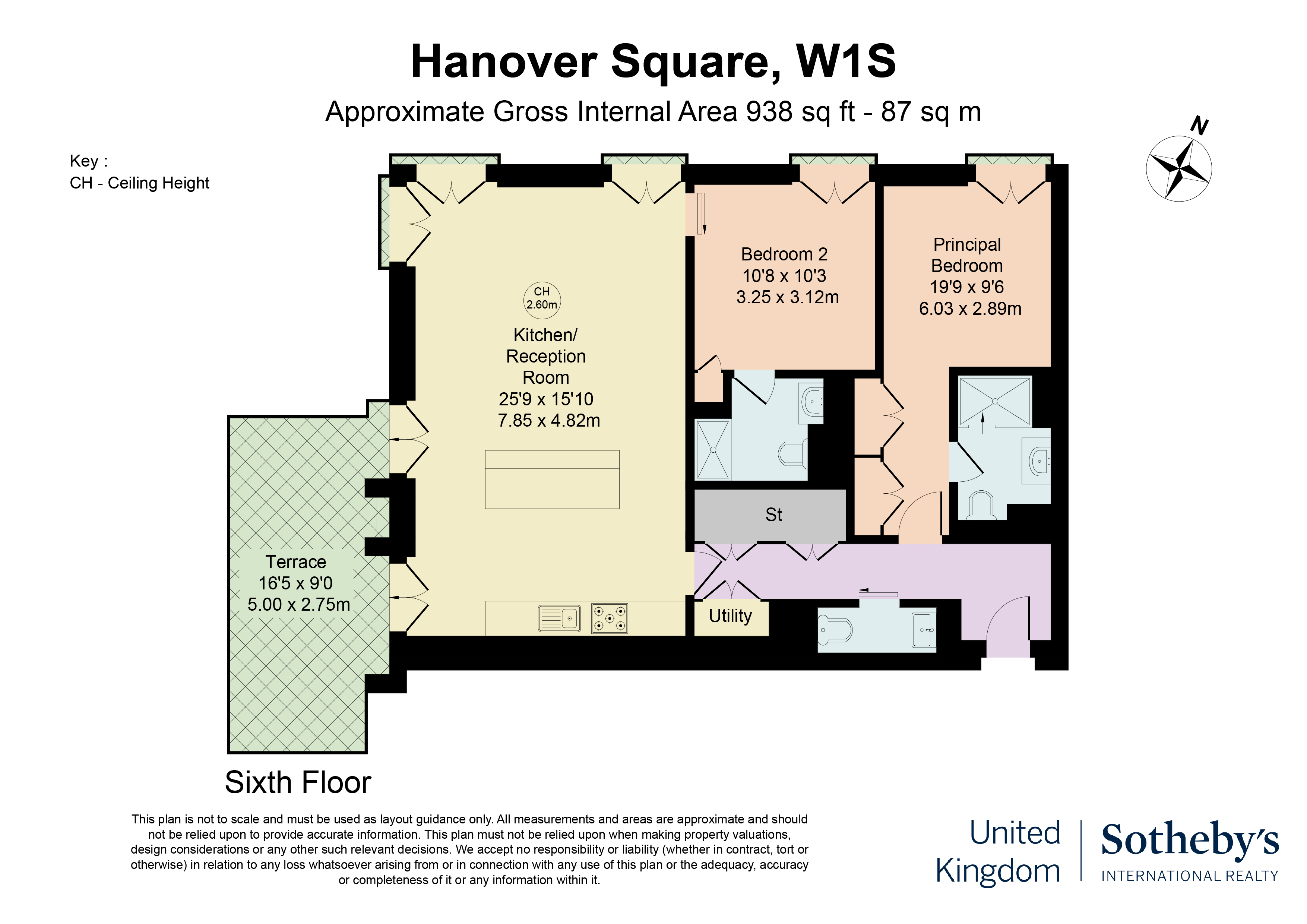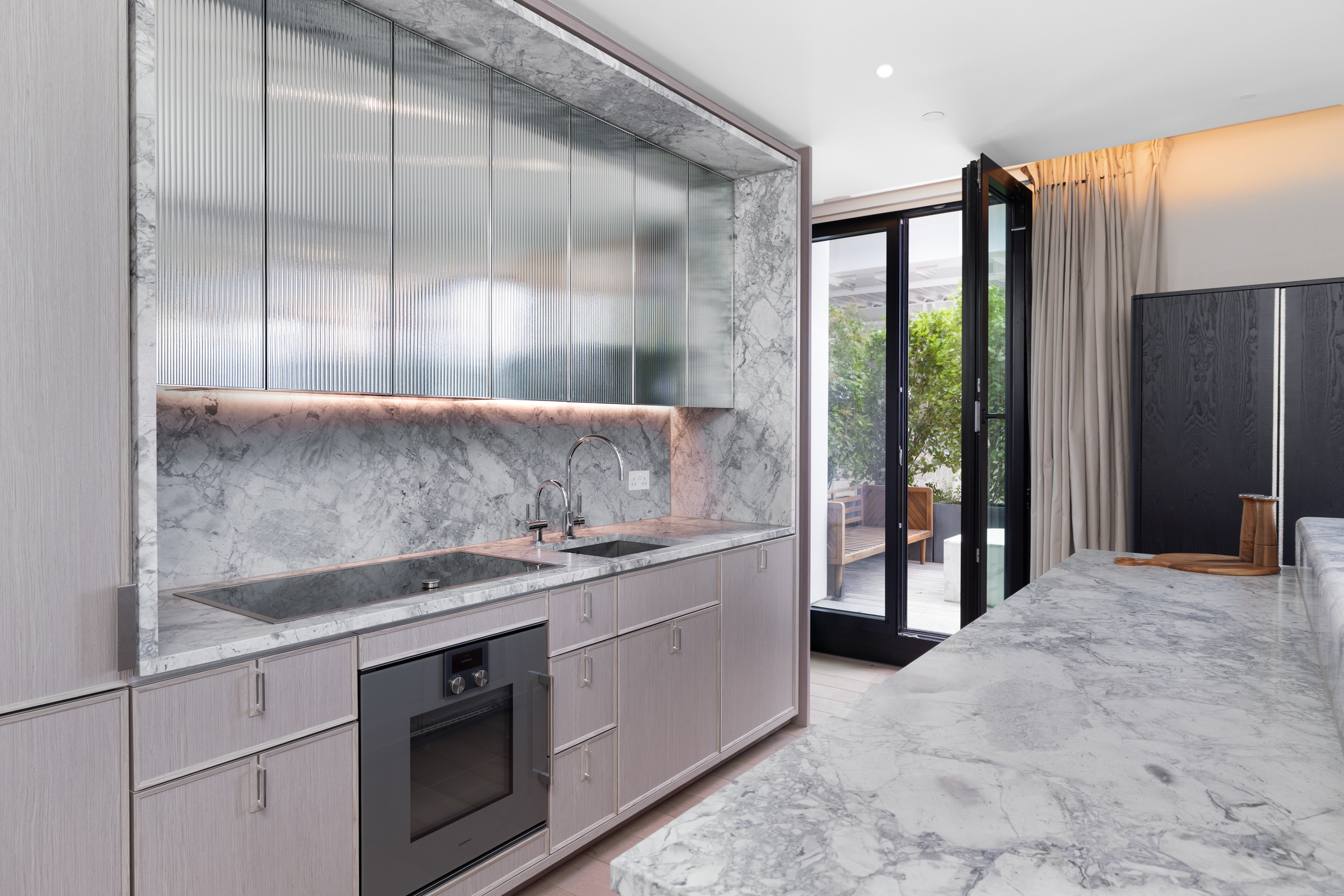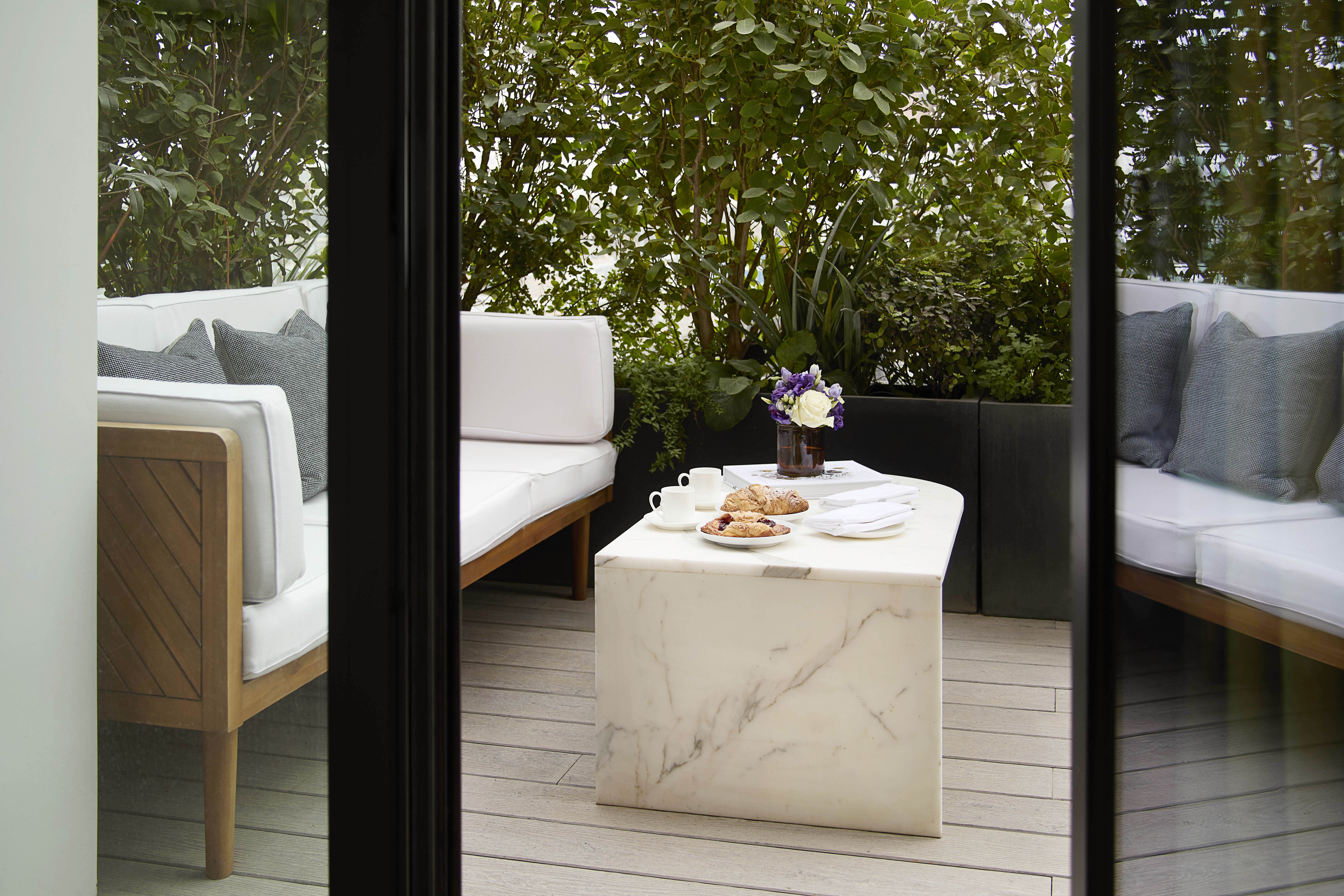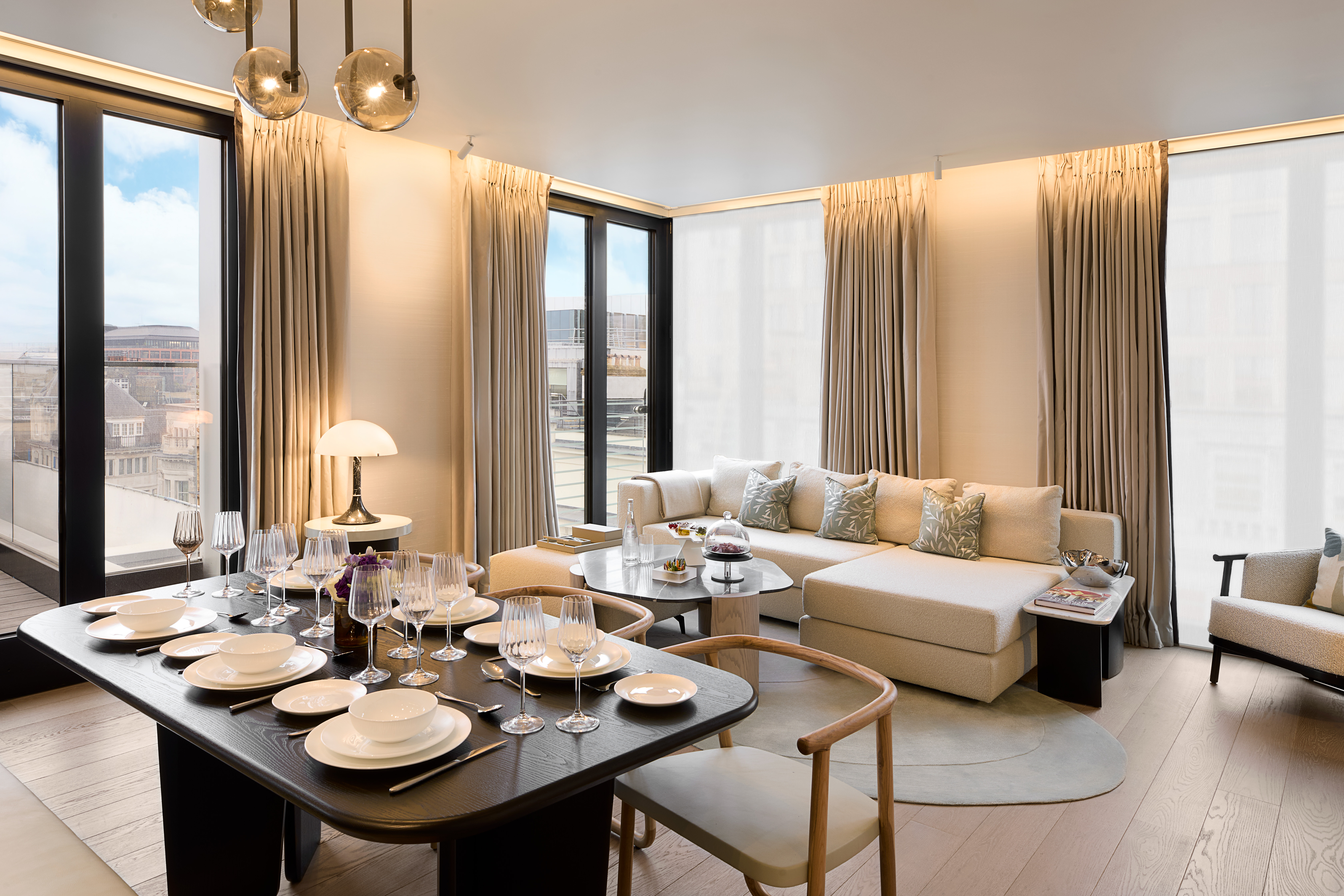 The open-plan reception, dining, and kitchen area wraps the corner and opens directly onto the terrace, creating an unusual sense of light and openness for a Mayfair home. The principal bedroom includes an ensuite bathroom and Juliet balcony with views across Mayfair. A second double bedroom, also ensuite, completes the accommodation, together with a separate powder room.