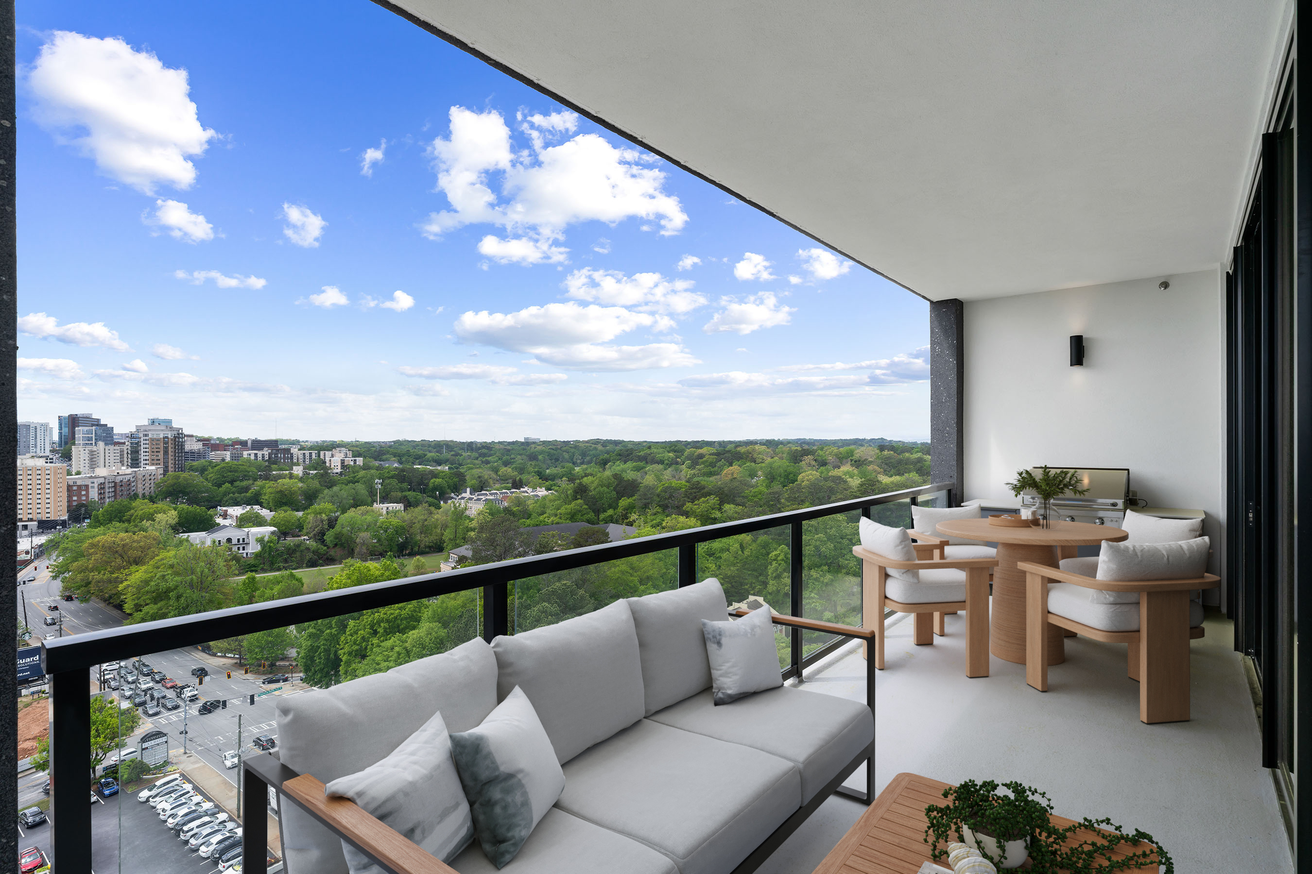 Experience elevated luxury living at The Dillon, Buckhead’s newest and most refined high-rise residence. This elegant three-bedroom plus den condominium offers a rare combination of sophisticated design, panoramic skyline views, and an amenity package unrivaled in Atlanta. Perched above the treetops, this residence captures sweeping vistas of the Midtown and Downtown skylines, as well as tranquil eastern sunrises through floor-to-ceiling windows and from the expansive 7’9” x 27’ covered terrace, complete with a built-in grill. Inside, wide-plank hardwood floors, custom automated shades, and an open yet intimate layout create a serene and polished living environment. Each of the three bedrooms is en-suite, complemented by a refined powder room and a separate den—ideal for a study, lounge, or media retreat. The primary suite is a true sanctuary, featuring a spa-inspired bath with dual vanities, a freestanding soaking tub, and a frameless walk-in shower. A generous laundry room adds to the home’s everyday functionality. Two dedicated parking spaces and a private storage unit are included with the residence. Residents of The Dillon are greeted by a grand motor court and enjoy valet and concierge service. The fourth-floor amenity deck is nothing short of extraordinary, offering a resort-style pool, pickleball court, private cabanas, firepit lounges, and a fenced dog park. Inside, “The Hub” provides a dynamic co-working environment, while a Resident’s Lounge, Golf Simulator Room, private Theater, and hidden Speakeasy offer inspired spaces to unwind and entertain. Several photos in this listing are virtually staged.