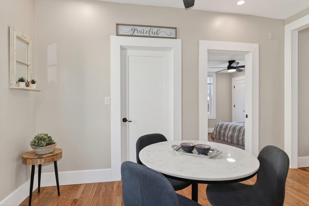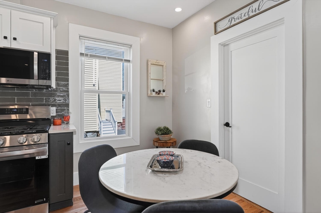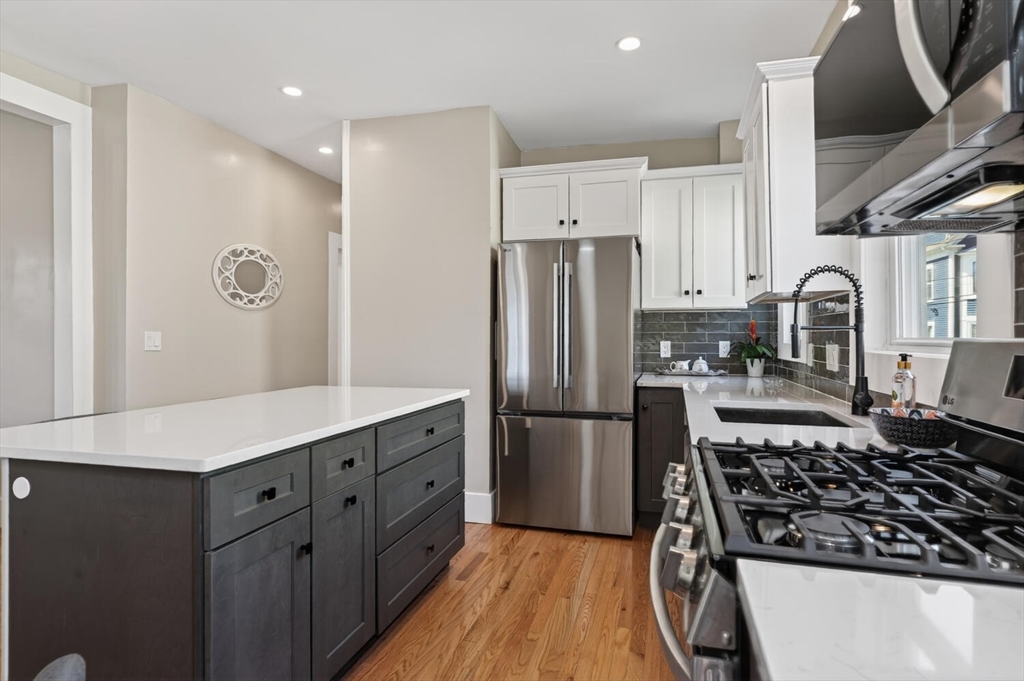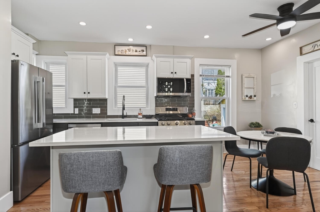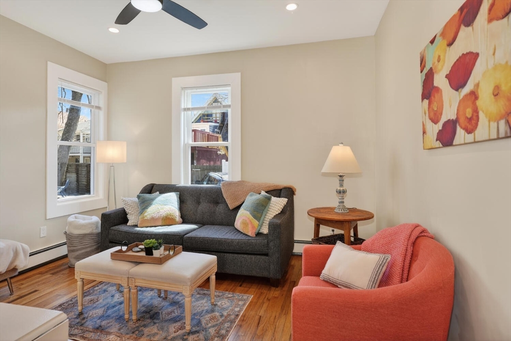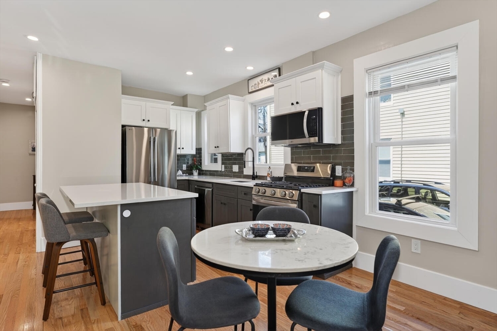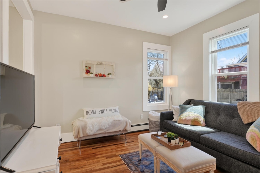 An Urban Oasis in Woodbourne. Discover a rare find: a stunning 3-bed, 2-bath condo tucked on a quiet dead-end street with a sprawling 3,000+ sq ft shared backyard and patio. Step inside to a sun-splashed home fully transformed from top to bottom. Soaring ceilings, gleaming hardwoods, and oversized windows create an airy, inviting feel. The showstopping open-concept kitchen features white shaker cabinetry, a large island, quartz countertops, and stainless appliances - perfect for everyday living and entertaining. The retreat-like primary suite offers a brand-new ensuite bath, while two additional bedrooms provide great space and flexibility. Enjoy peace of mind with extensive building updates including new siding, roof, windows, front porch, blown-in insulation, and high-efficiency heating. Additional perks include in-unit laundry, two deeded parking spaces, and ~200 sq. ft. of private storage. All near Forest Hills, the Arboretum, and JP/Roslindale dining. Your urban sanctuary awaits!