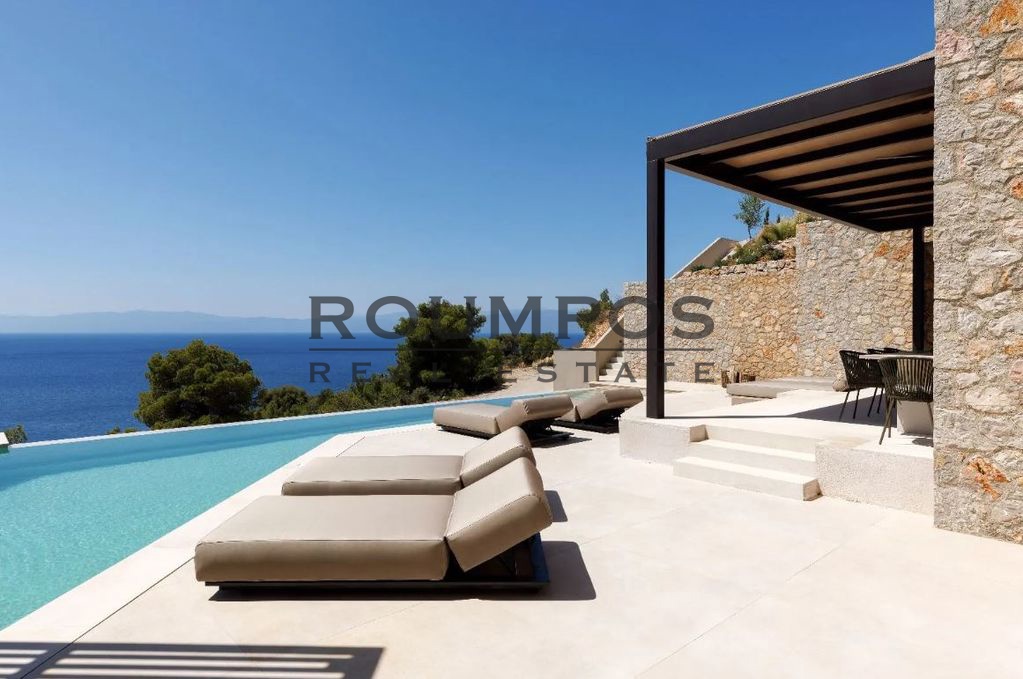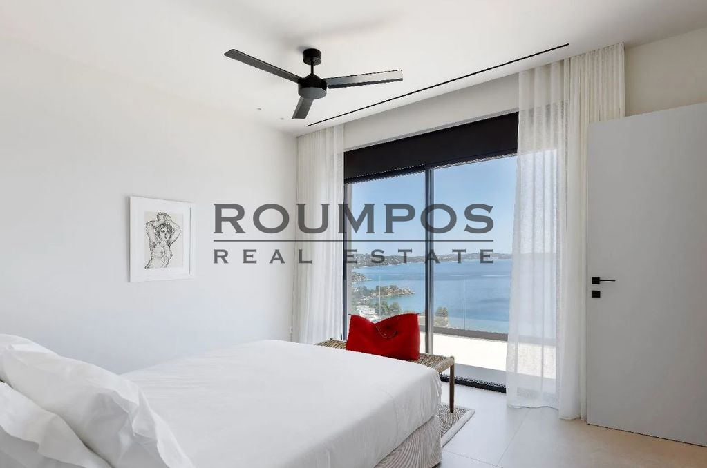 The bedrooms, with unobstructed sea views, combine elegance with simplicity, while large windows allow natural light to flow in, creating a warm and welcoming atmosphere. The living room and outdoor areas are ideal for relaxation, with terraces and seating areas offering stunning views of the endless blue sea.