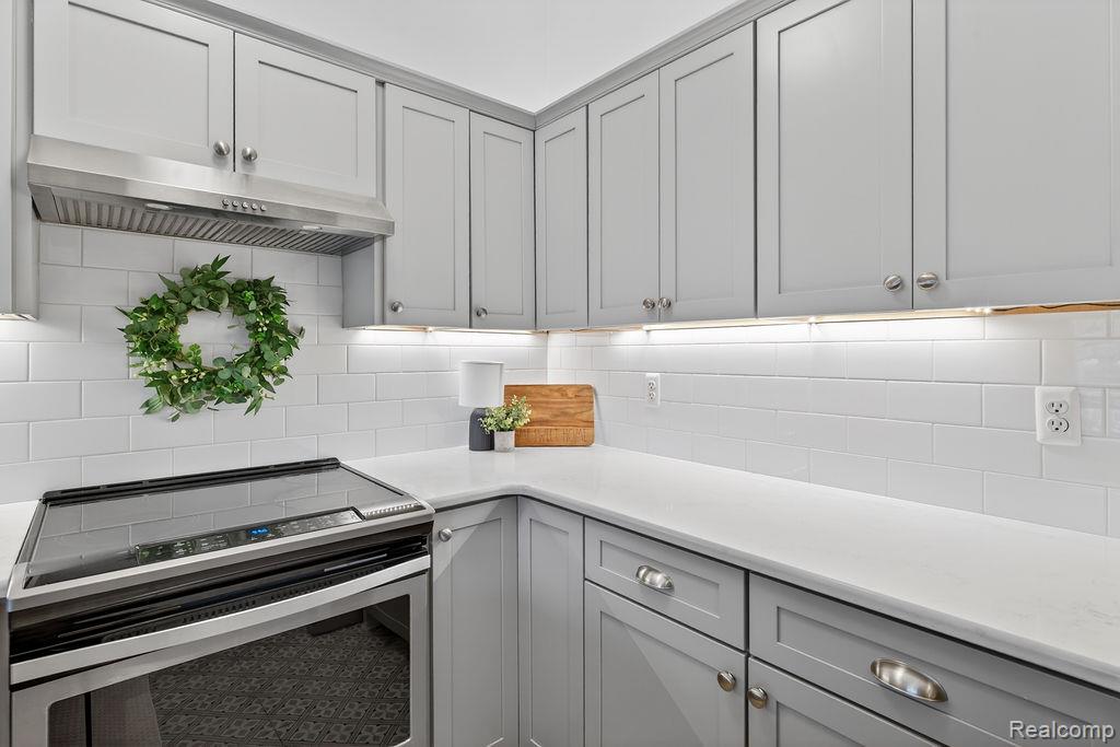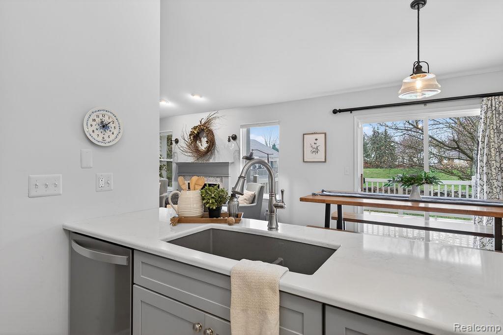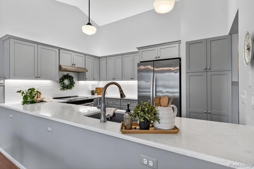 Beautifully updated 2-bedroom, 2-bath ranch condo offering a bright, open layout and high-end finishes throughout - plus a fantastic location! Nestled in a desirable community with a scenic walking trail and conveniently located near Heritage Park, this home combines comfort, style, and accessibility. Featuring light, neutral tones, vaulted ceilings, and a seamless blend of honey ash wood flooring and ceramic tile, the space feels both warm and spacious. The fully renovated kitchen (2019) showcases quartz countertops, soft-close cabinetry, classic white subway tile backsplash, under-cabinet lighting, and custom fixtures - every detail thoughtfully selected down to the cabinet hardware. The dining area opens to a newer Trex deck, perfect for low-maintenance outdoor enjoyment. The inviting living room highlights a stunning tiled fireplace and custom built-in bookcase, creating a cozy yet refined focal point. Both bathrooms have been beautifully updated with quartz surfaces, custom sinks, and tiled showers and flooring. The spacious primary suite features a large walk-in closet and private en-suite bath, while the second bedroom offers charm and natural light with a lovely bay window. Additional features include ample storage, a full basement ready for your finishing touches, and a 2-car attached garage complete with custom stairs and $1,000 in heavy-duty shelving. Enjoy added peace of mind with a whole-house Generac generator. Exceptionally clean and meticulously maintained, this condo offers an elevated, move-in ready lifestyle with truly high-end upgrades throughout in a prime location! Note: Dining room curtains and rod are excluded. Deck to be virtually staged.
