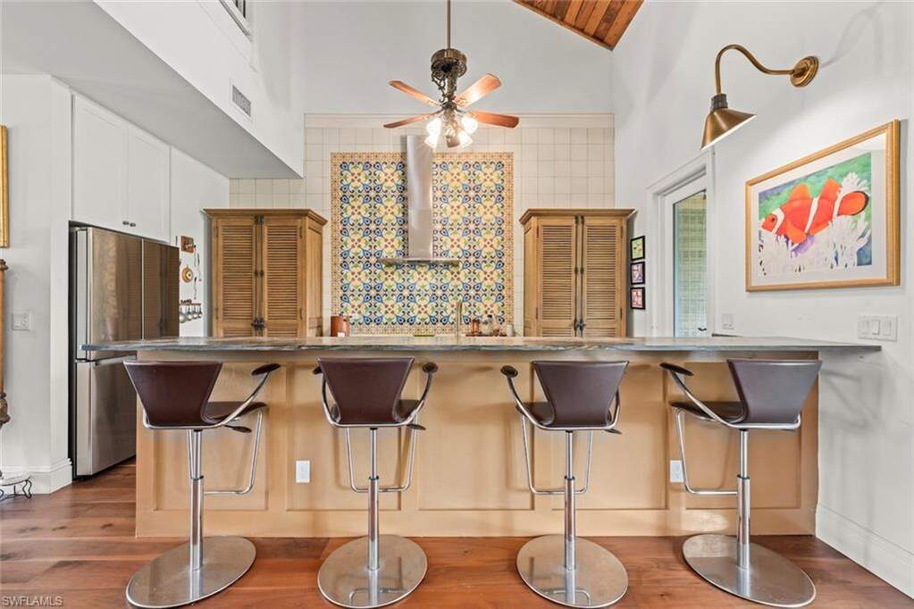 Beautiful, strong, elevated, and worry-free! Built in 2016 by Seacoast Cottage Company, this striking Key West style home has a relaxed and inviting feel with its open plan, high ceilings, and wrap-around verandas. Lots of natural light showcases the quality finishes throughout, which includes cypress tongue and groove ceilings, gorgeous walnut engineered wood flooring, and curbless showers. A vibrant Cuban-style backsplash made with hand-crafted tiles is the focal point of the kitchen and is both warm and welcoming. The split bedroom plan has a spacious primary suite. There is plenty of closet space and privacy. An elevator leads from the ground level to the upstairs loft with two home offices or dens on each end. Fortified with impact resistant doors, windows, metal roof, and Hardie Board siding. This lovely property looks out onto conservation land providing peaceful nature views, rest and relaxation. Conveniently located in the popular Dunes Golf & Tennis community, close to the Sanibel causeway, shops and restaurants. Deeded beach access. Permitted for a future pool. All this and very low insurance rates.