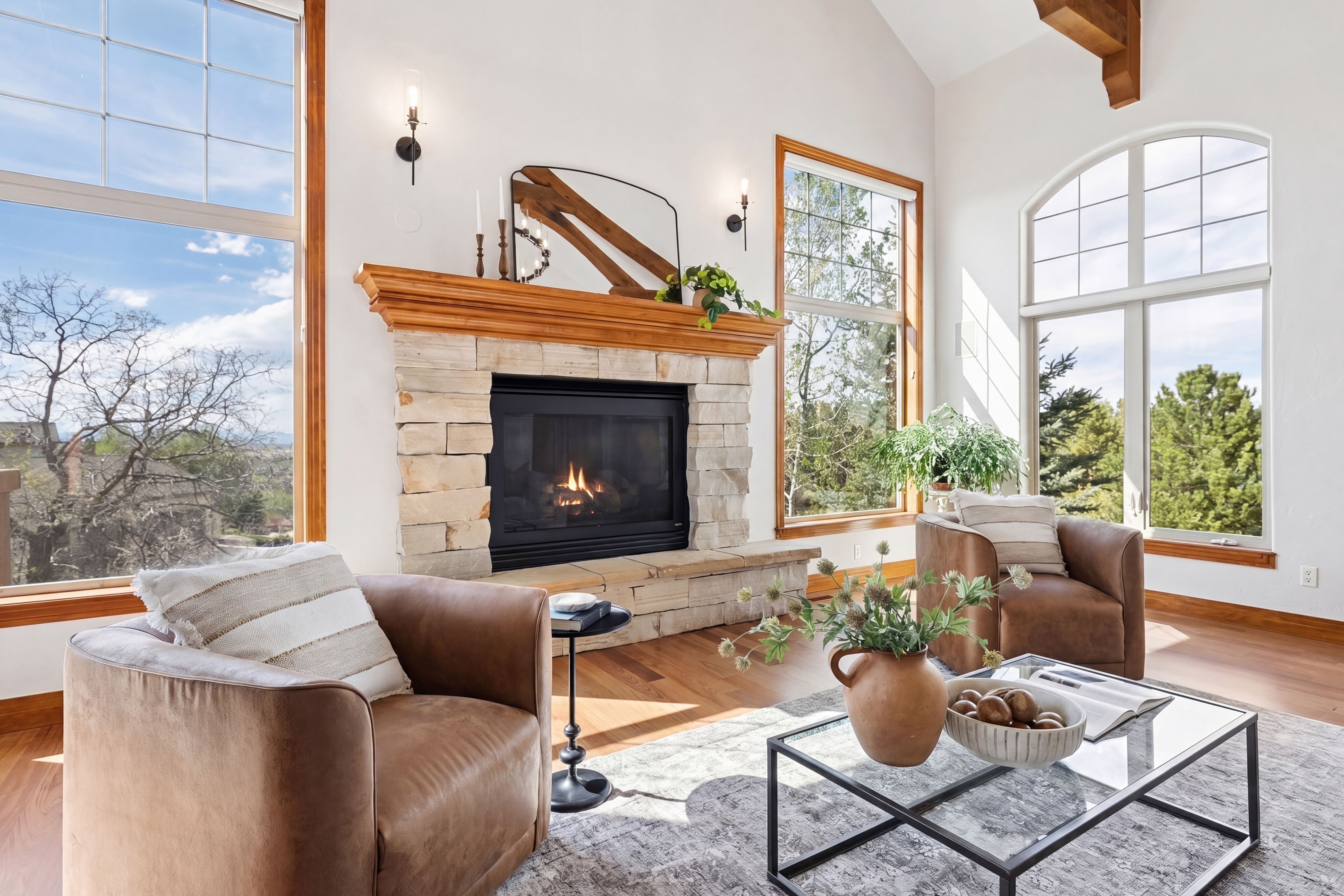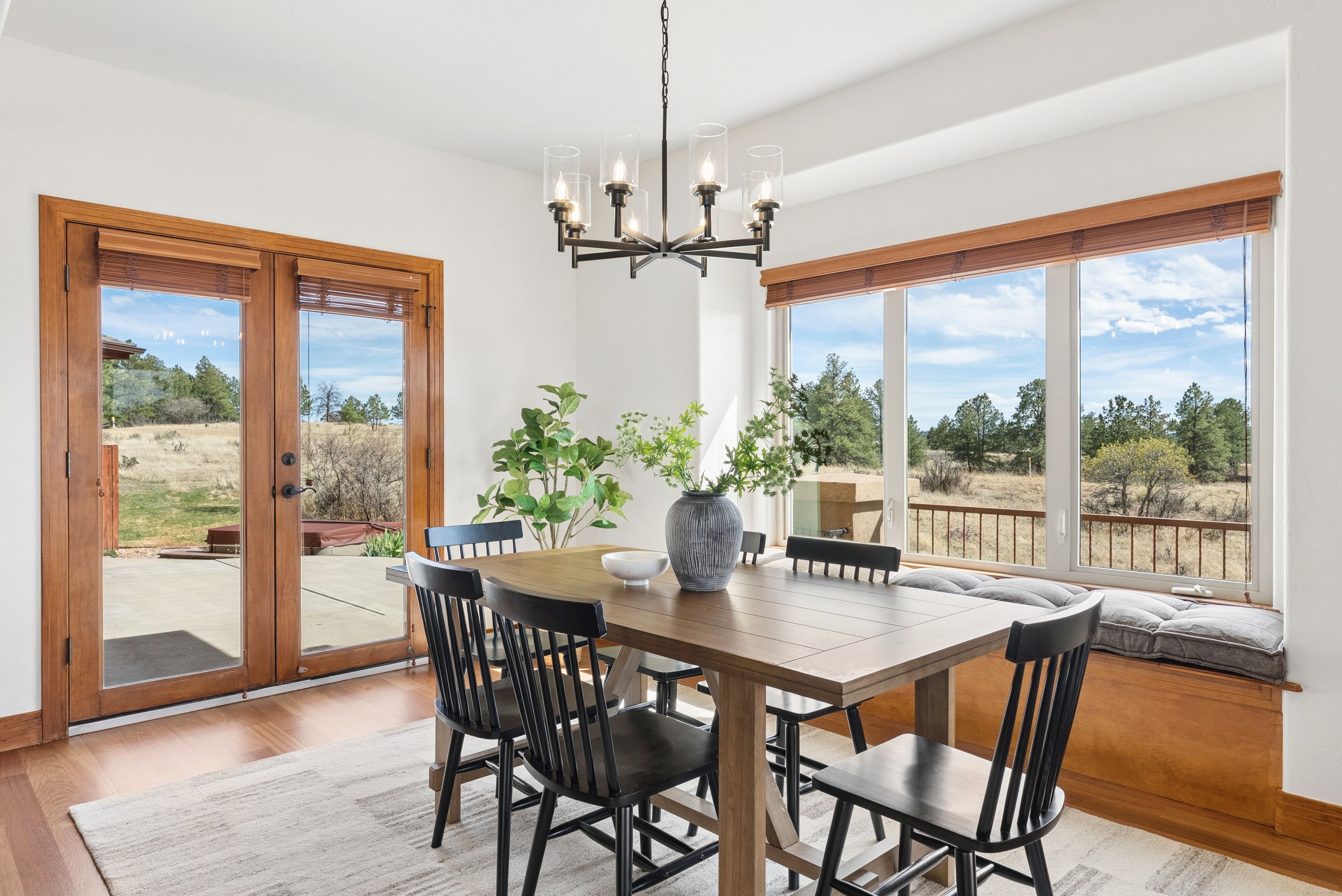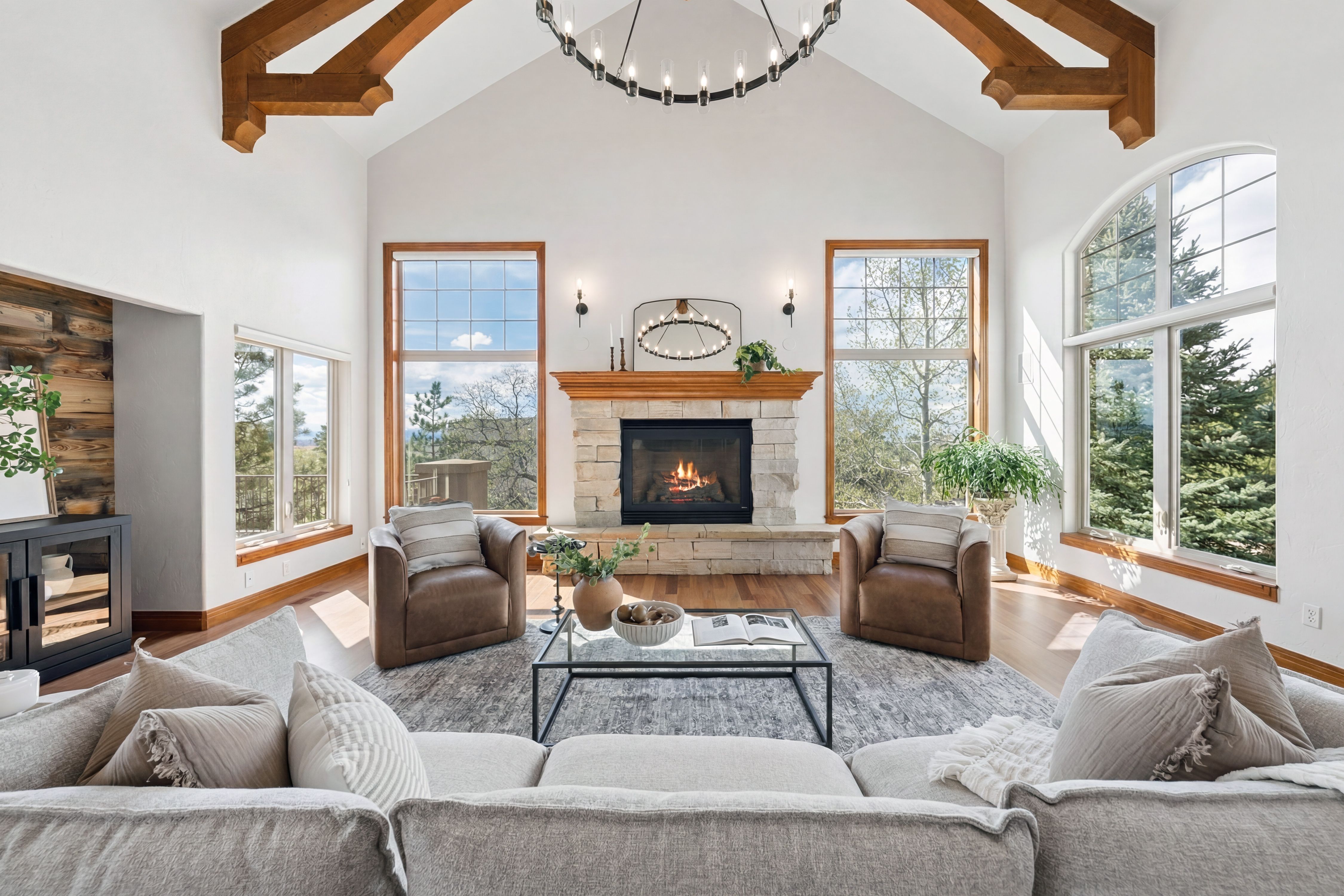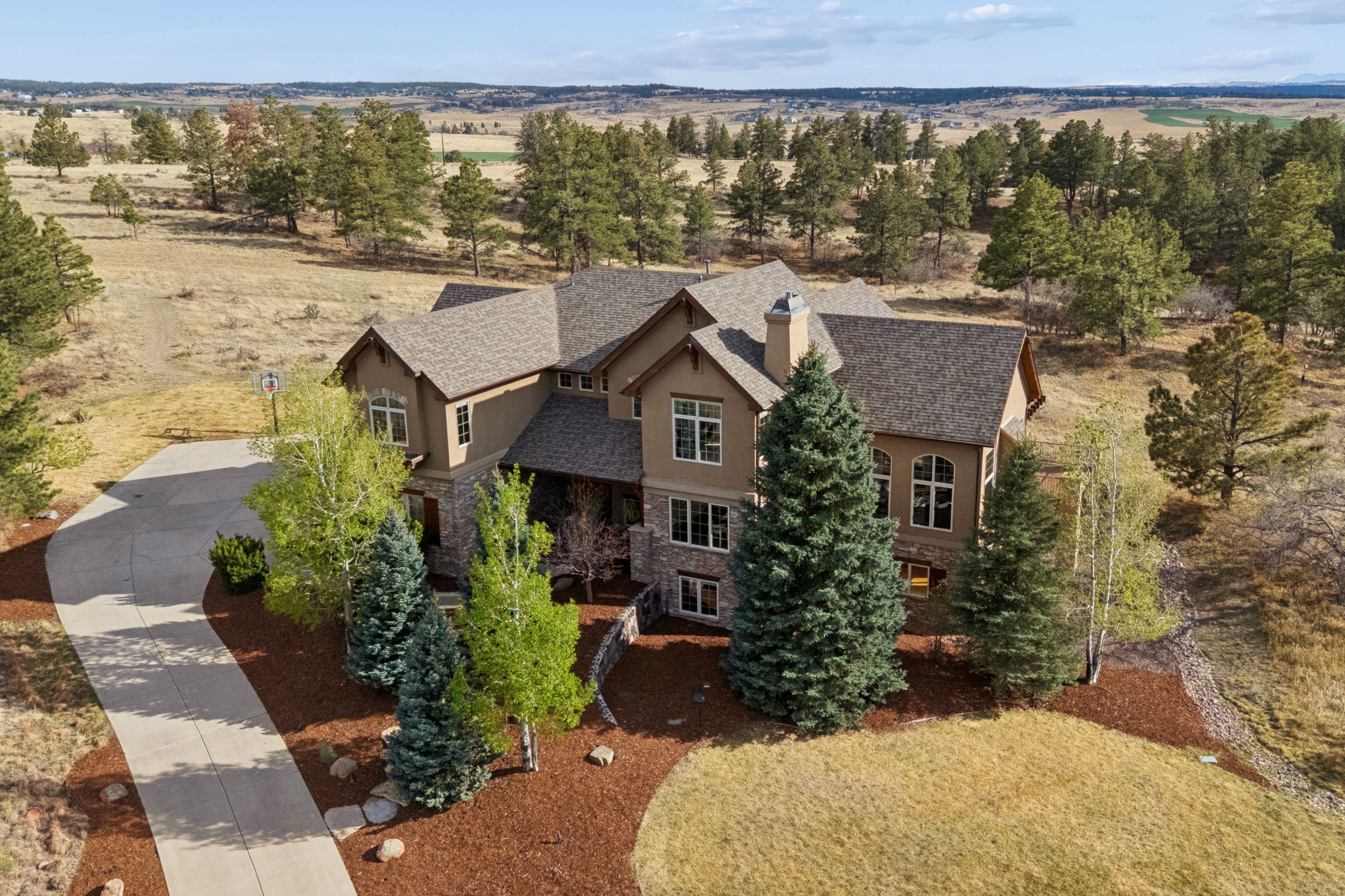 Set high on a hill in The Timbers and backing to open space, this custom two-story estate offers exceptional privacy on a beautifully treed 1.3-acre site, with sweeping mountain views that stretch from Long’s Peak to Pikes Peak. The setting is quiet and secluded, thoughtfully positioned to capture Colorado’s natural beauty at every turn. Beyond the setting, the home itself delivers soaring ceilings, rich wood beams, and expansive picture windows that frame the views and fill the space with natural light. The main level is anchored by a warm, inviting great room just off the kitchen, along with a formal dining room and a private study with fireplace. The kitchen is well-equipped and functional, featuring a large island with bar seating, a secondary prep sink, beverage refrigerator drawers, a wine refrigerator, and a six-burner Thermador gas cooktop. Double patio doors from the dining area open directly to the new deck, creating an easy indoor-outdoor connection. Fresh paint, newly refinished hardwood floors, and brand-new carpet (upstairs) bring a clean, updated feel throughout. Upstairs, four bedrooms include a spacious primary suite with a sitting area, fireplace, and private deck positioned to take in the full span of mountain views. Each secondary bedroom offers direct bathroom access and walk-in closets, creating a thoughtful upper-level layout. The finished walkout basement adds a dedicated theater/media room, large family room with bar, exercise room, and a private guest suite with bath. Outdoor living takes center stage with a newly built deck and expansive patio, complemented by multiple fire pit areas, hot tub, and garden beds, all oriented toward the peaceful, panoramic landscape. A side load four-car garage and high end garage cabinetry completes this ideal home. A complete offering in The Timbers, combining a spacious lot, thoughtful layout, mountain views, and a compelling price point.